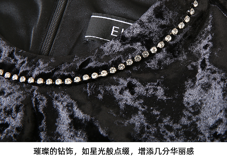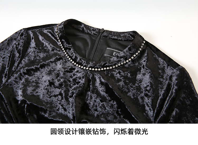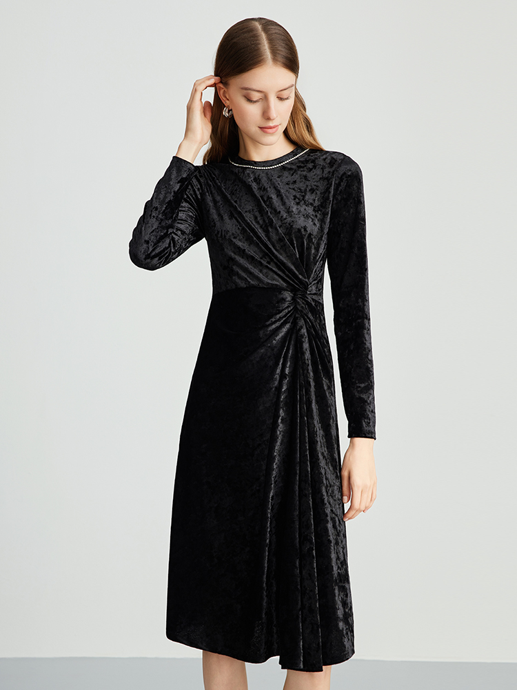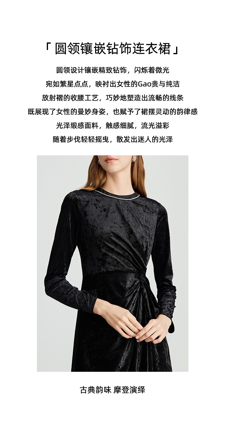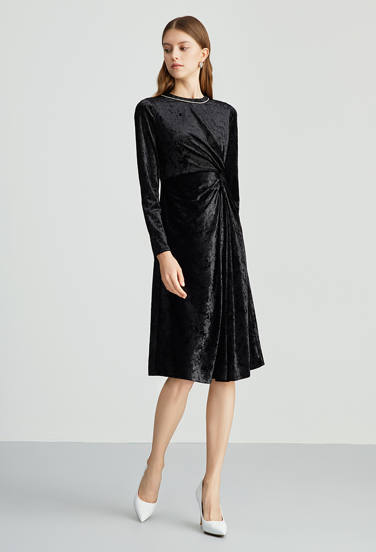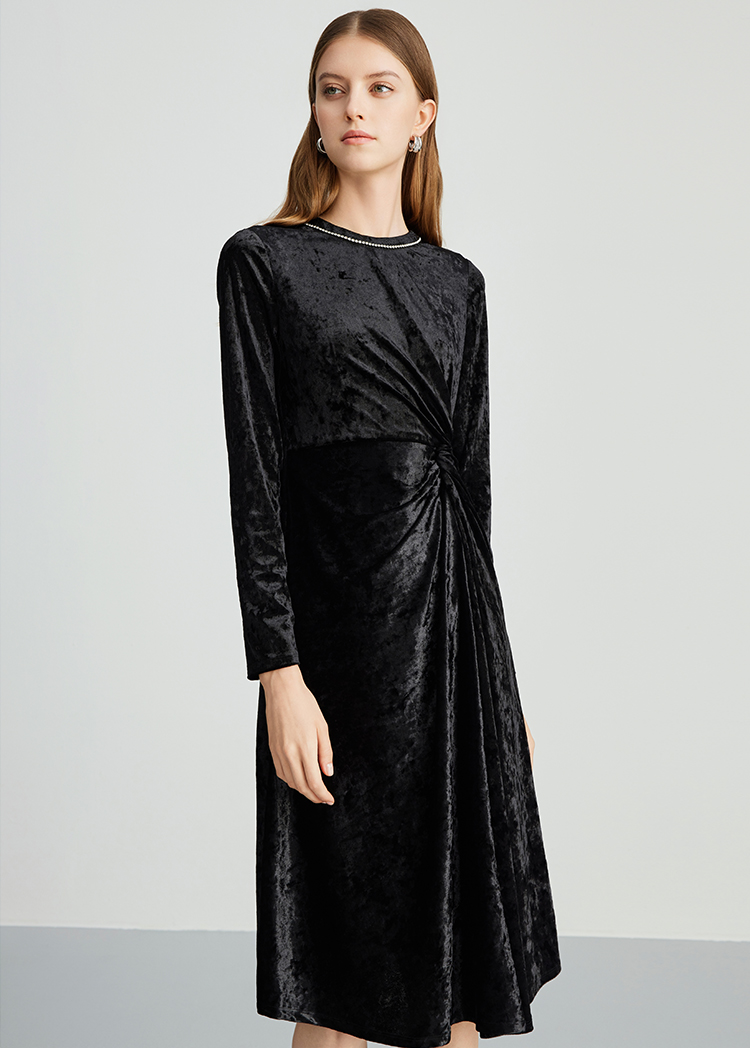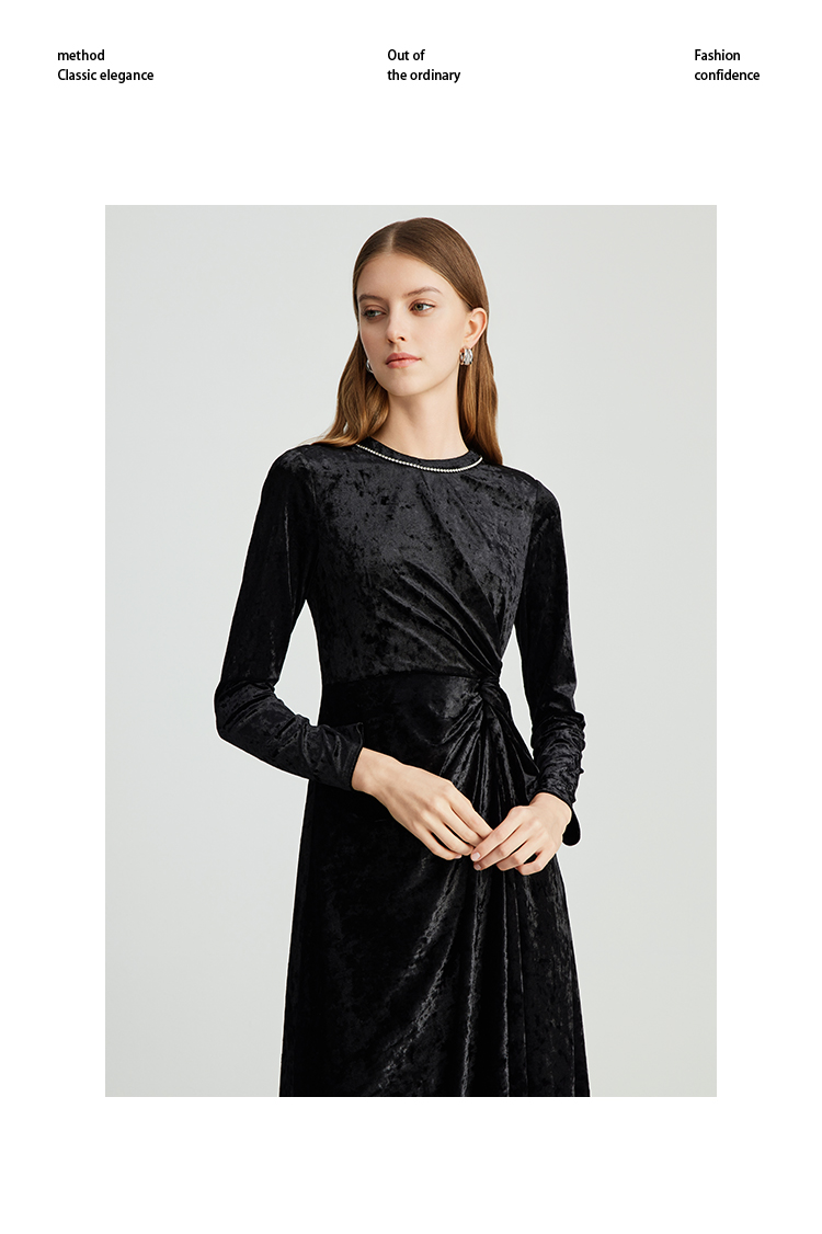 EITIE爱特爱优雅法式复古丝绒暗纹收腰黑色连衣裙秋季新款C2407402(轻微浮色 ,不要跟浅色系衣服一起穿/洗)