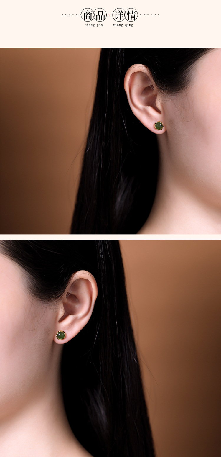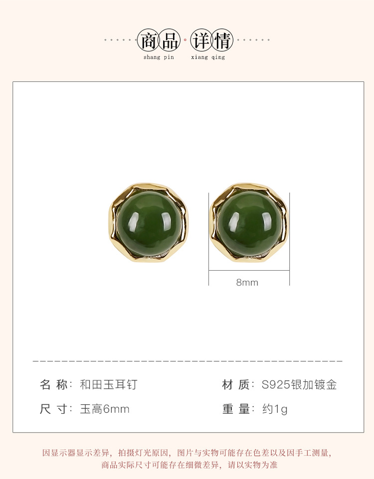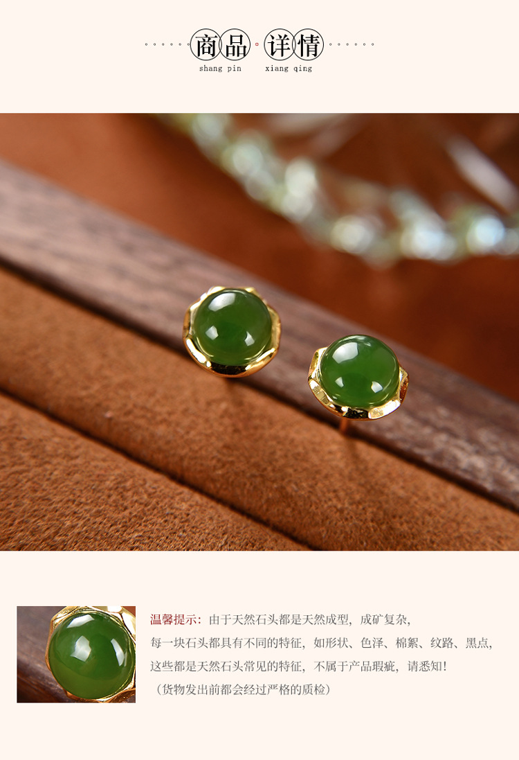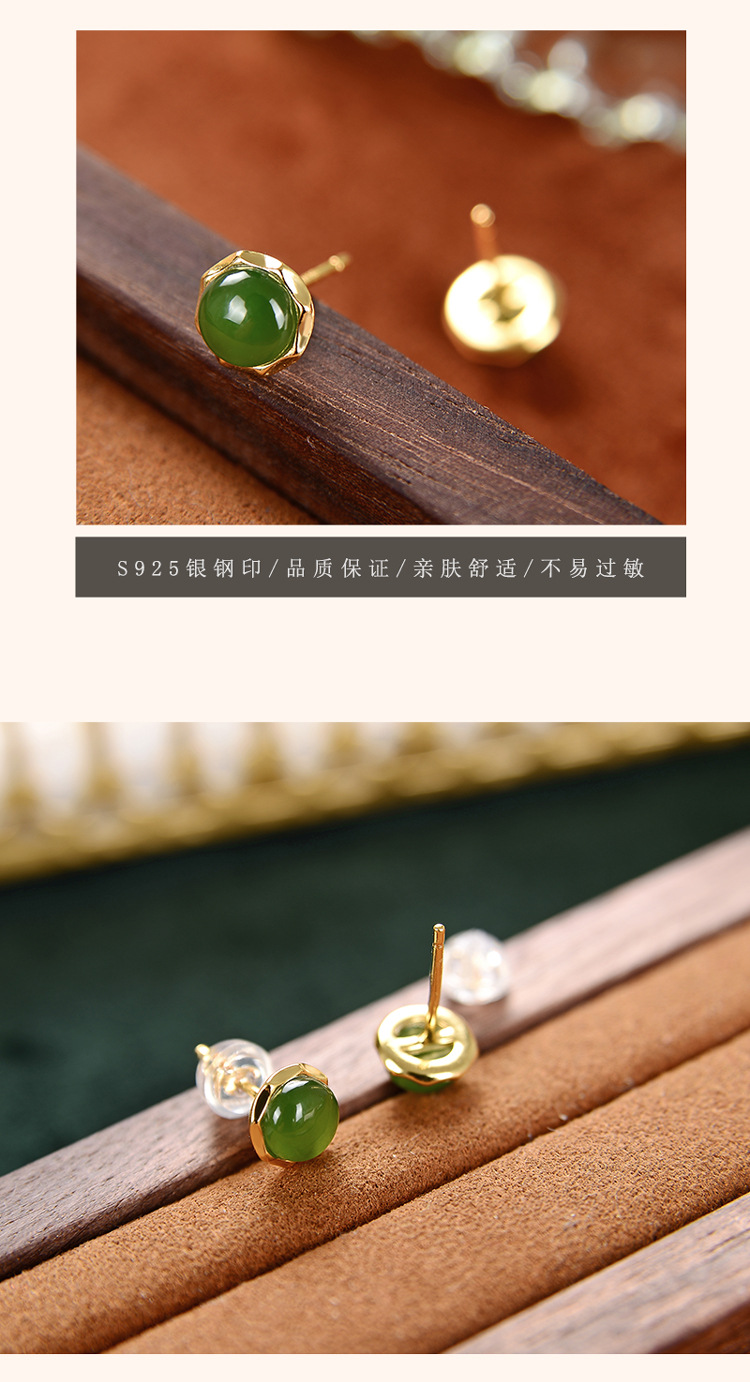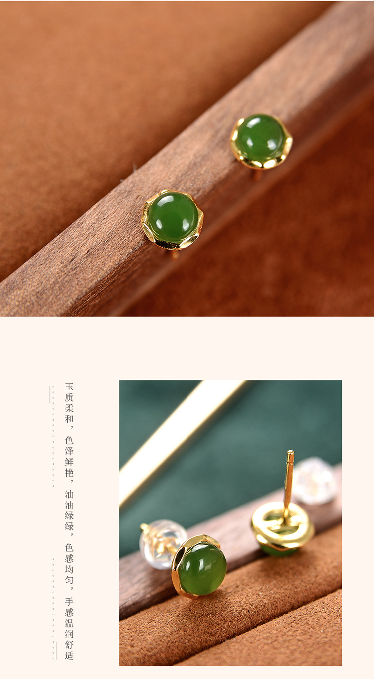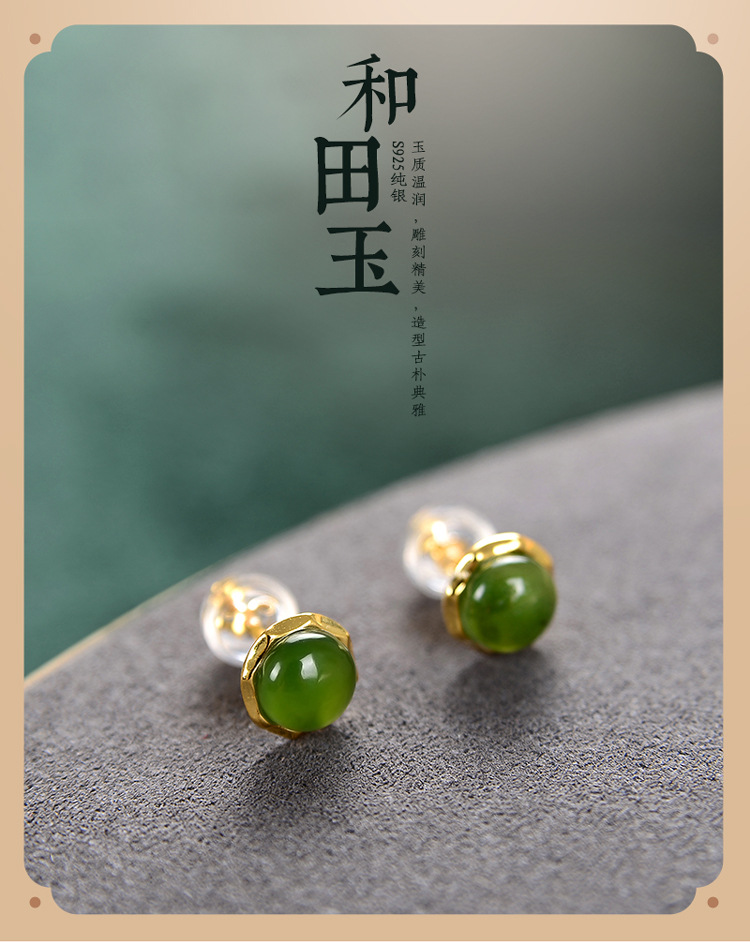 S925纯银镀金,和田玉碧玉圆珠复古个性简约气质耳钉CW-157