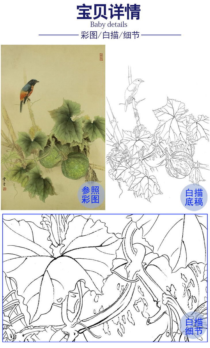 龚雪青竖幅工笔花鸟白描底稿-瓜园-南瓜小鸟-多种白描尺寸可选-XQ28