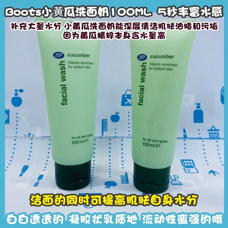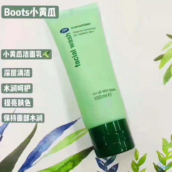 Boots小黃瓜洗面奶100ML 👍5秒丰富水感,补充大量水分💦!小黄瓜洗面奶能深层清洁肌肤油脂和污垢♻,因为黄瓜精粹本身含水量高,所以洁面的同时可提高肌肤自身水分😇,还能起到收敛的功效哦!且内含有自然亮白精华✨,能有效去除脸部的不均肤色,去黄气,有效的净化你的肤色✔,让它不仅是水水的,还是白白透透的!凝胶状乳质地,流动性蛮强的哦👏。