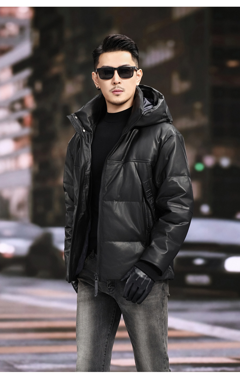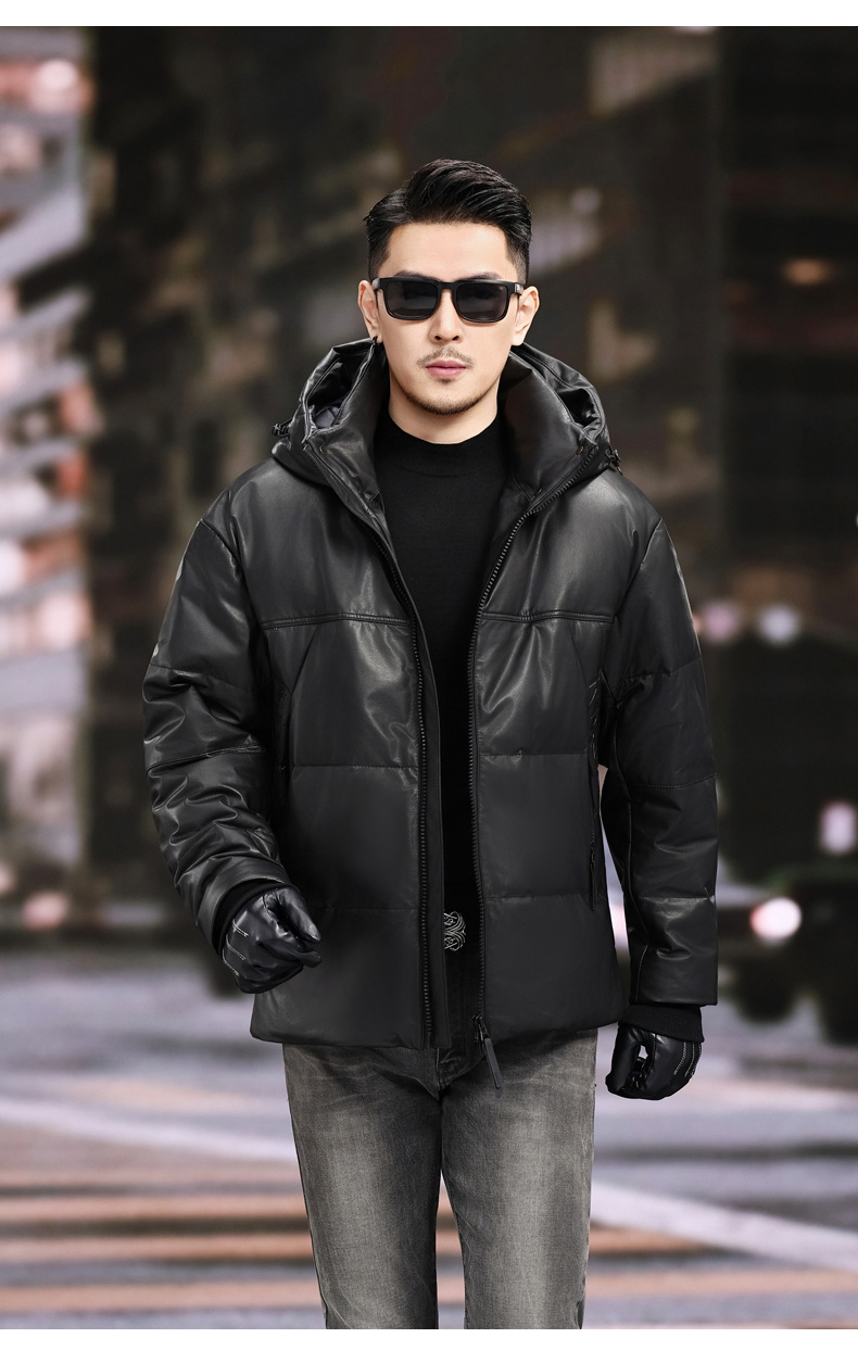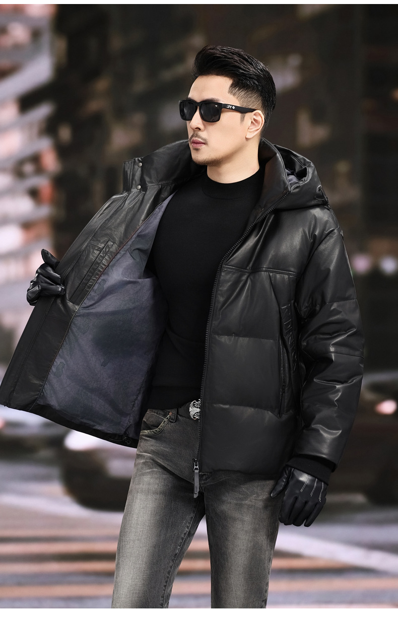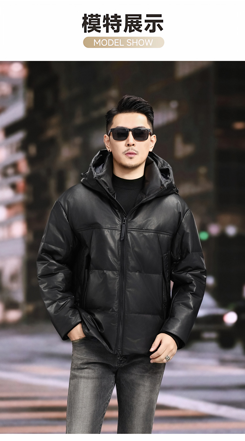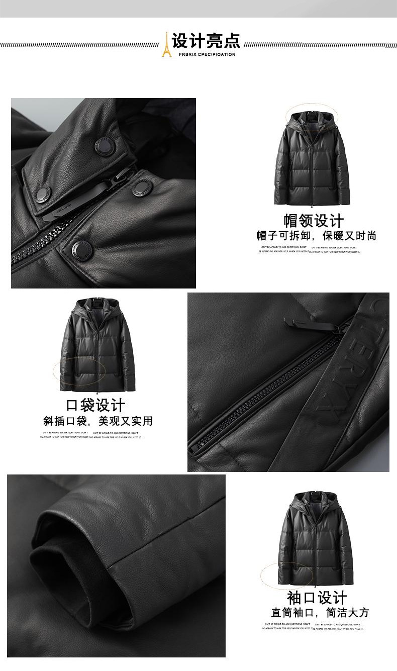 丁摩 海宁真皮皮衣男士牛皮羽绒服可脱卸连帽白鹅绒保暖外套6815