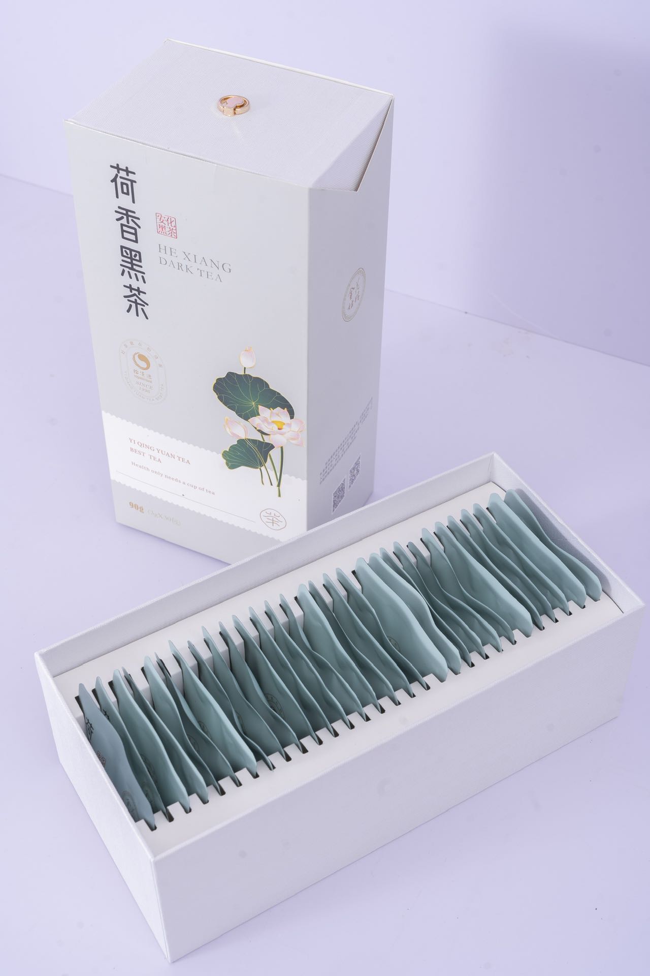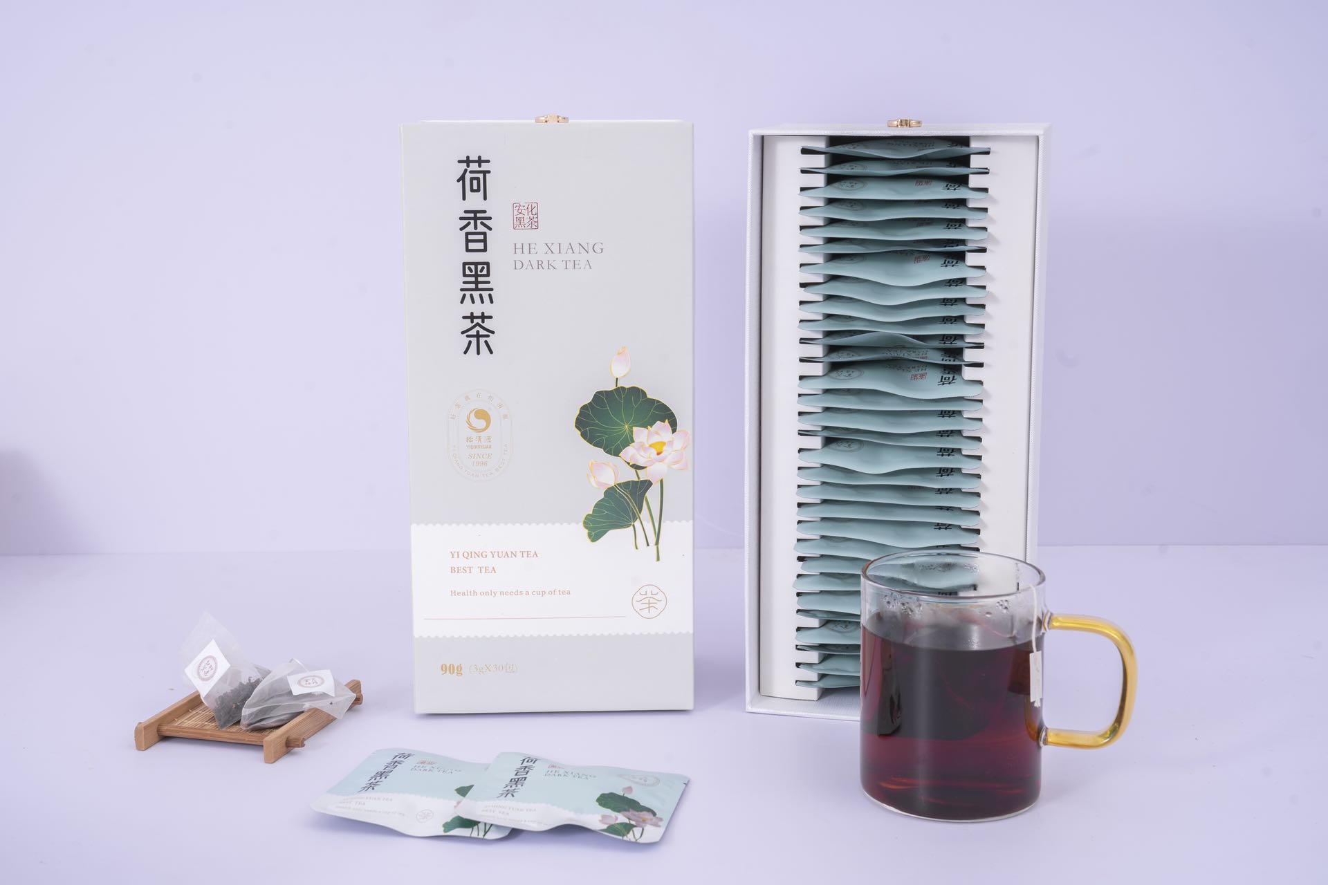 玫瑰黑茶、陈皮黑茶、荷香黑茶、原味黑茶;一箱16盒,有双盒装和单盒装。