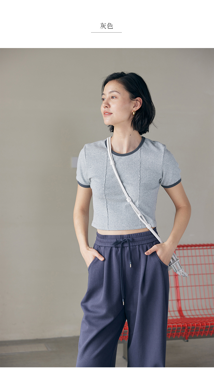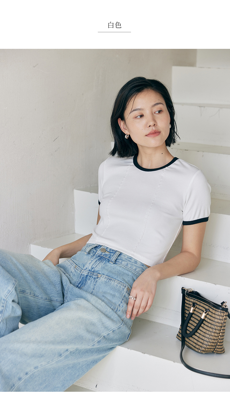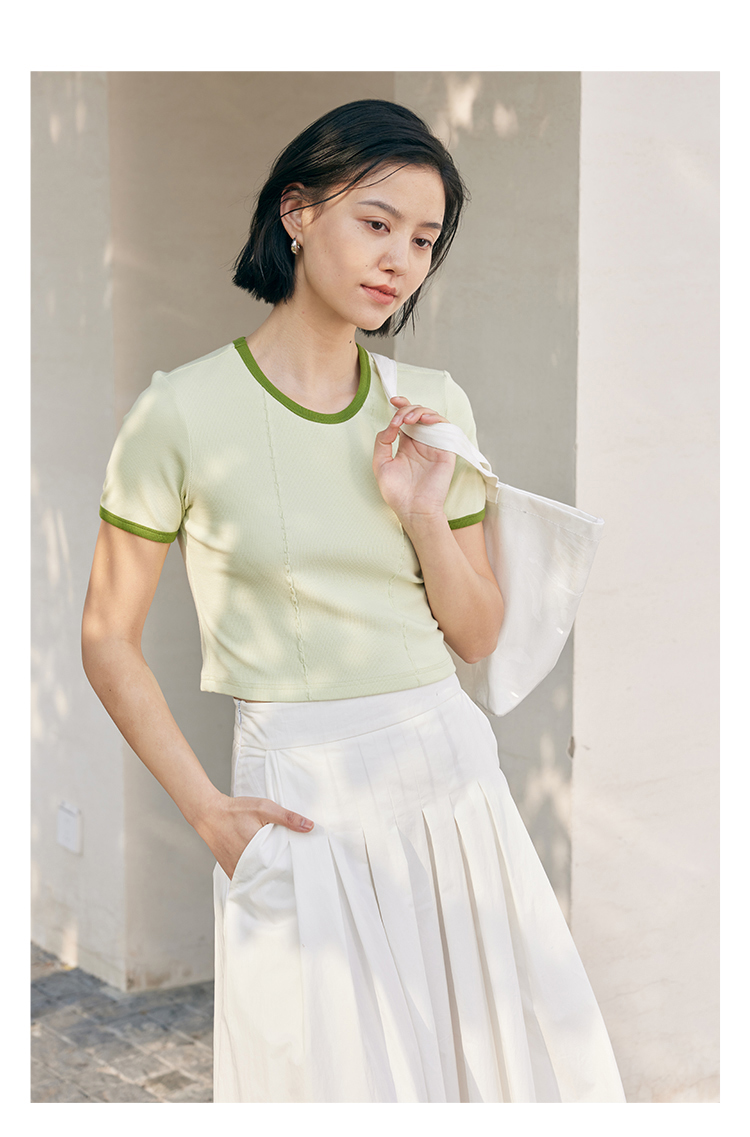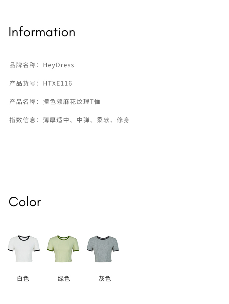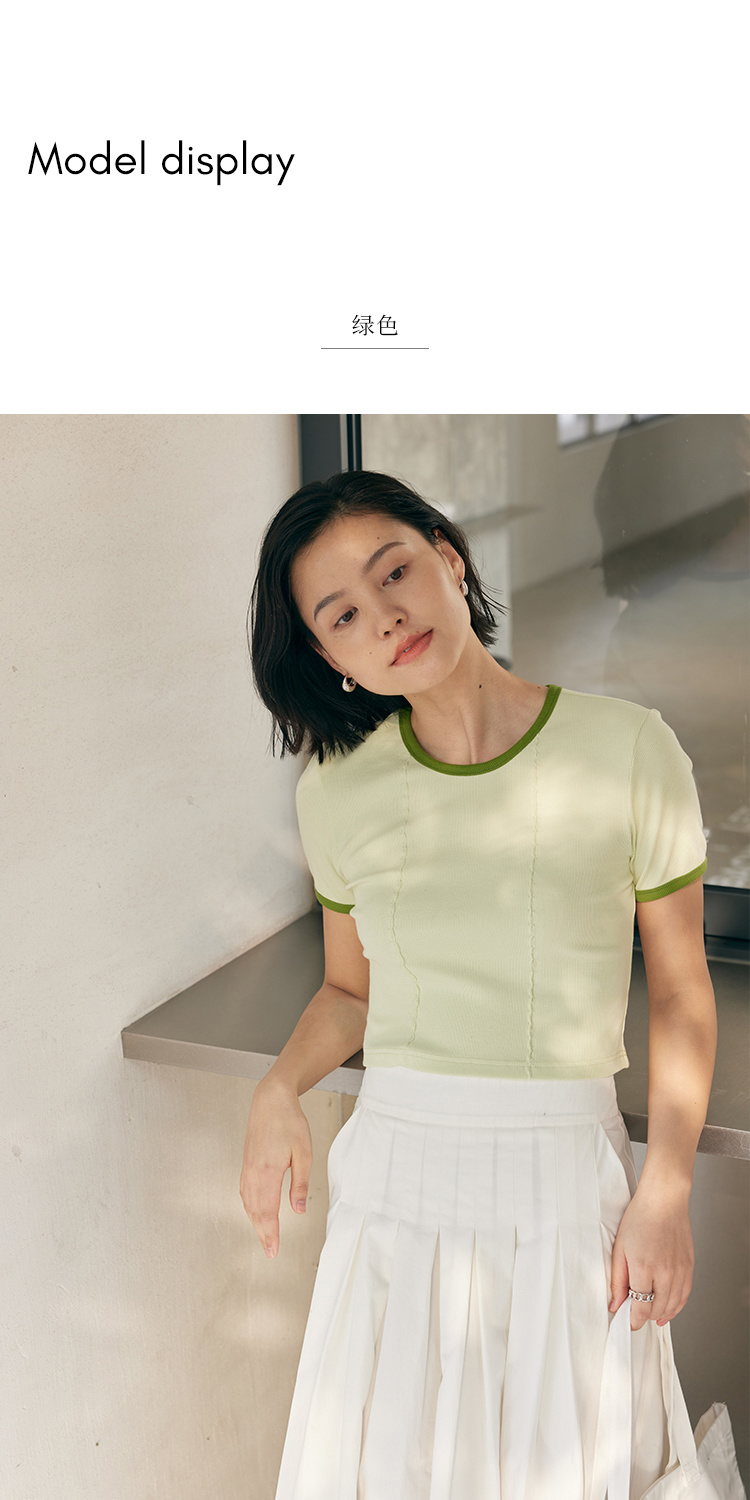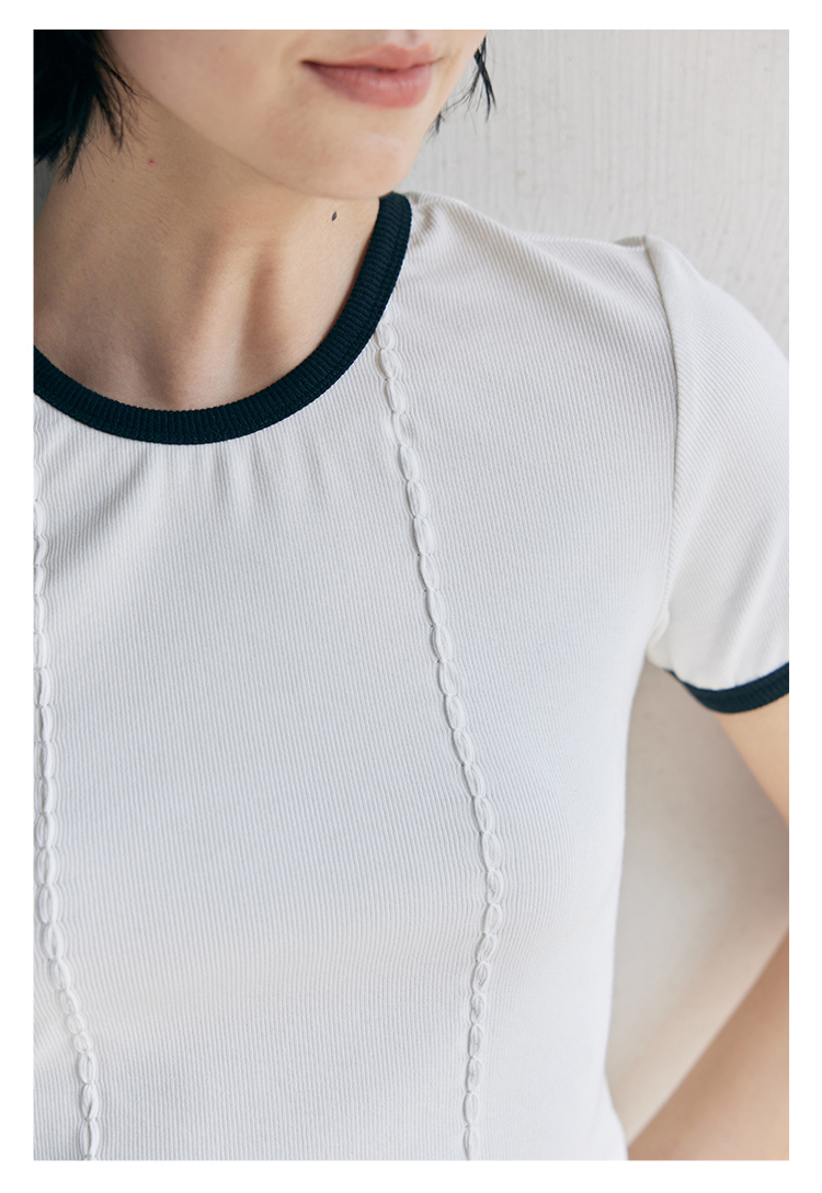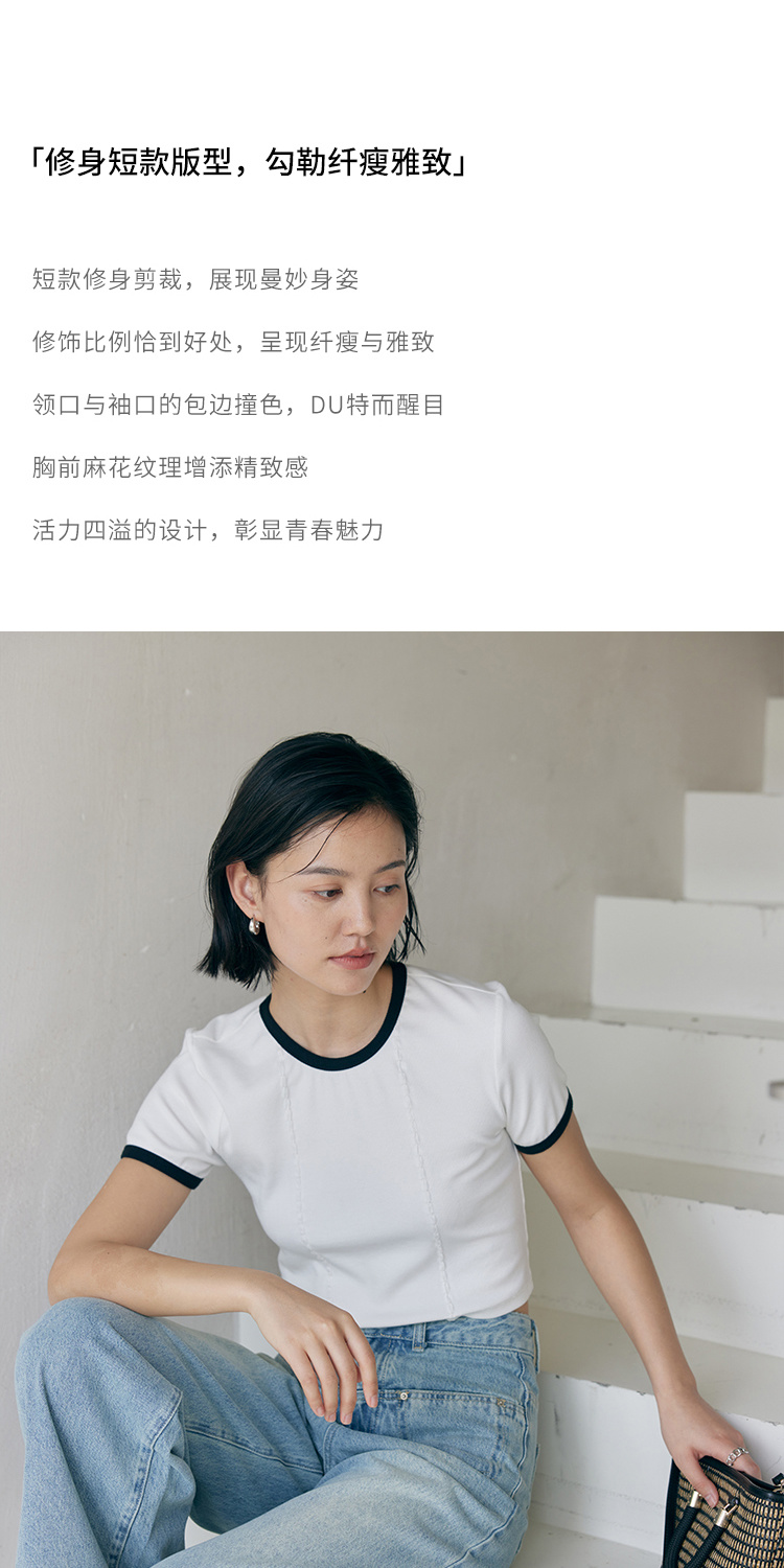 HeyDress撞色t恤女夏季圆领修身短款半袖麻花肌理设计感短袖上衣