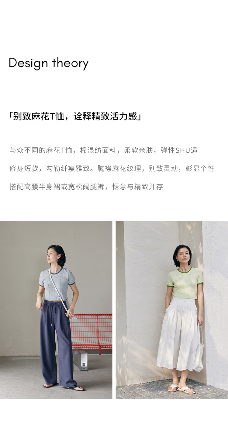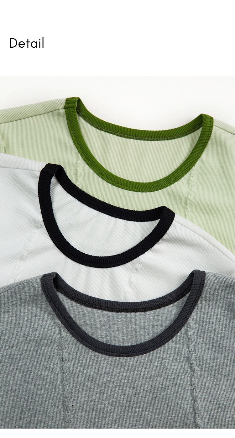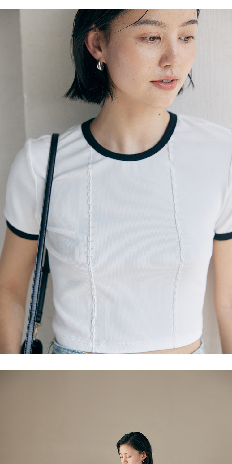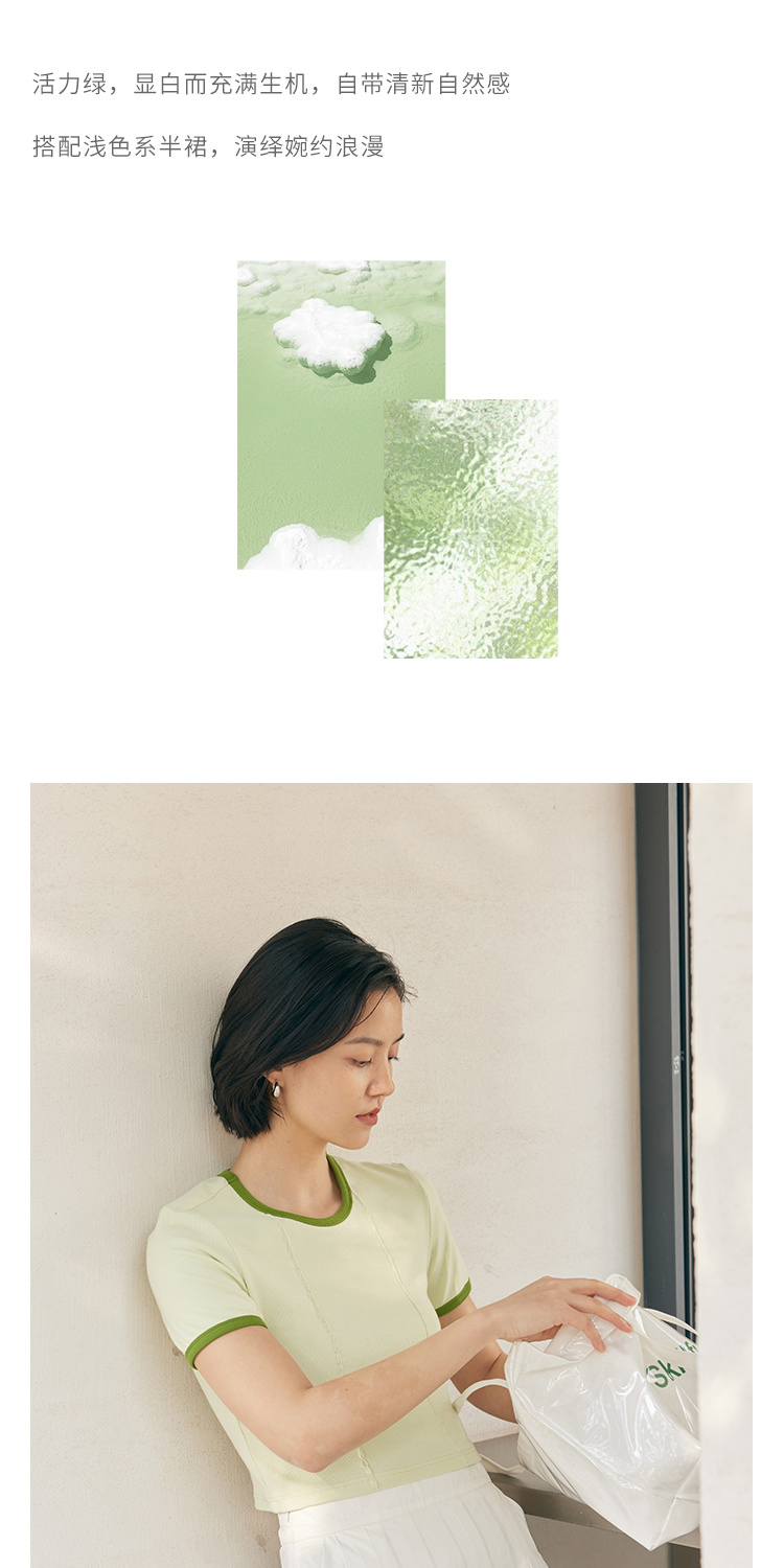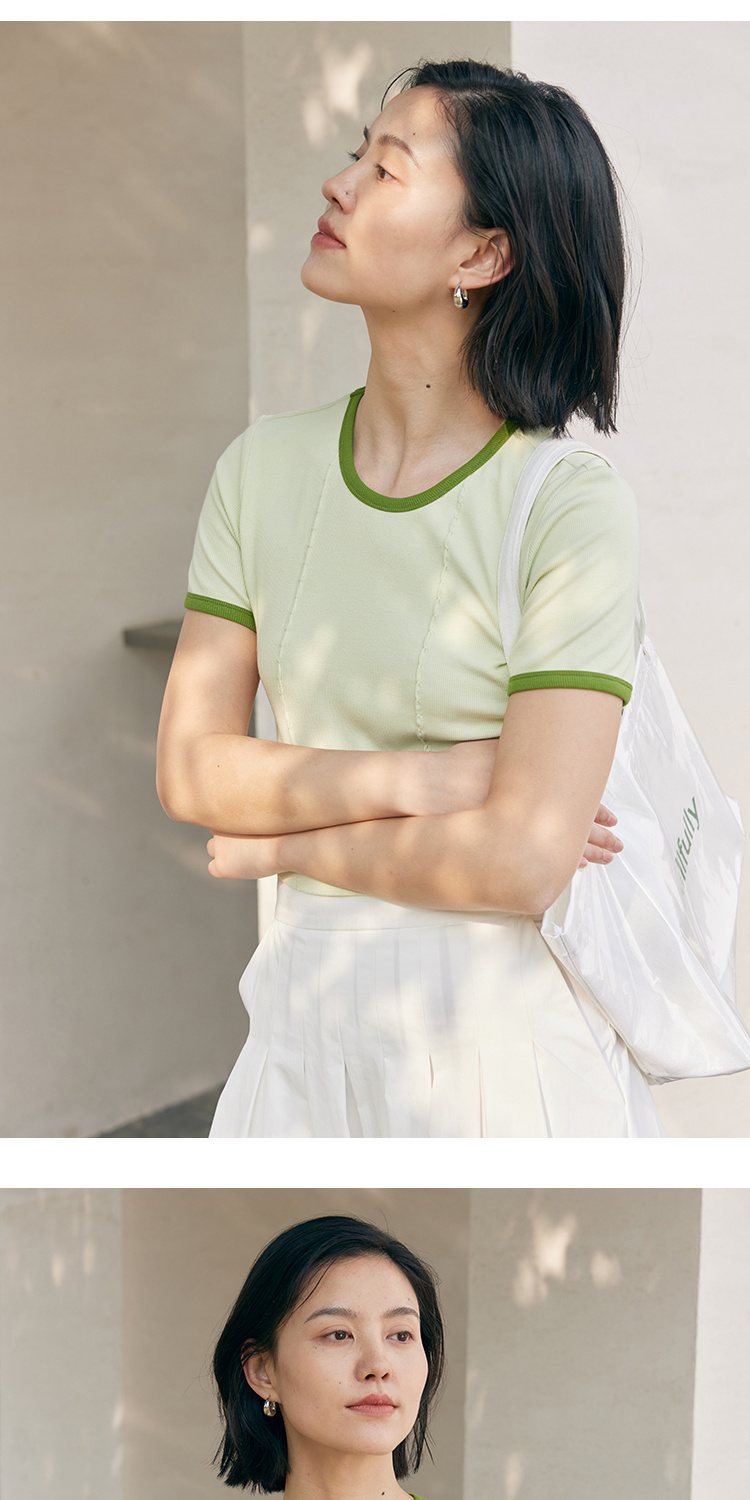 HeyDress撞色t恤女夏季圆领修身短款半袖麻花肌理设计感短袖上衣