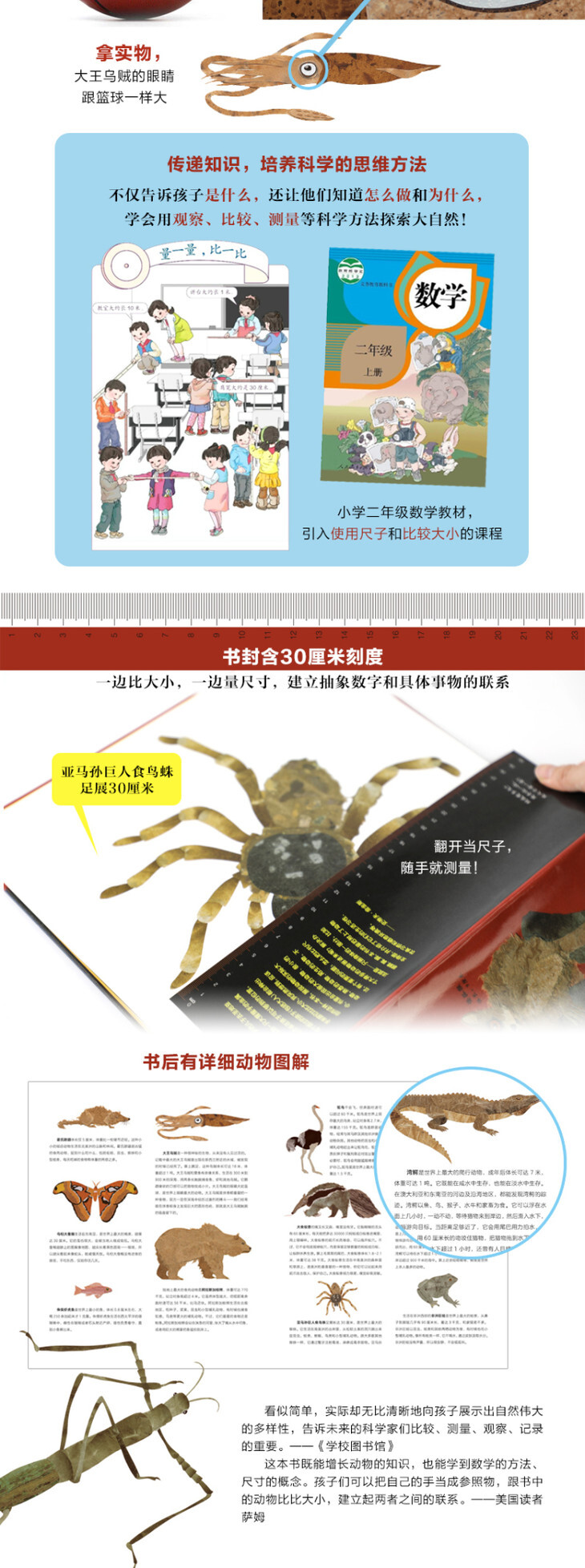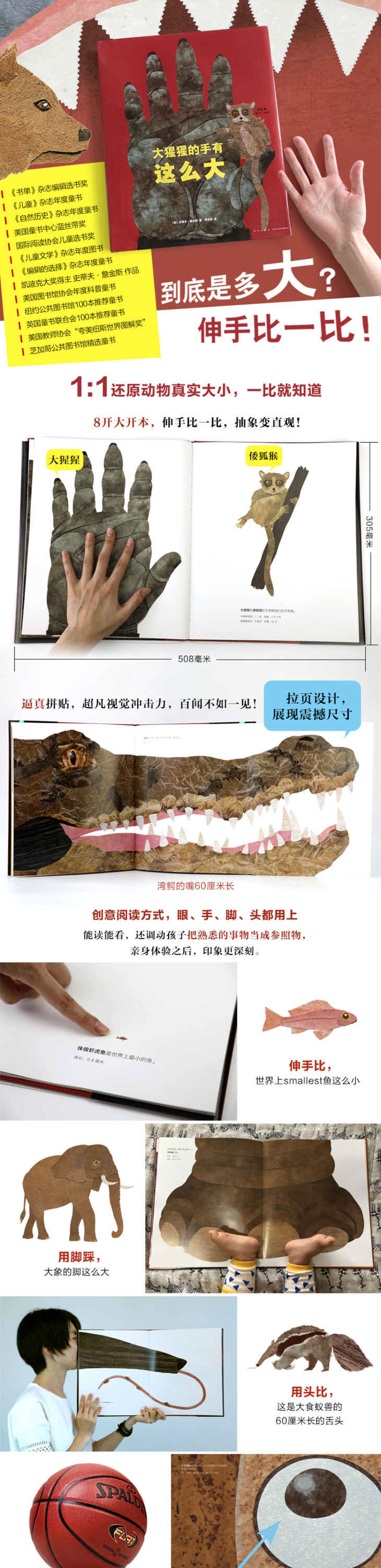 你能不能想象出,鳄鱼有多大?大象有多大?世界上*小的鱼什么样?世界上*长的昆虫什么样?你见过60厘米长的舌头,比你头还大的眼睛吗?有时候,文字和数字并不能反映事物的全部,眼见才能为实。于是,史蒂夫·詹金斯就按照1:1的比例,将大大小小奇妙物种的真实大小呈现在画面中,有的大到只能放下局部,有的小到几乎看不见,形成强烈反差,极具视觉冲击力。当读者用自己的手、脸等参照物,跟这些动物的实际尺寸比一比,会发现——哇,原来它是这么大!