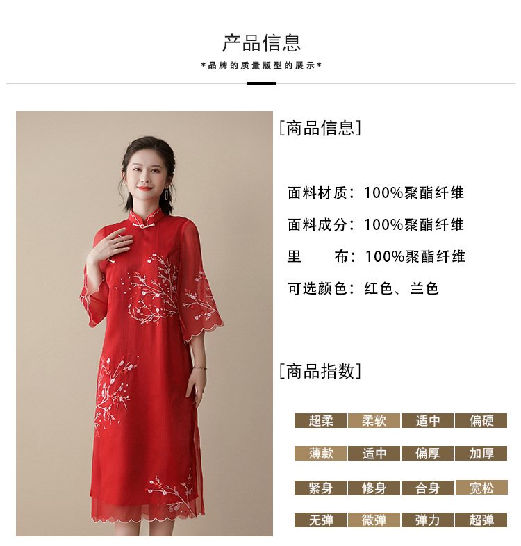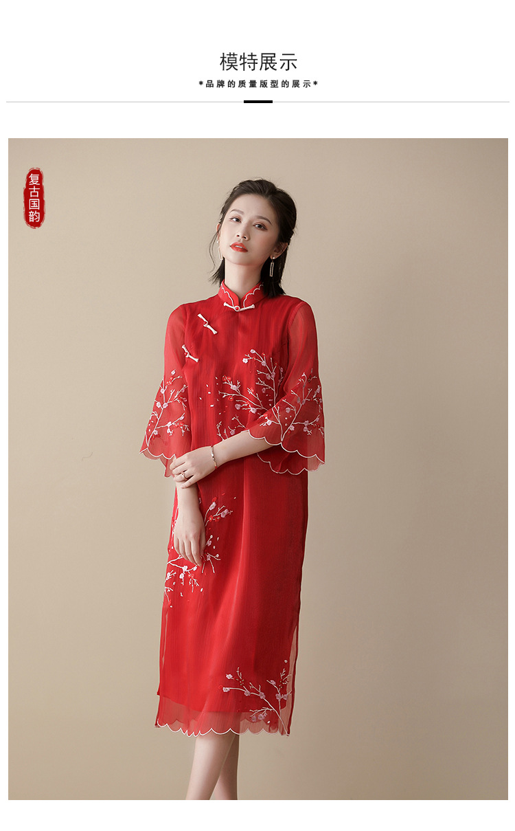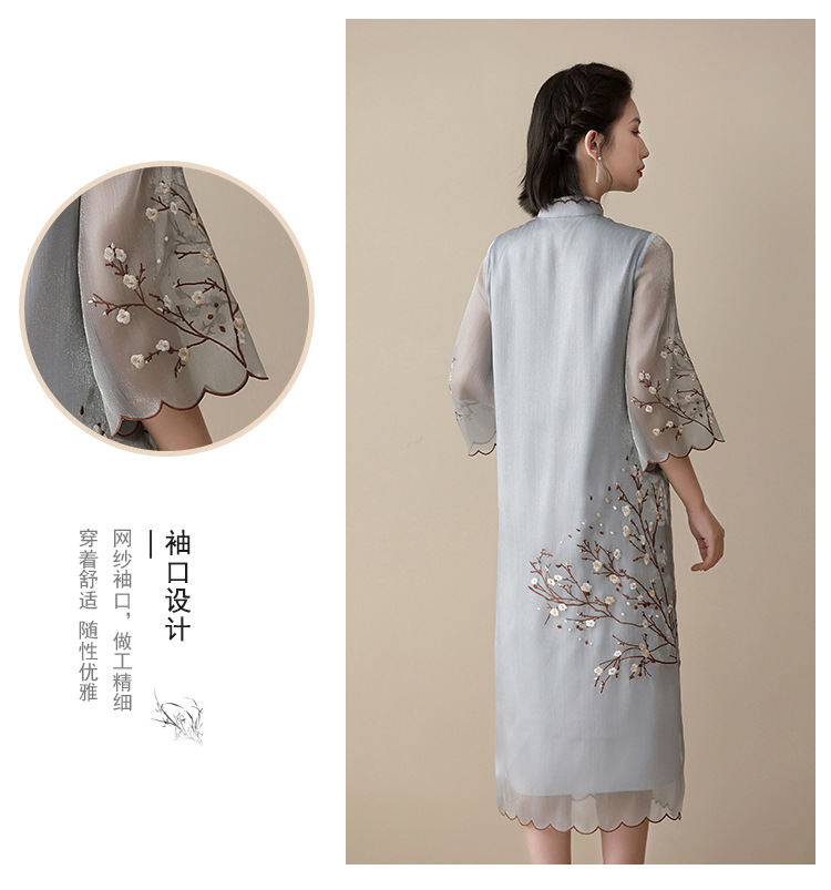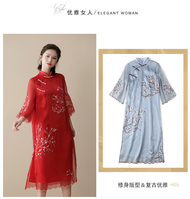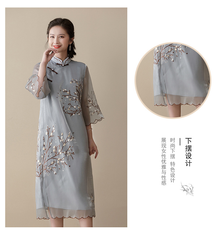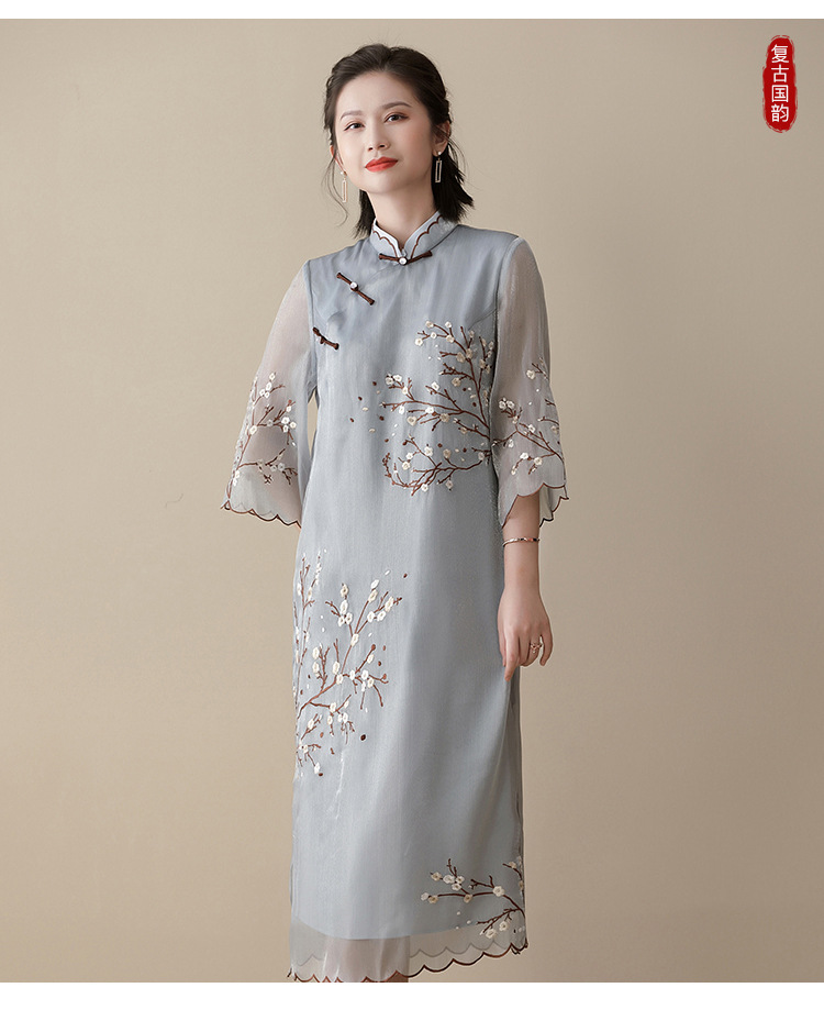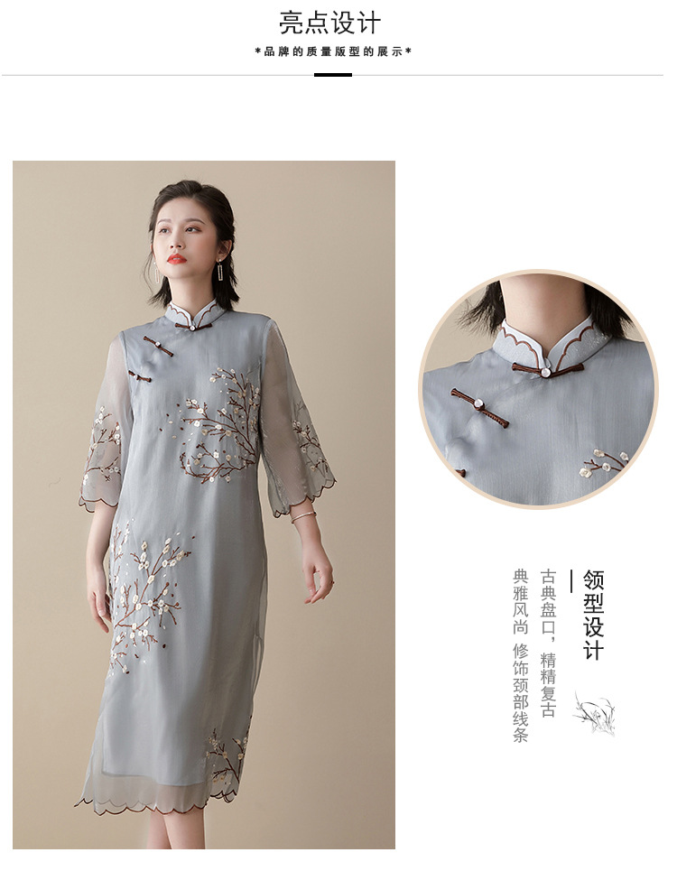 上海旗袍厂AYK-QF-210122亮丝刺绣宽松改良旗袍复古长款立领七分袖连衣裙