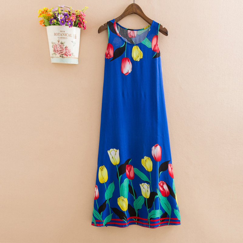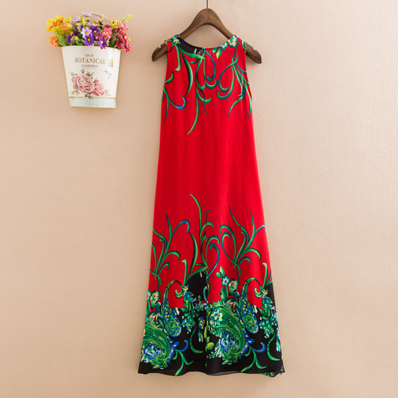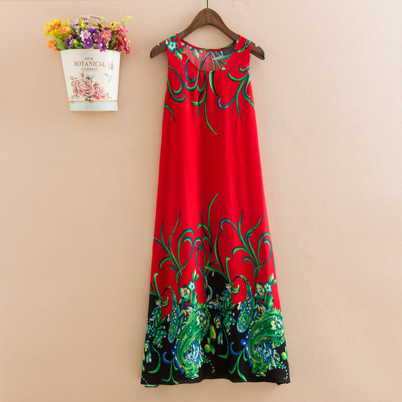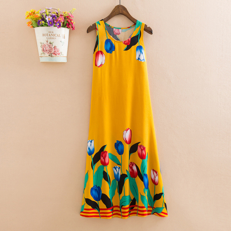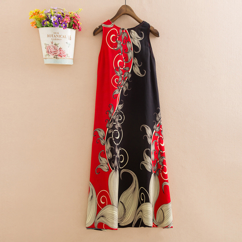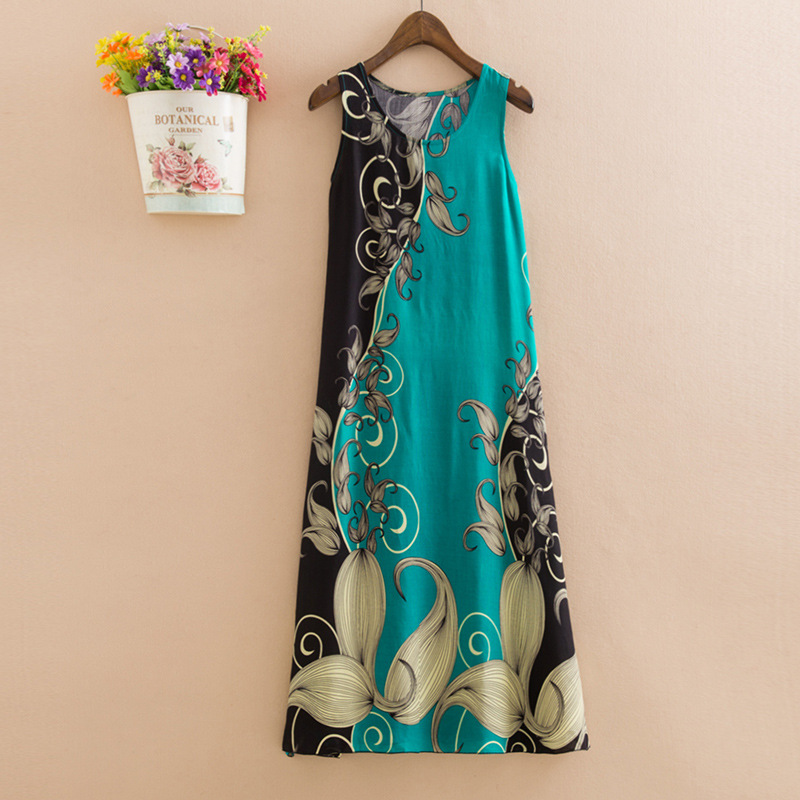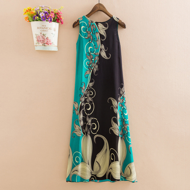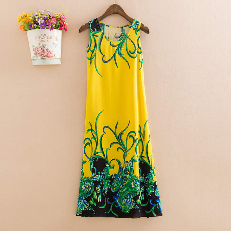 YDGJ新品大码民族风长款过膝棉绸连衣裙印花沙滩长裙百搭无袖裙WY