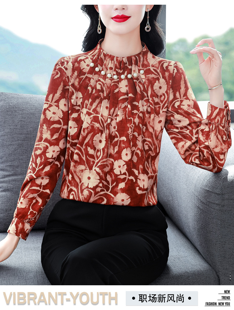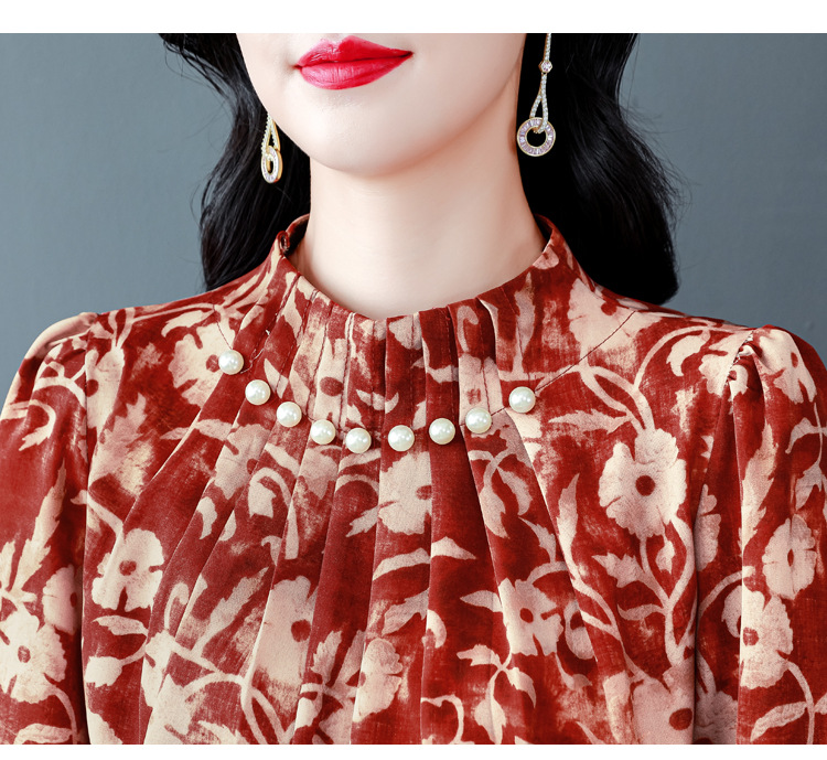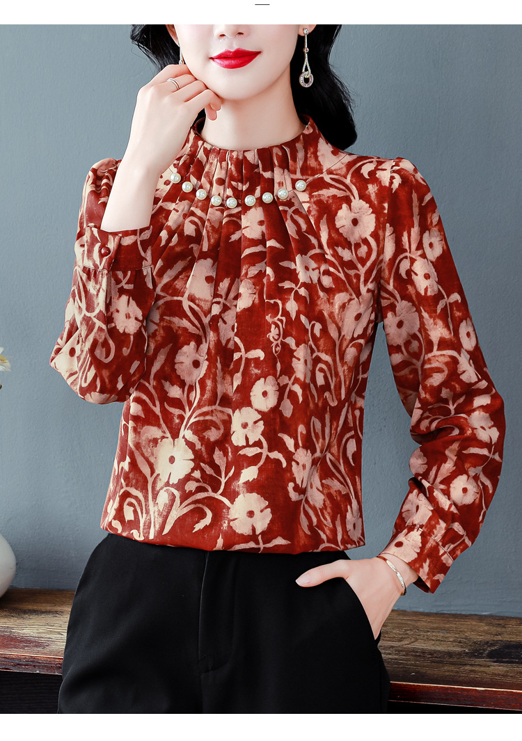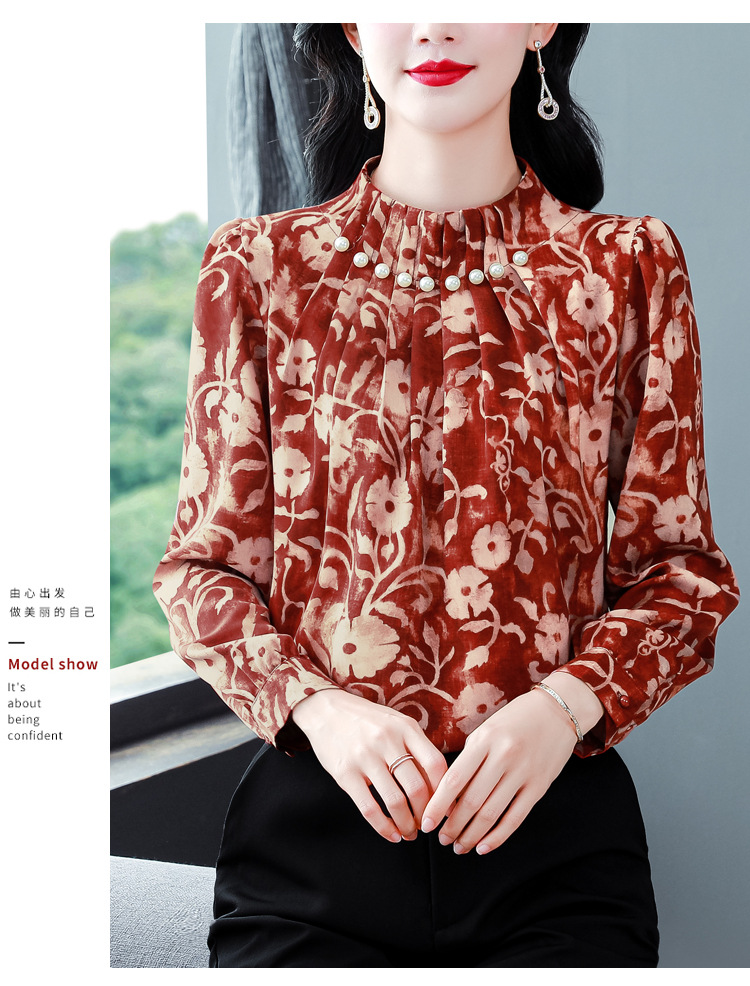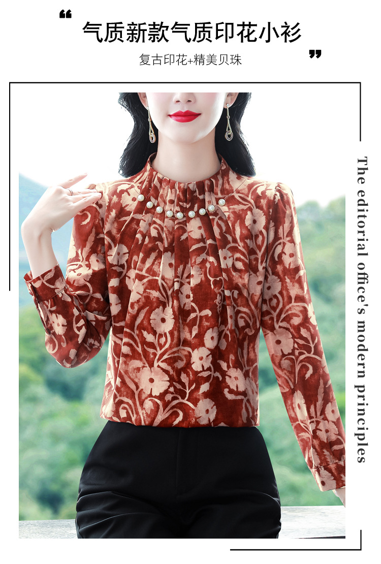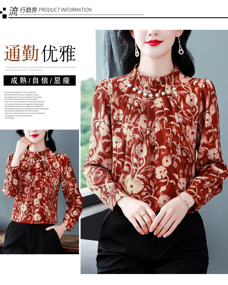KQL 369H9978缎面立领钉珠印花长袖雪纺衬衫洋气衬衣