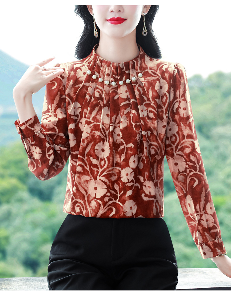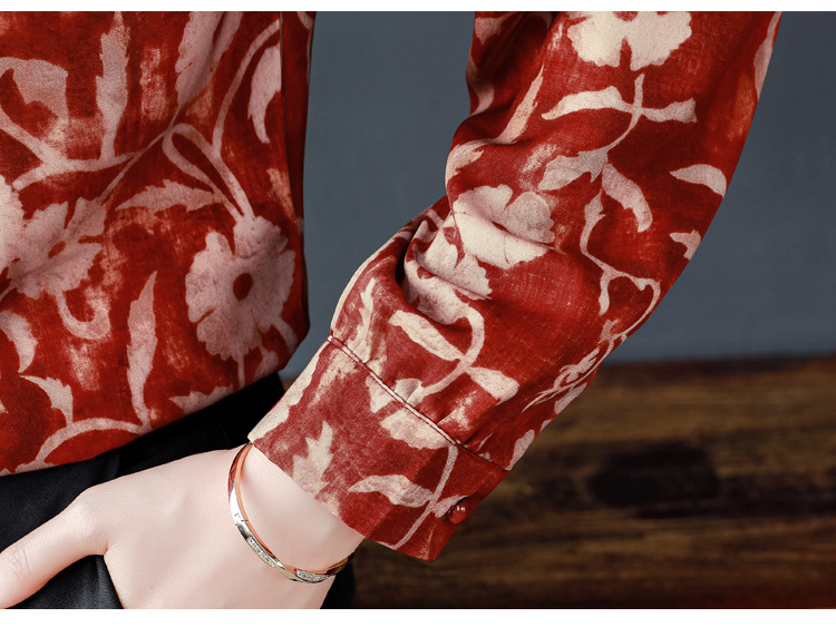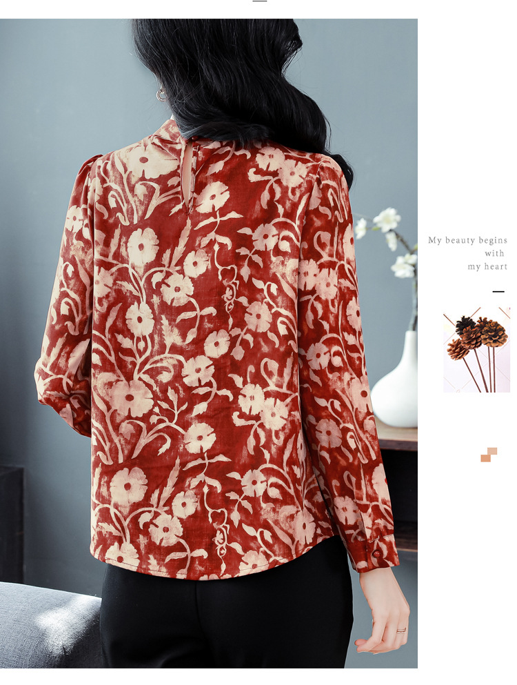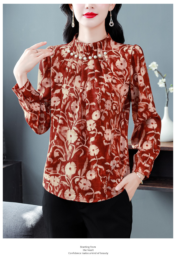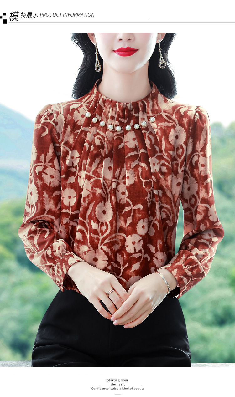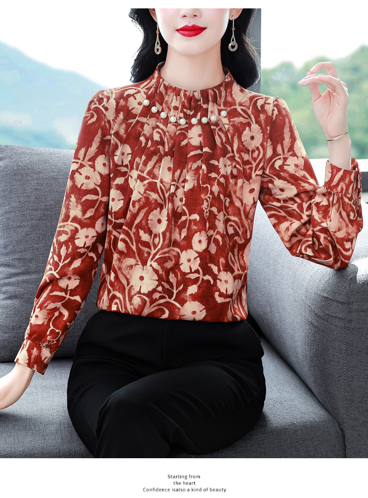 KQL 369H9978缎面立领钉珠印花长袖雪纺衬衫洋气衬衣