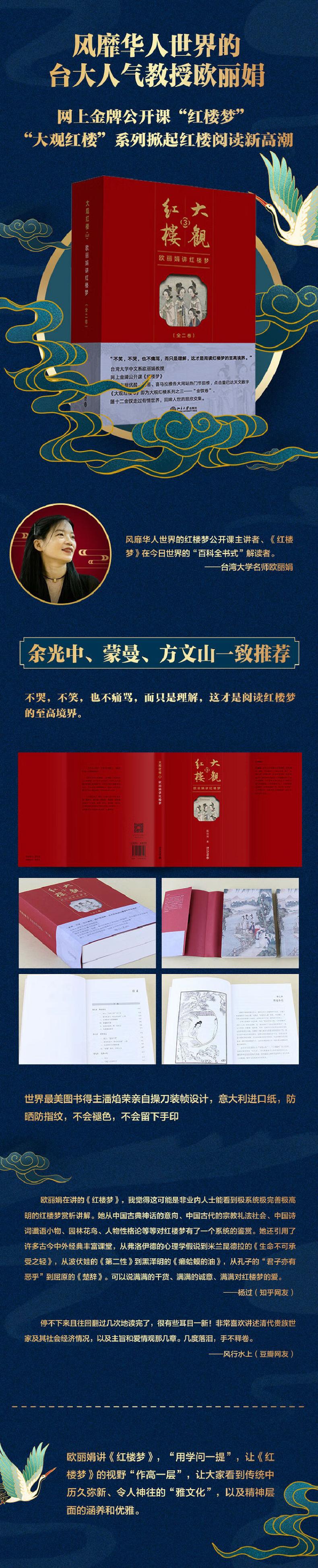 欧丽娟,台湾大学中国文学系教授,研究领域:唐诗、《红楼梦》、中国文学史。除了“大观红楼”系列之外,代表作还包括《杜诗意象论》《唐诗的乐园意识》《李商隐诗歌》《诗论红楼梦》《红楼梦人物立体论》《唐代诗歌与性别研究——以杜甫为中心》《唐诗的多维视野》《唐诗新思路》等,因台大“红楼梦”公开课获得“全球开放式课程联盟”2015年杰出教学者奖。- 中信书店 (微信公众号认证)