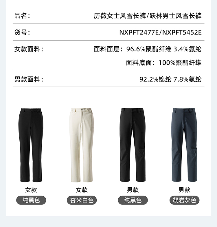 诺诗兰 情侣户外软壳裤 历薇女式&跃林男式风雪长裤 NXPFT2477E/NXPFT5452E