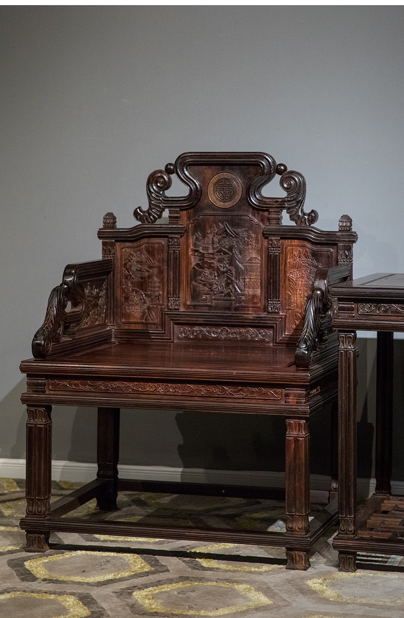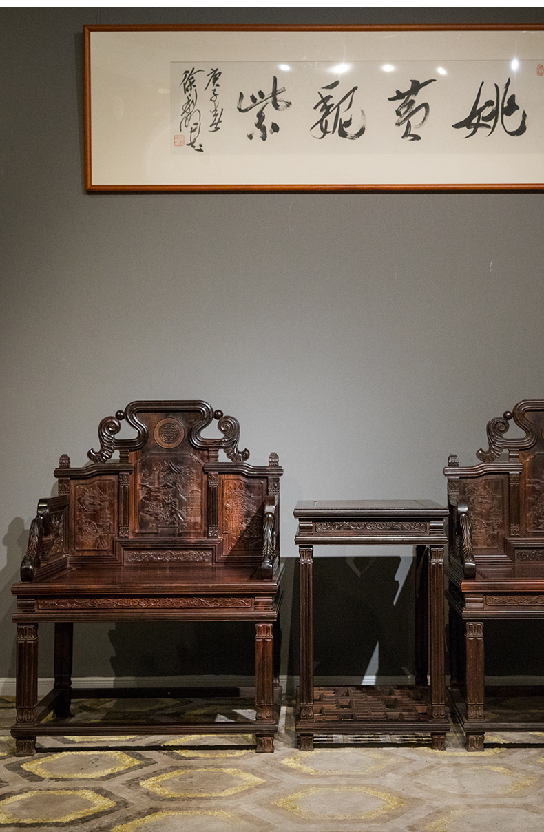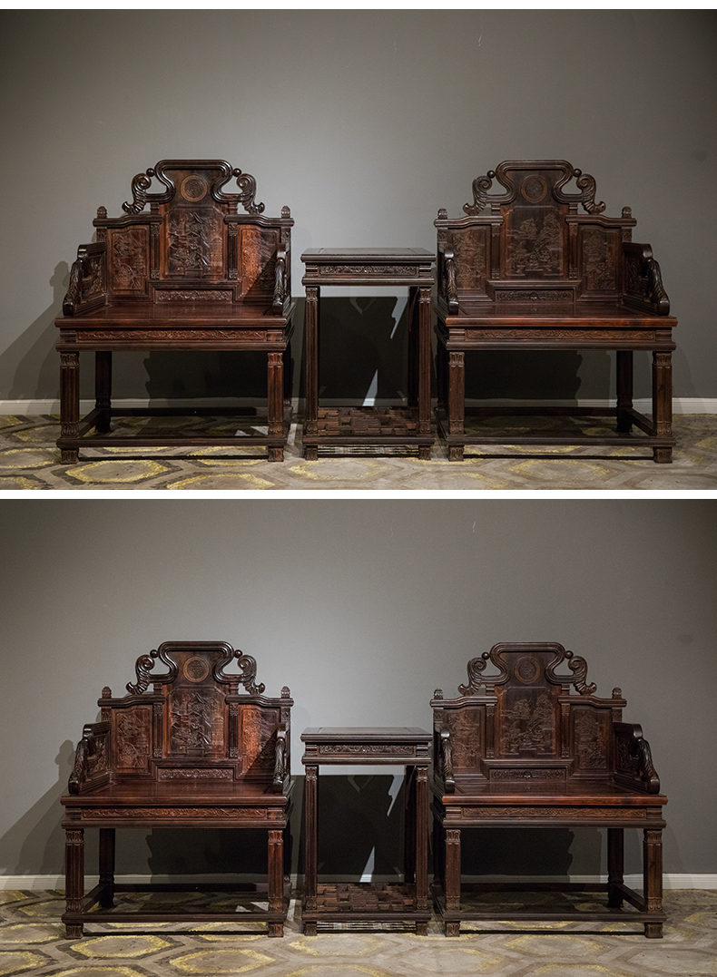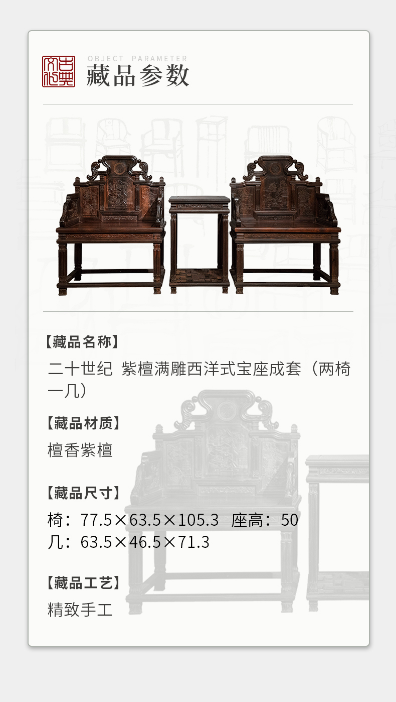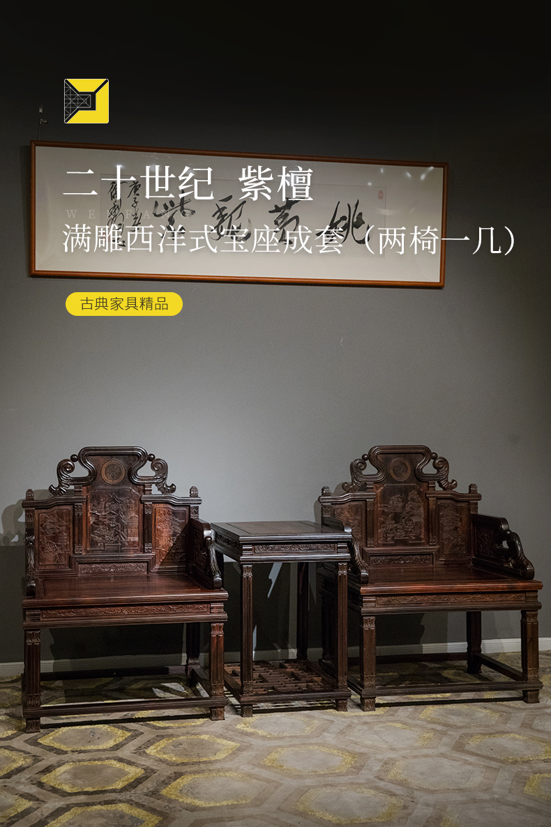 二十世纪 紫檀满雕西洋式宝座成套(两椅一几)