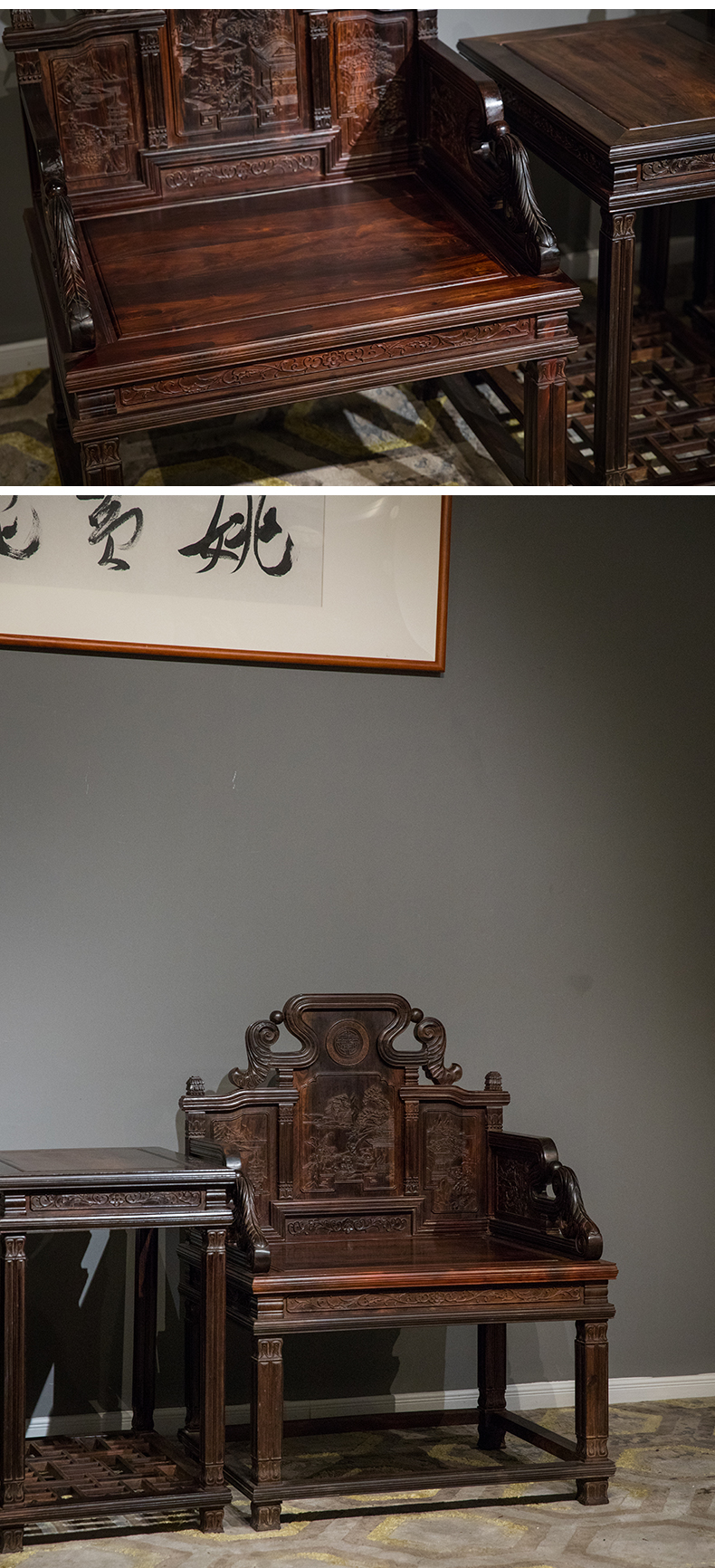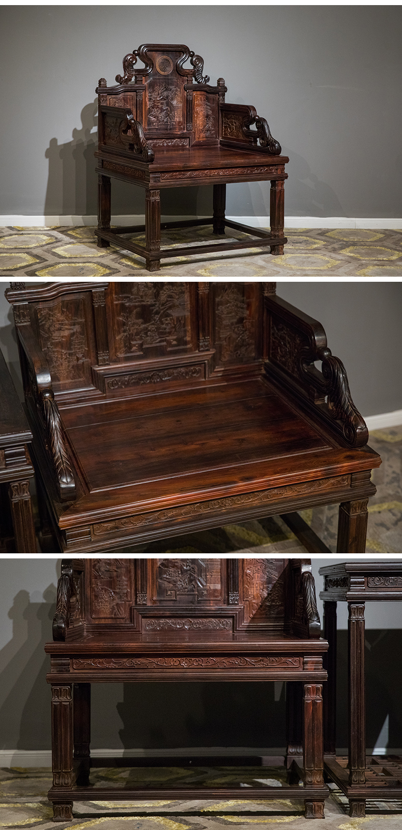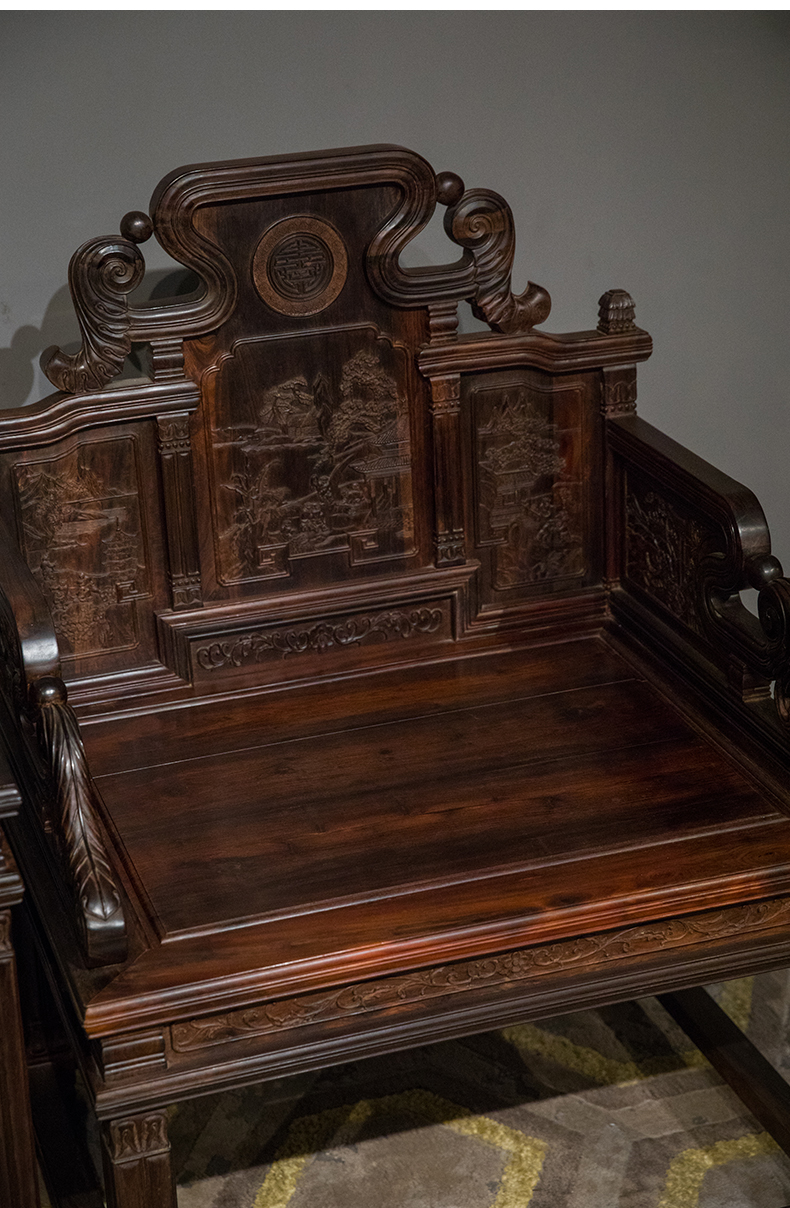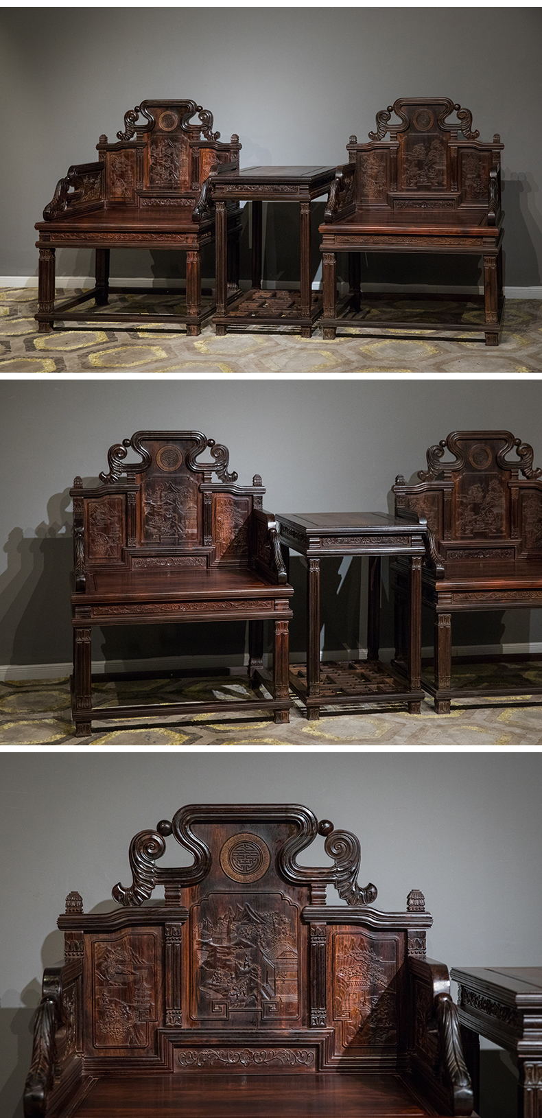 二十世纪 紫檀满雕西洋式宝座成套(两椅一几)