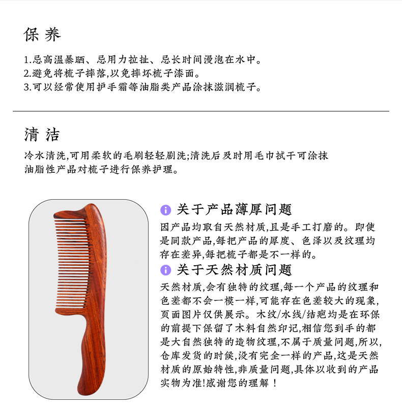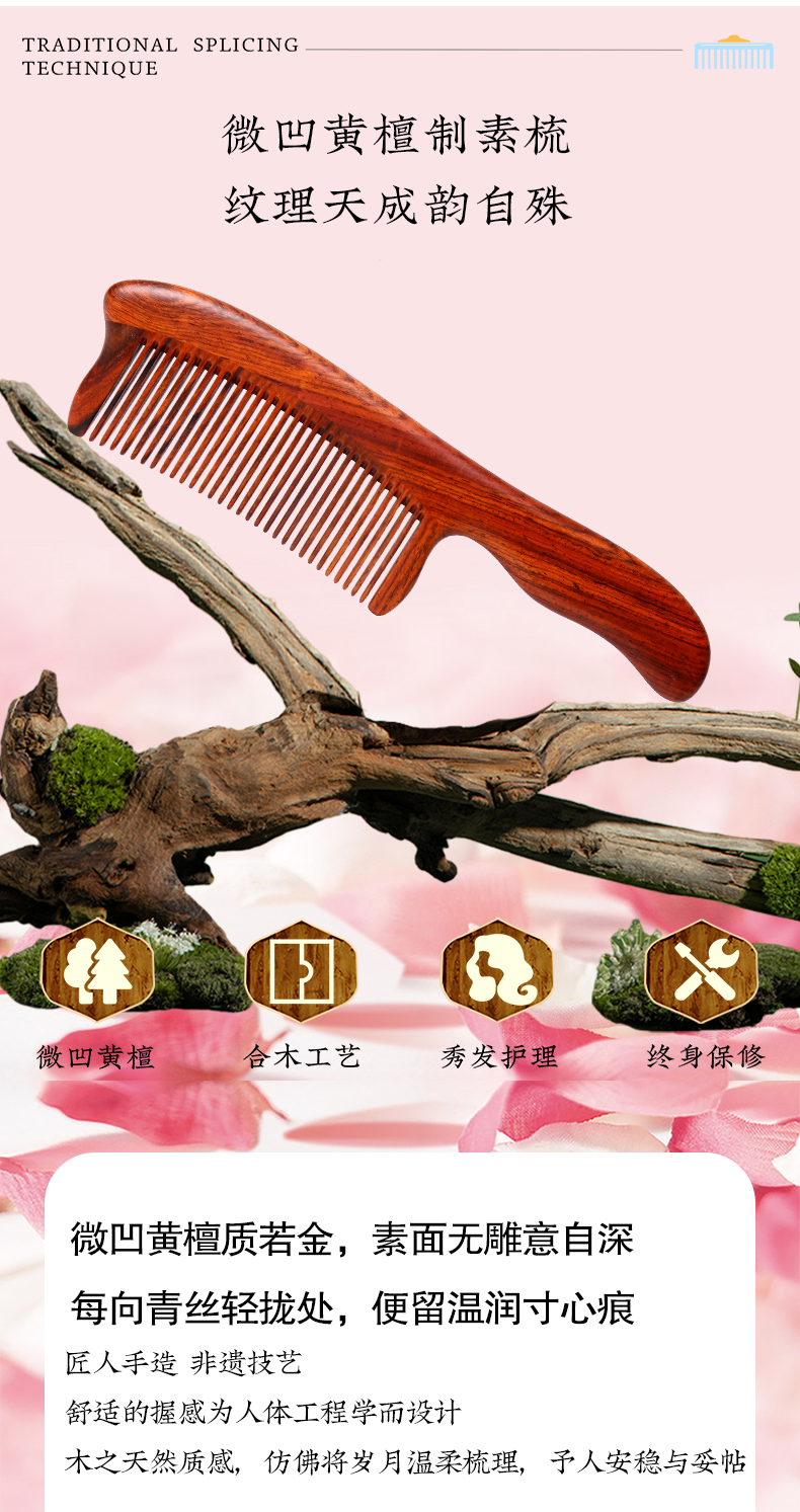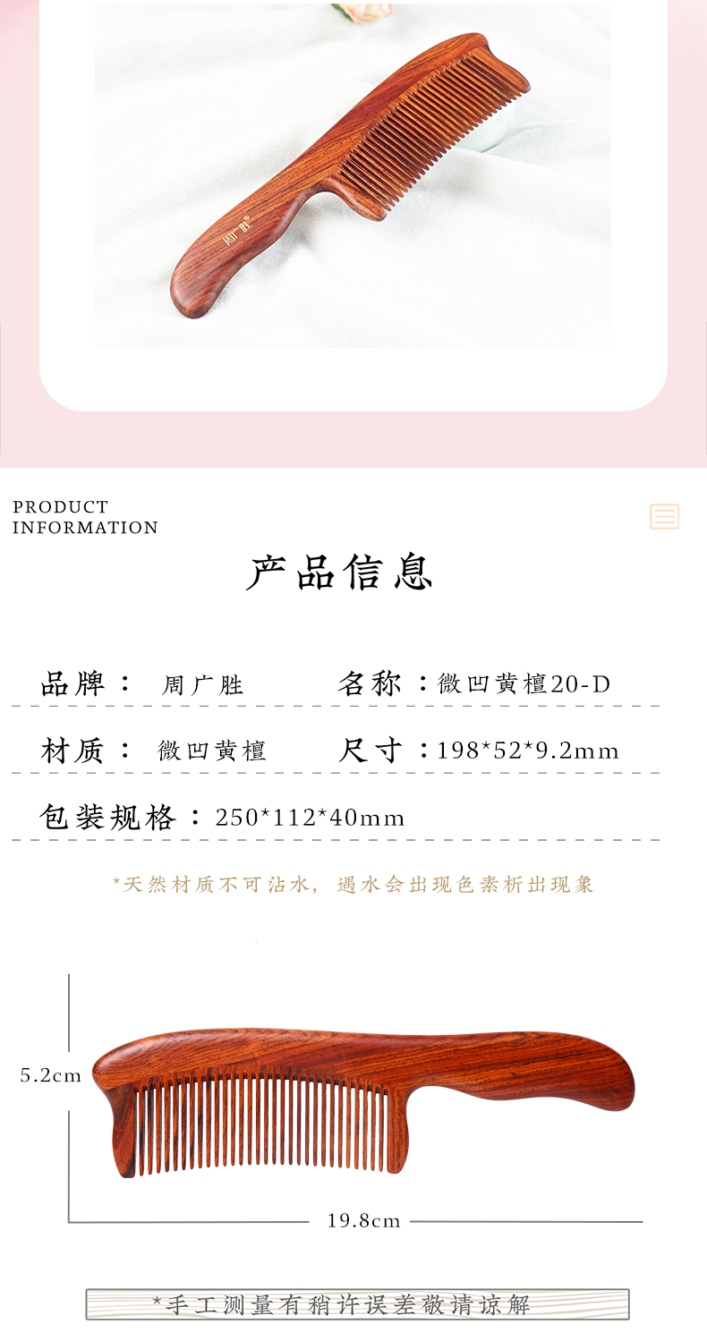 周广胜正品微凹黄檀合木梳子防静电护发男女通用家用美发顺发梳