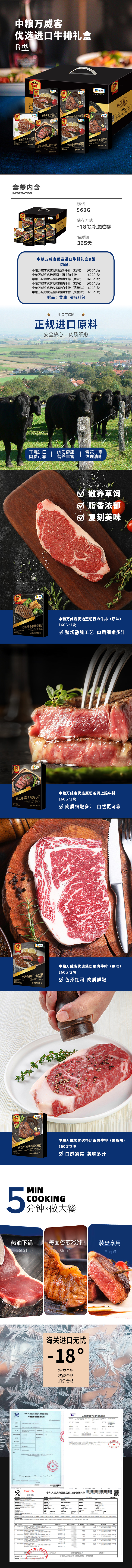 杞冠臻选 | 中粮万威客优选进口牛排礼盒B型 整切西冷牛排(原味160g*1)、原切谷饲上脑牛排160g*1、整切眼肉牛排(原味160g*2)(黑椒味160g*2)