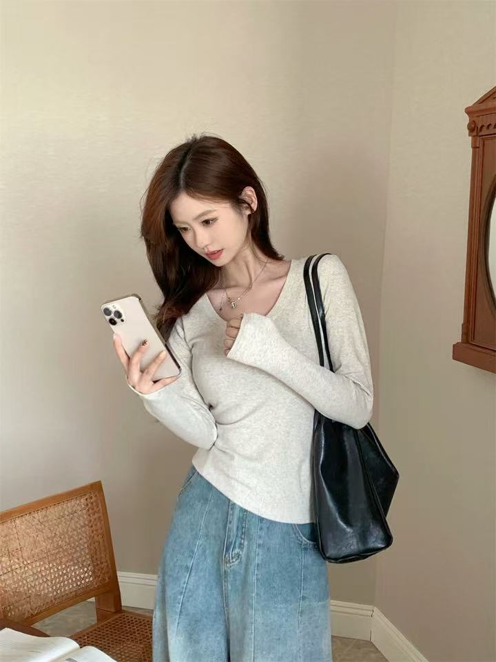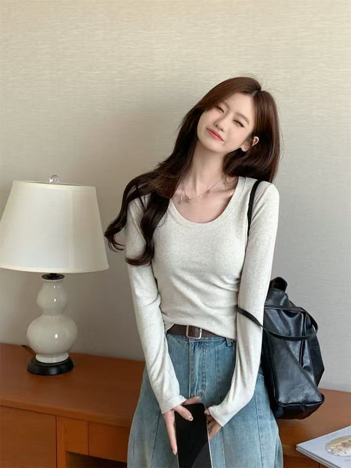 【秋上新】longmeijia高弹U领螺纹长袖T恤-喜出