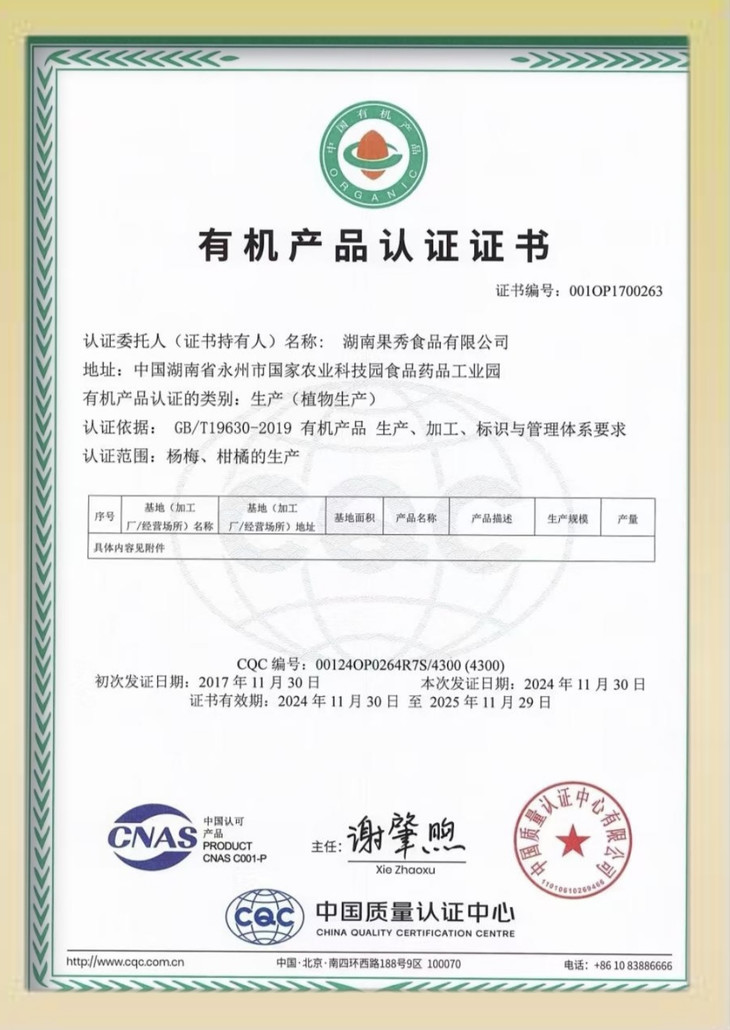 杨梅和柑橘🍊还拿到了中国质量认证中心颁发的有机产品认证证书