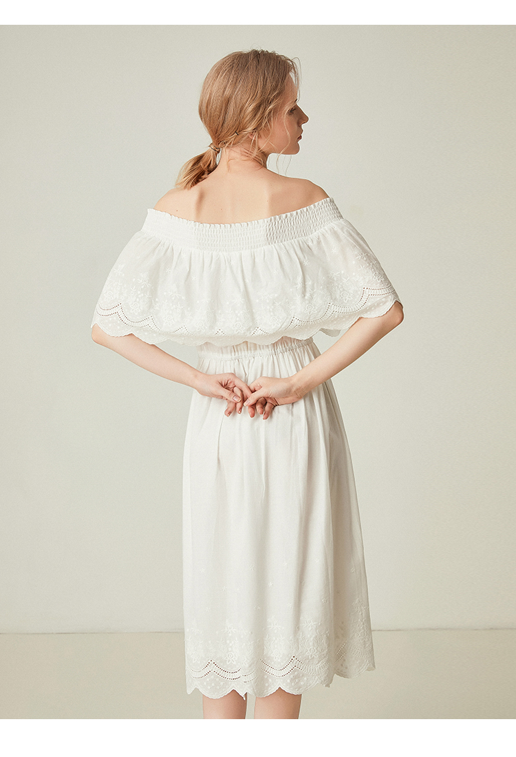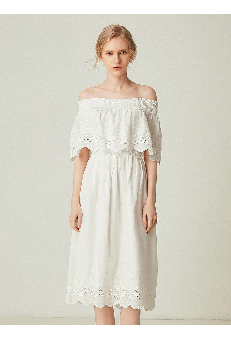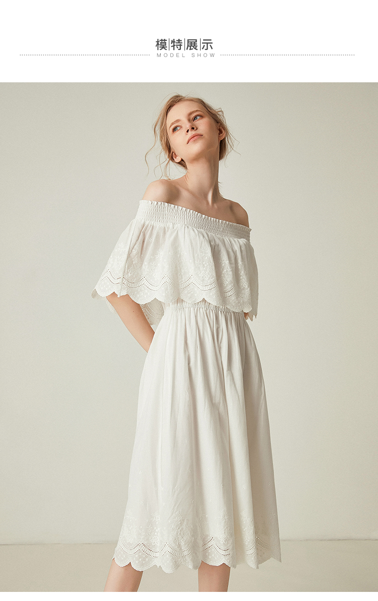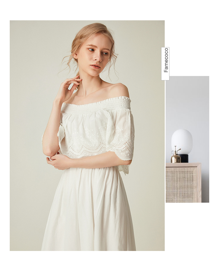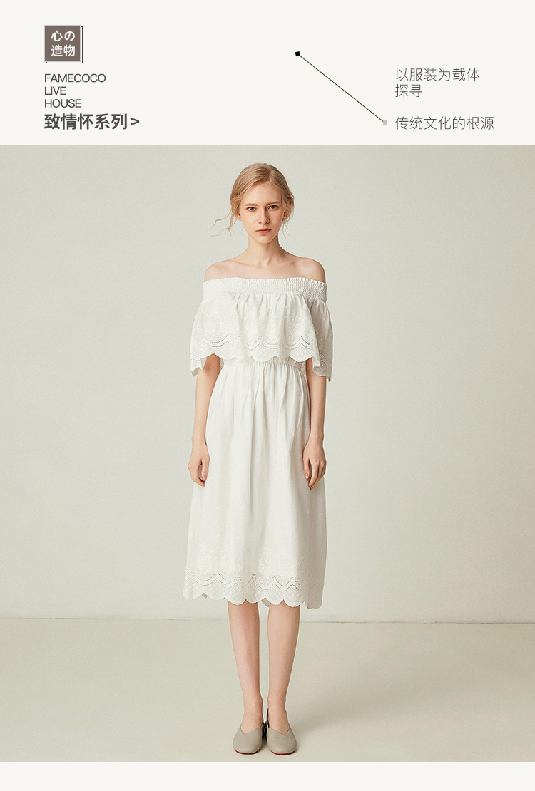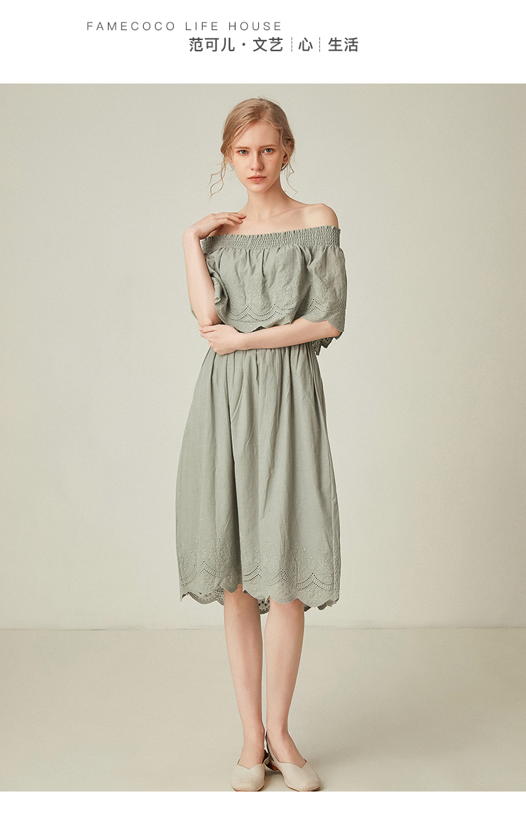 famecoco范可儿一字领连衣裙女夏纯棉气质女人味中长裙F193FA010