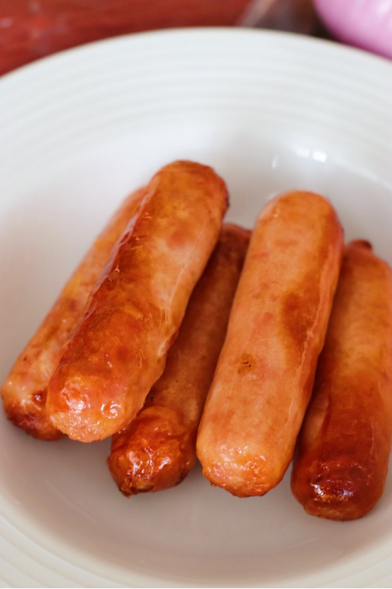 【平底锅】 1️:烤肠解冻,用牙签在肠衣上戳几个洞 2️:油热下锅,小火煎至两面焦黄即可!!