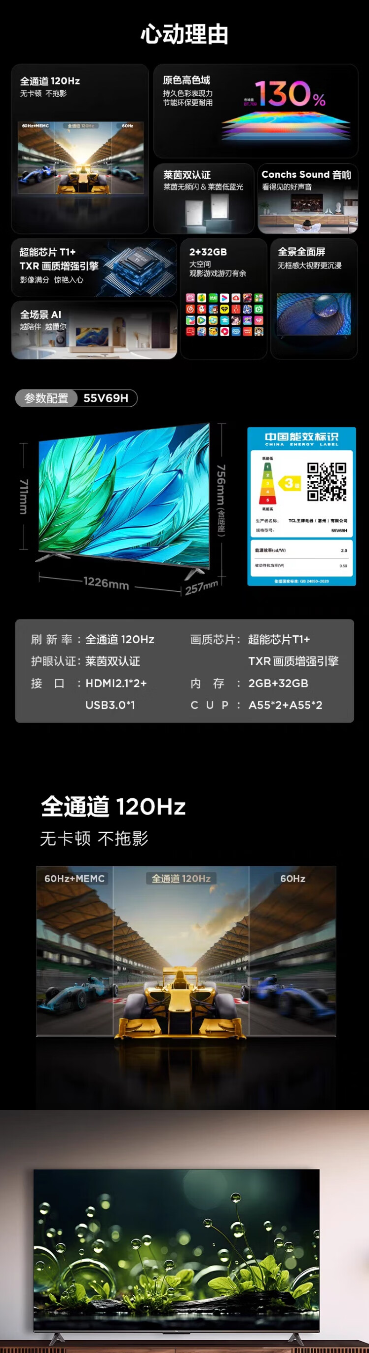 TCL(912733)电视型号55V69H 高色域130%全程120HZ高刷 55英寸