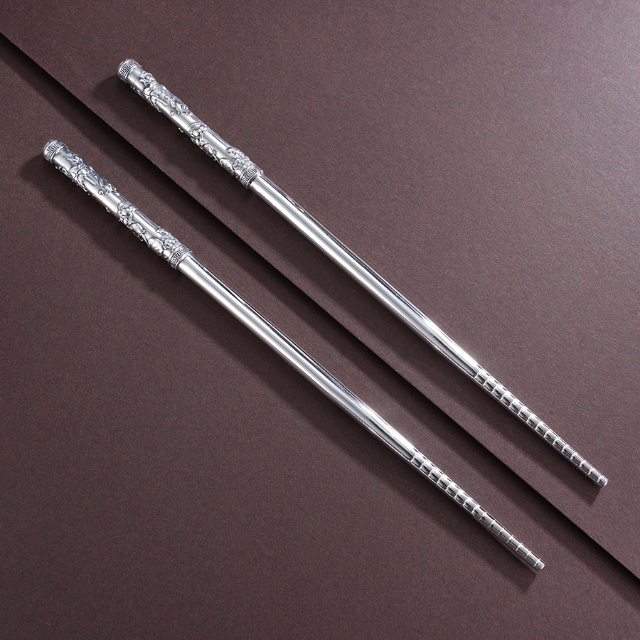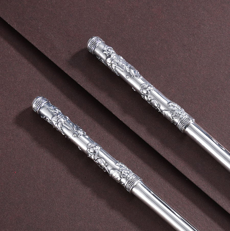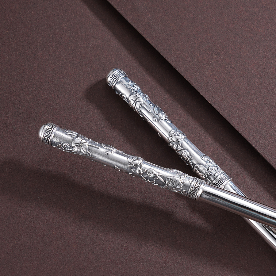 【寓意】:银筷足银精制,莲花与莲叶相融,共筑宁静致远之境。复古祥和,观之可亲。寓意花开福来,不染尘埃,平安顺遂。