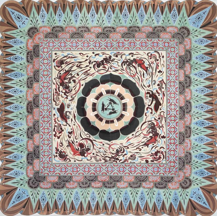图案灵感来自于敦煌莫高窟隋代407号窟的三兔共耳藻井图案。三兔共耳图案以神奇的共生形态以及动静相宜的完美结合代表着相当之高的艺术造诣,且在现代设计中具有很大的启发性。三只兔子互相追逐奔跑,首尾相接、不离不弃,寓意绵延不绝、生生不息;设计师在兔身周围添加的云波纹生动形象的展示出兔子在云中奔跑的状态,形象可掬;周围点缀含有吉祥美满的宝相花纹样图形,三种元素动静相宜得到了完美的结合,搭配星空底纹使画面更加丰富多彩。