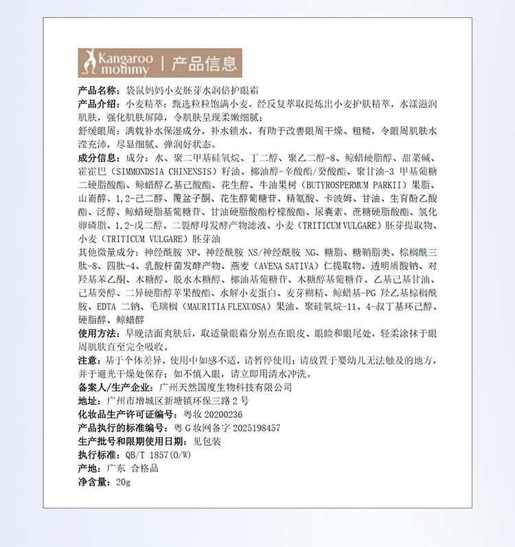 【小麦眼霜】 全肤质适用 舒缓眼周肌肤疲态 水亮双眸 小麦胚芽水润倍护精华眼霜20g