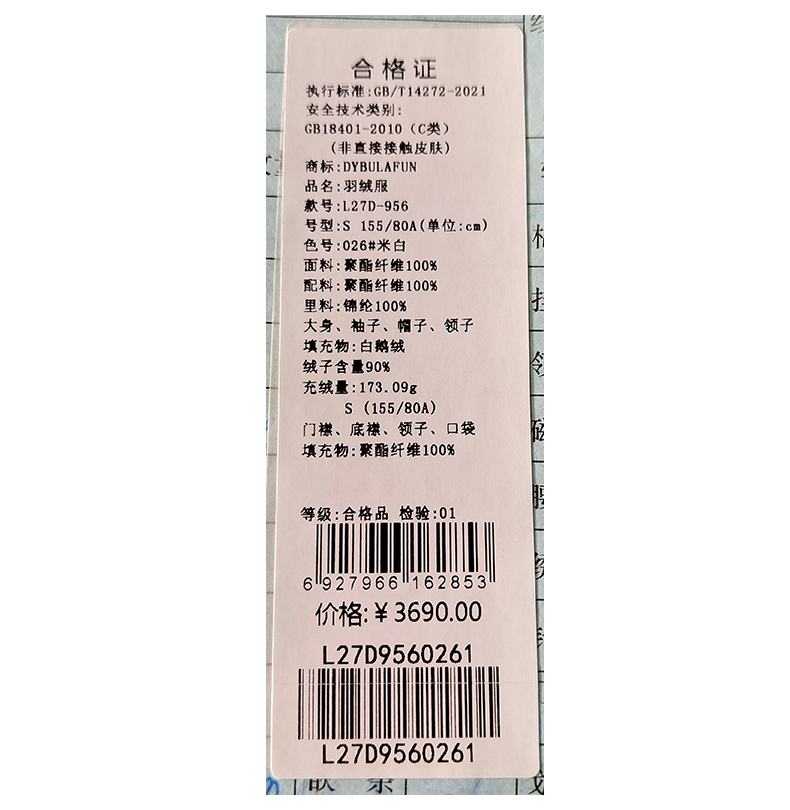 戴布拉芬羽绒服L27D956