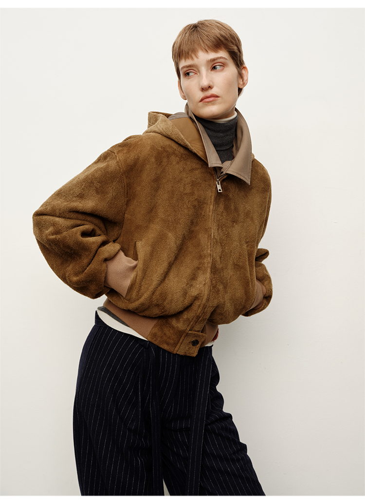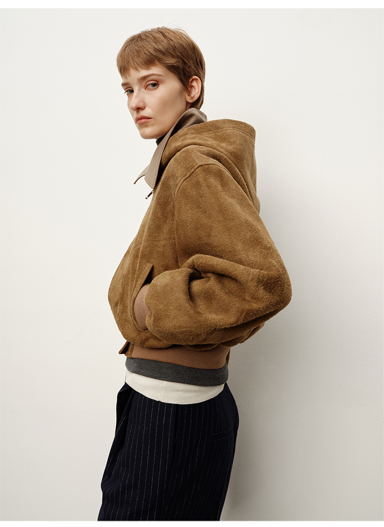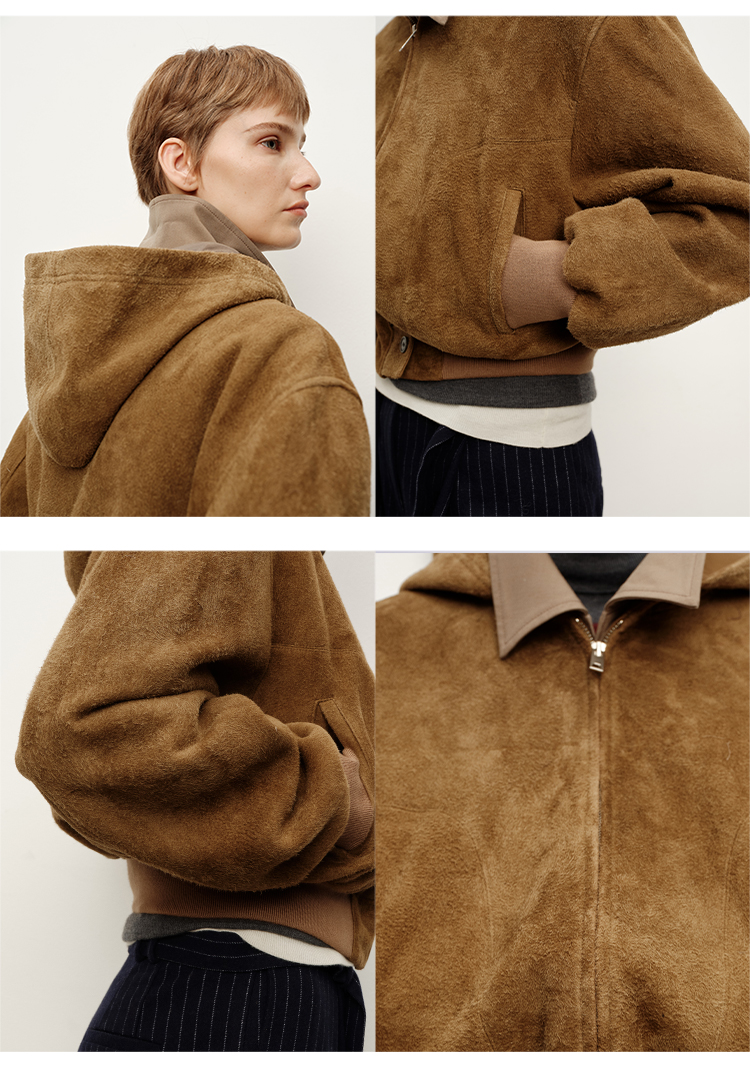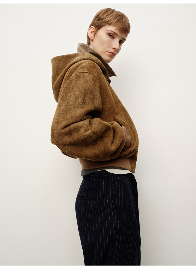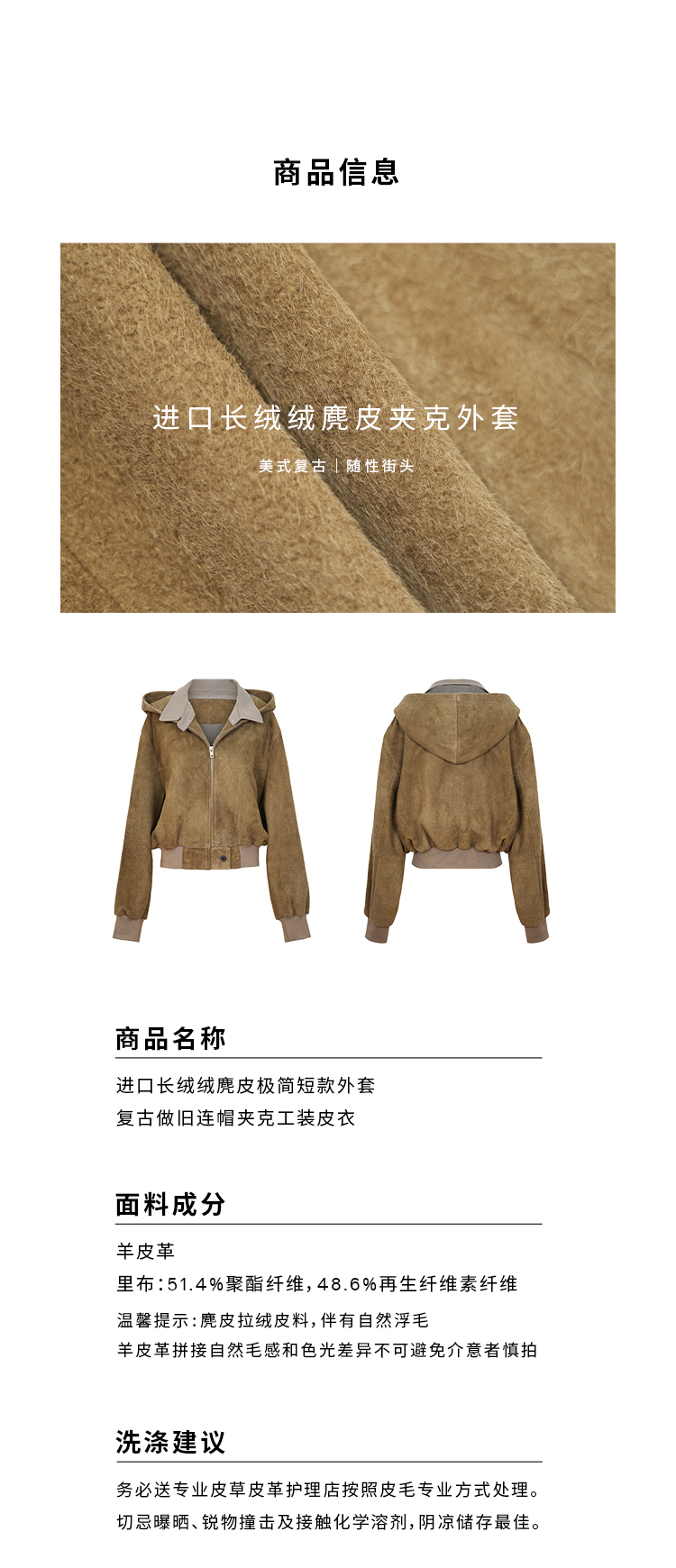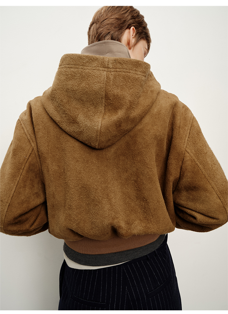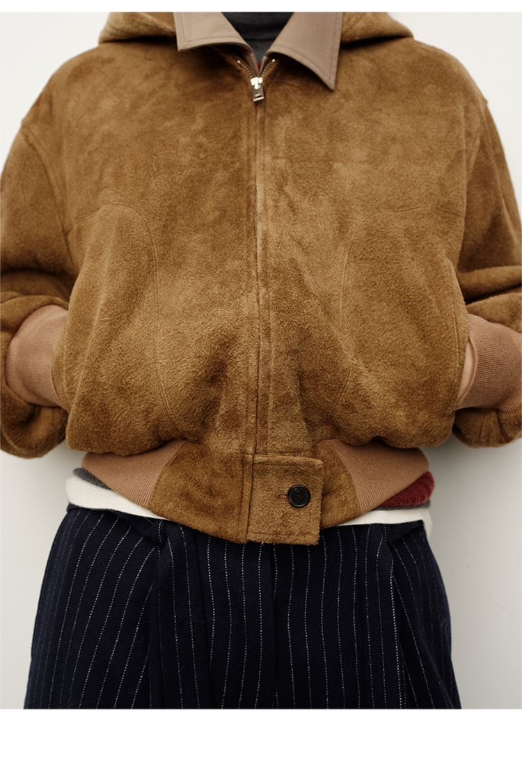 HIDEMI 进口长绒绒麂皮极简短款外套复古做旧连帽夹克短款皮衣