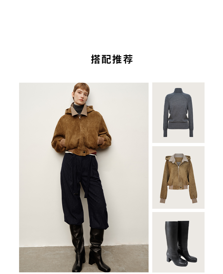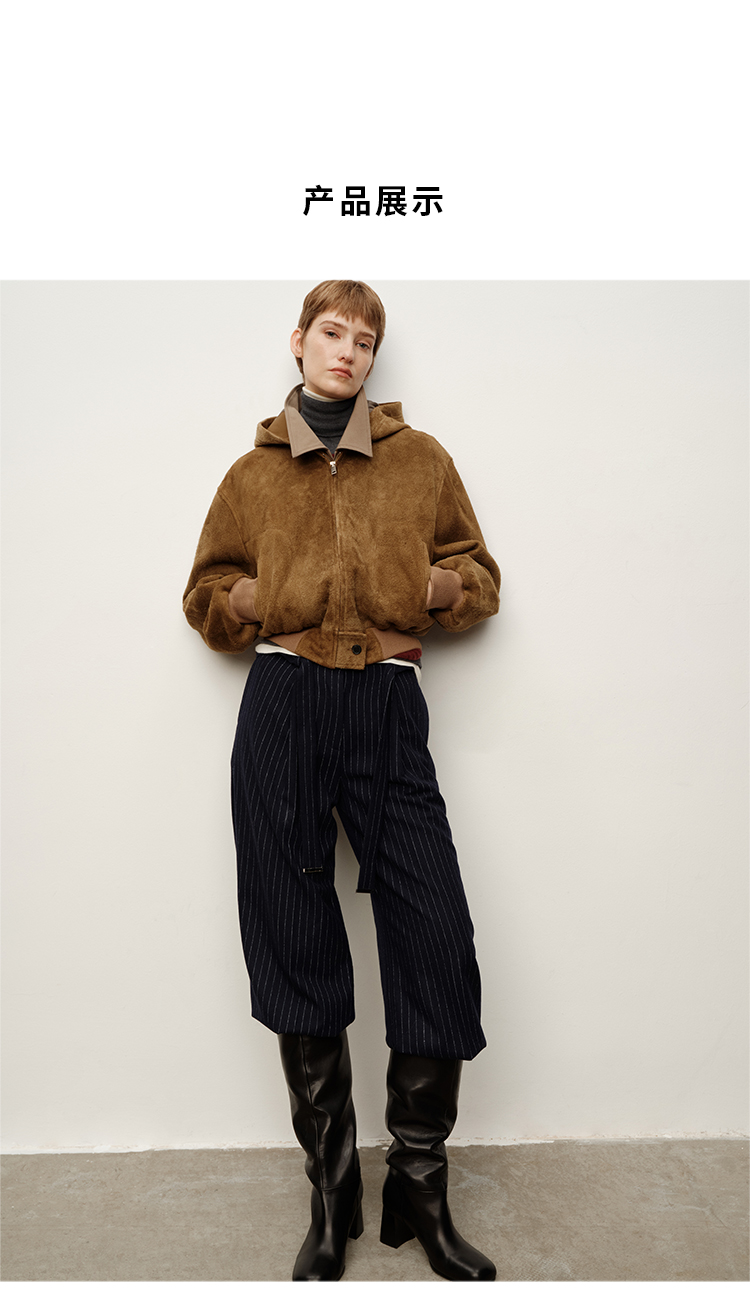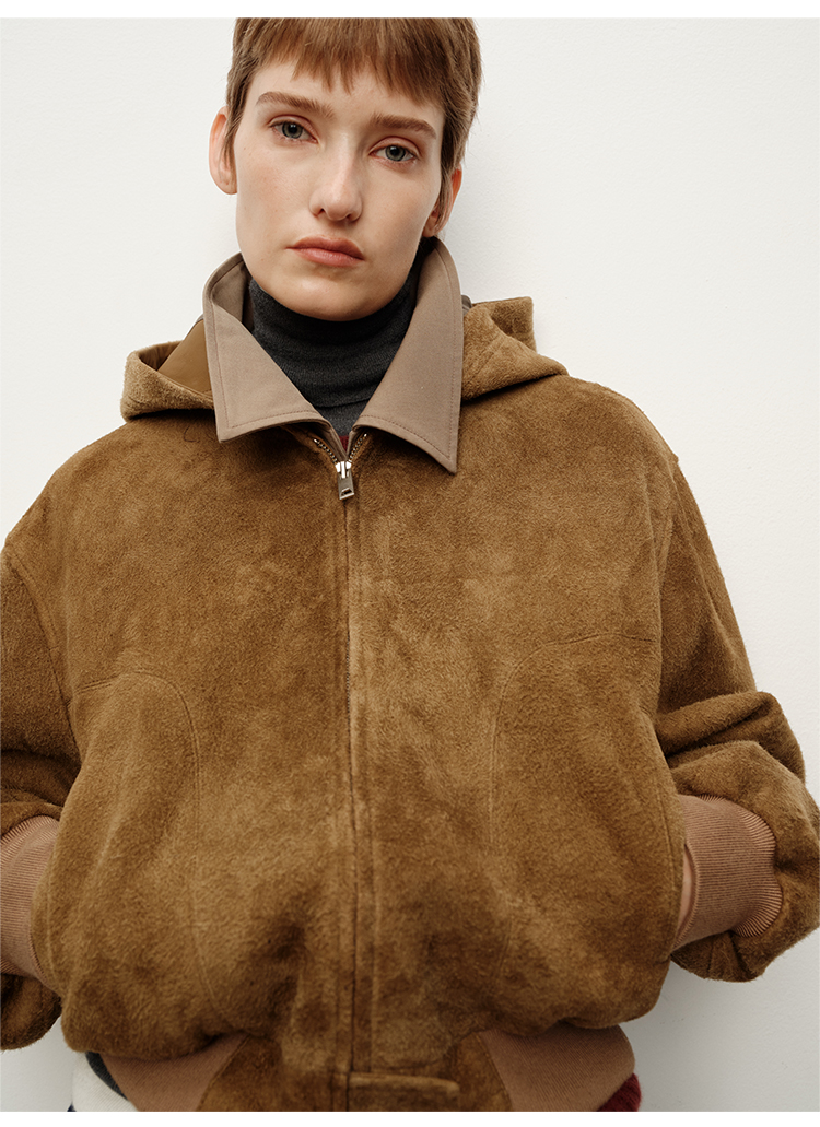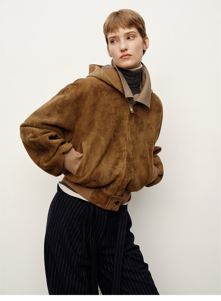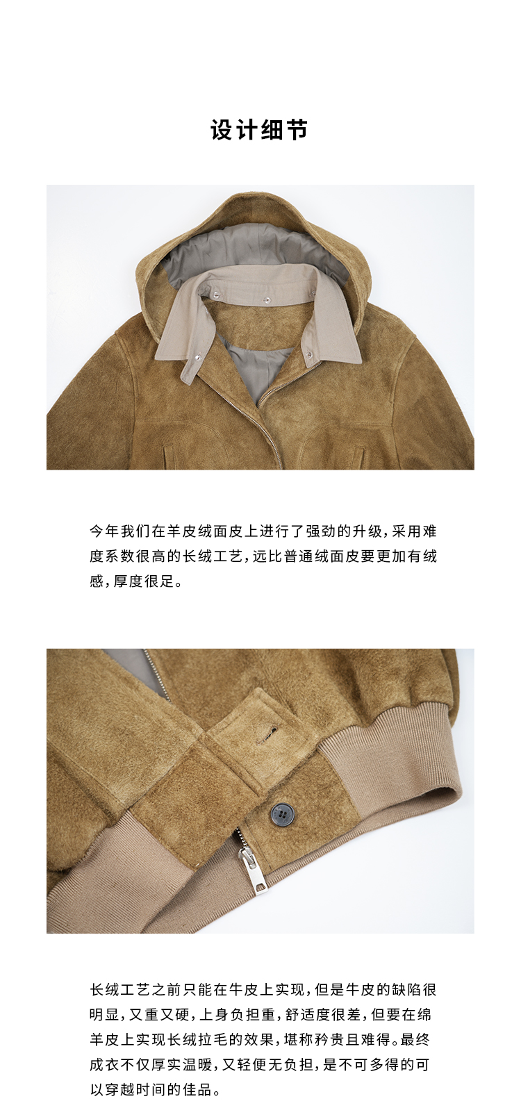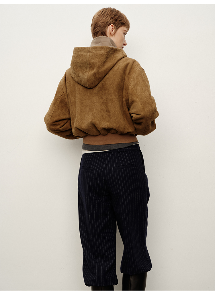 HIDEMI 进口长绒绒麂皮极简短款外套复古做旧连帽夹克短款皮衣