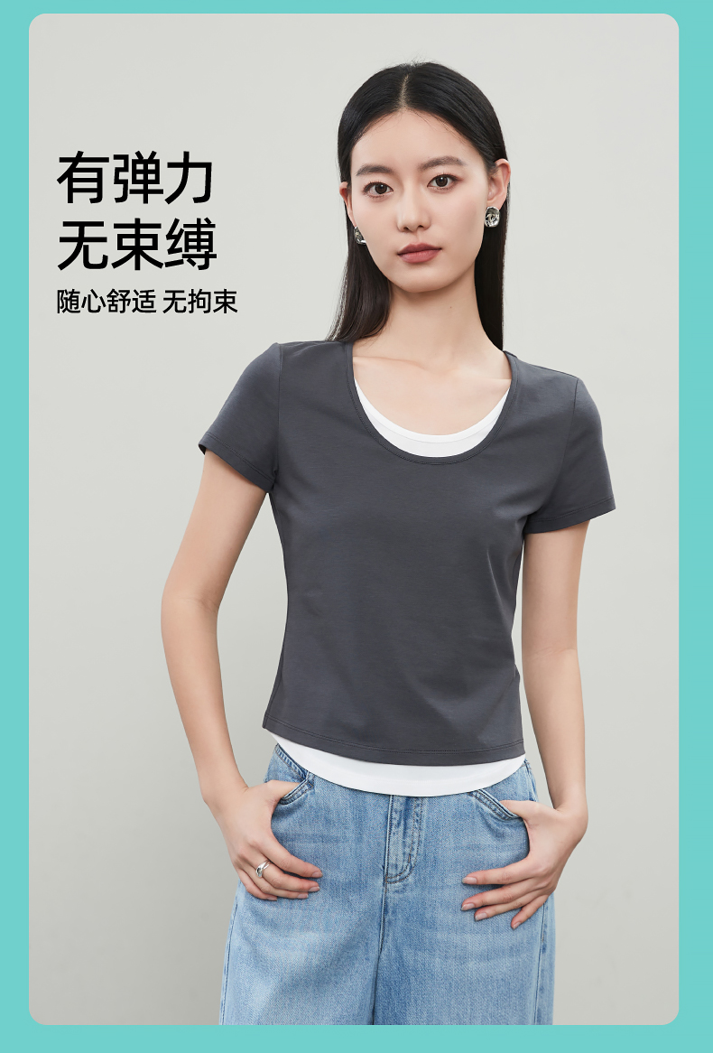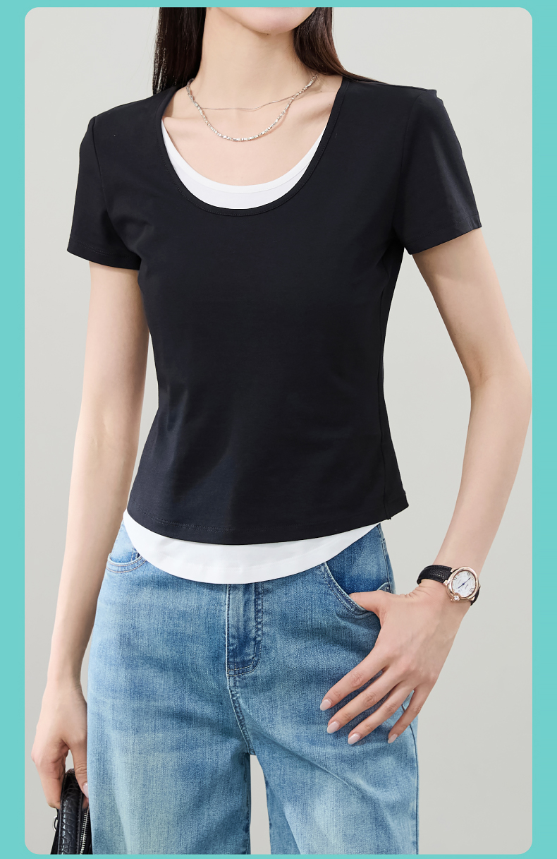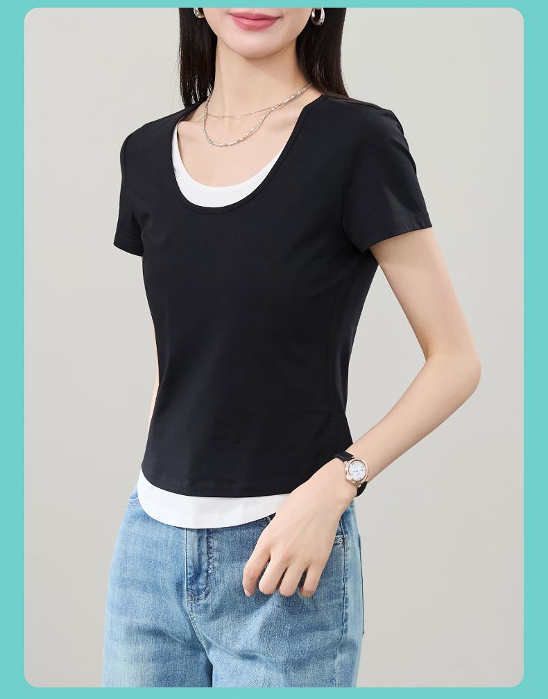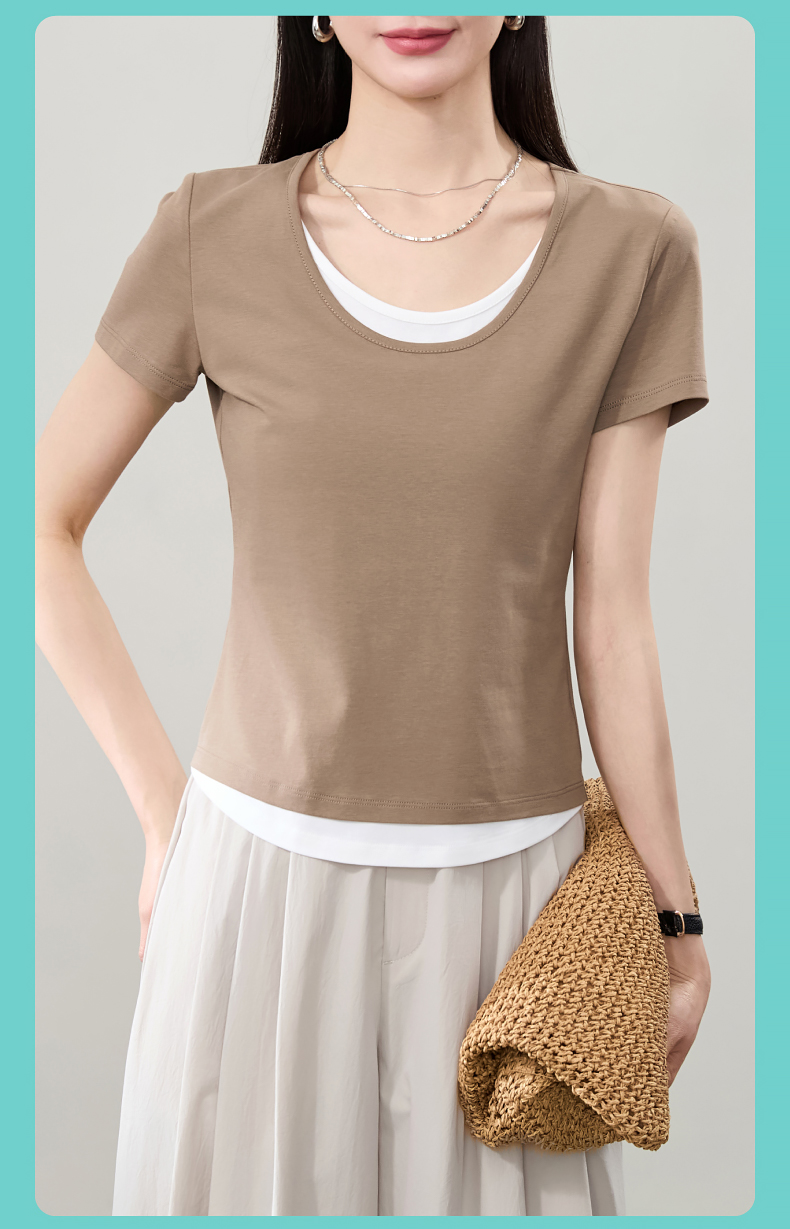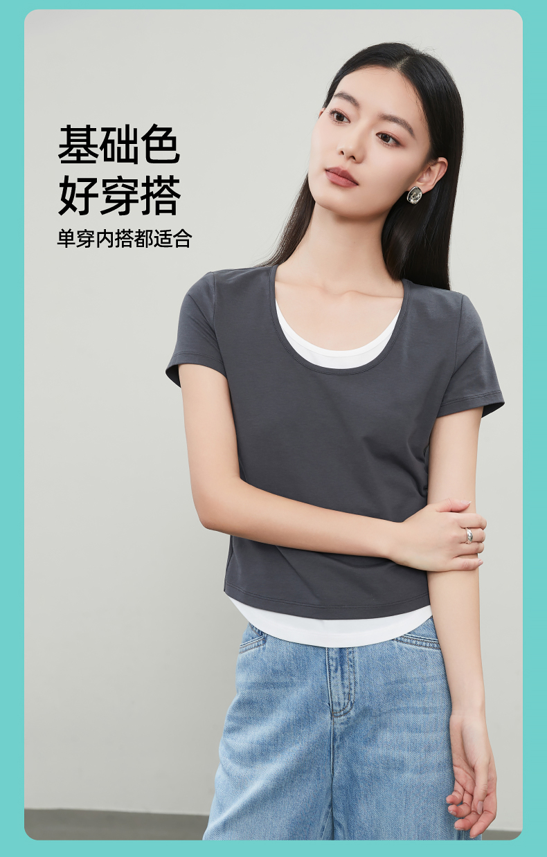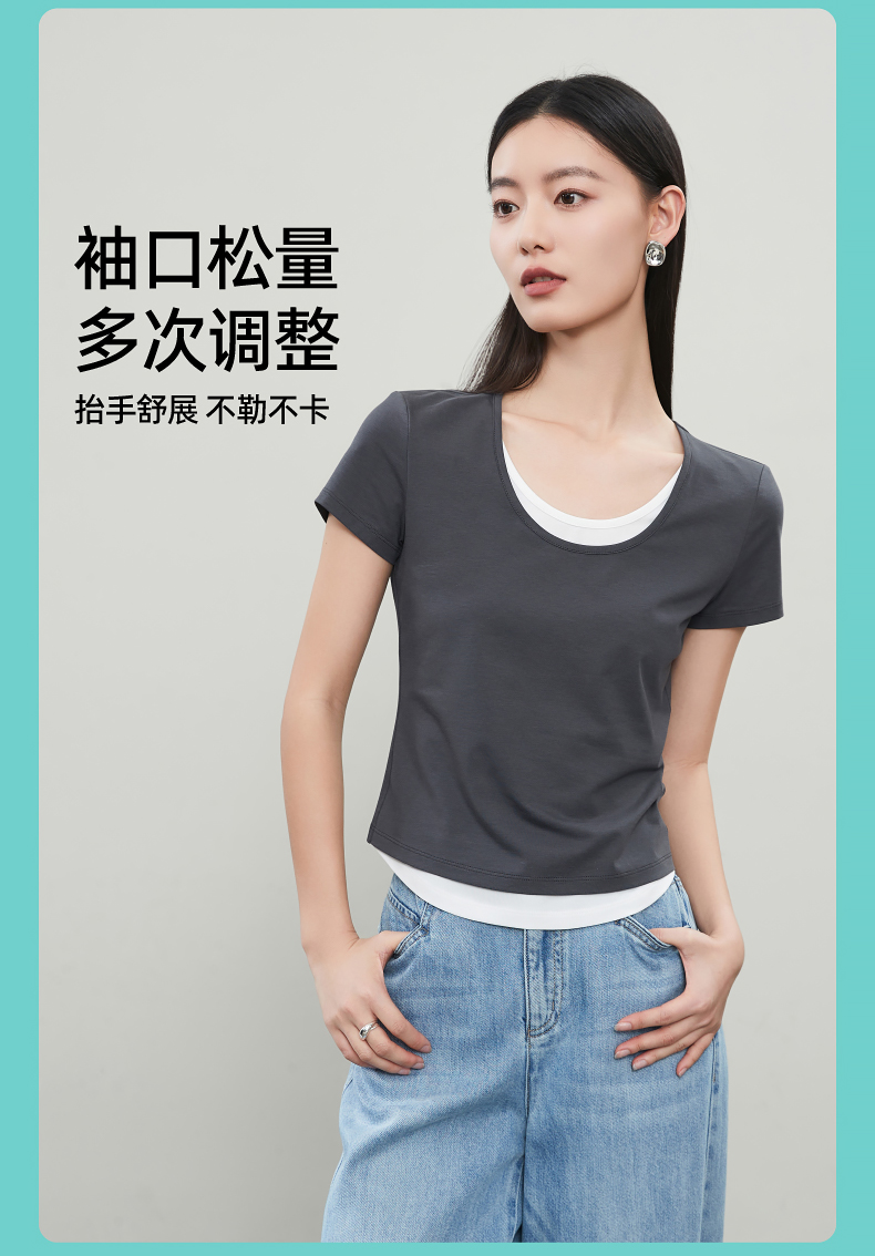 【莱赛尔假两件短T】逸阳夏薄圆领修身内搭短袖上衣5159