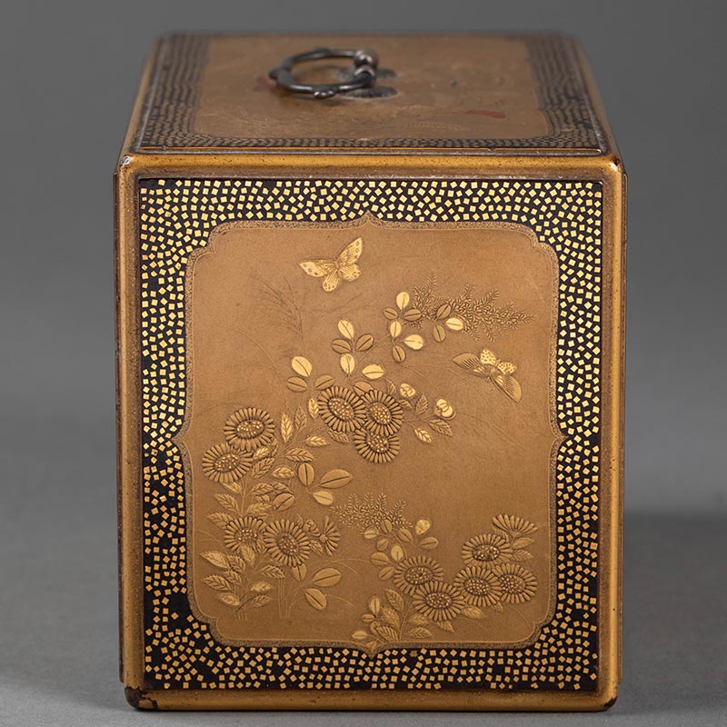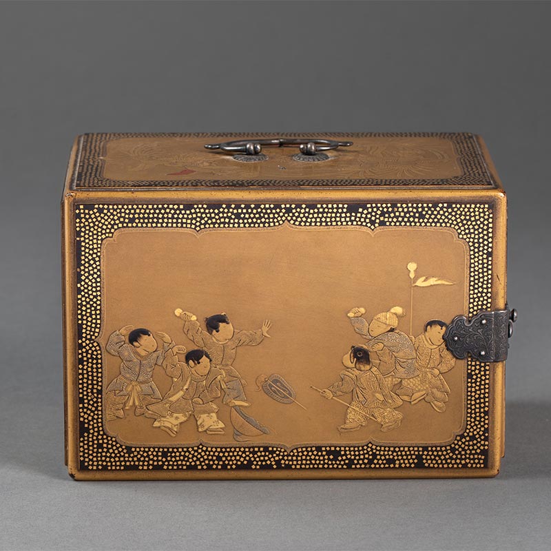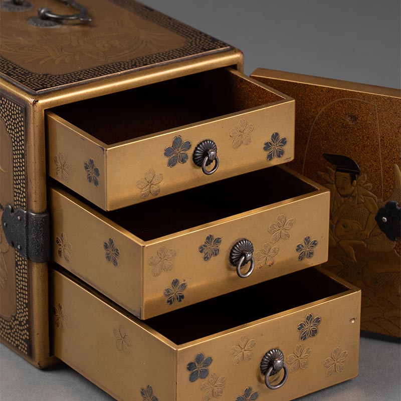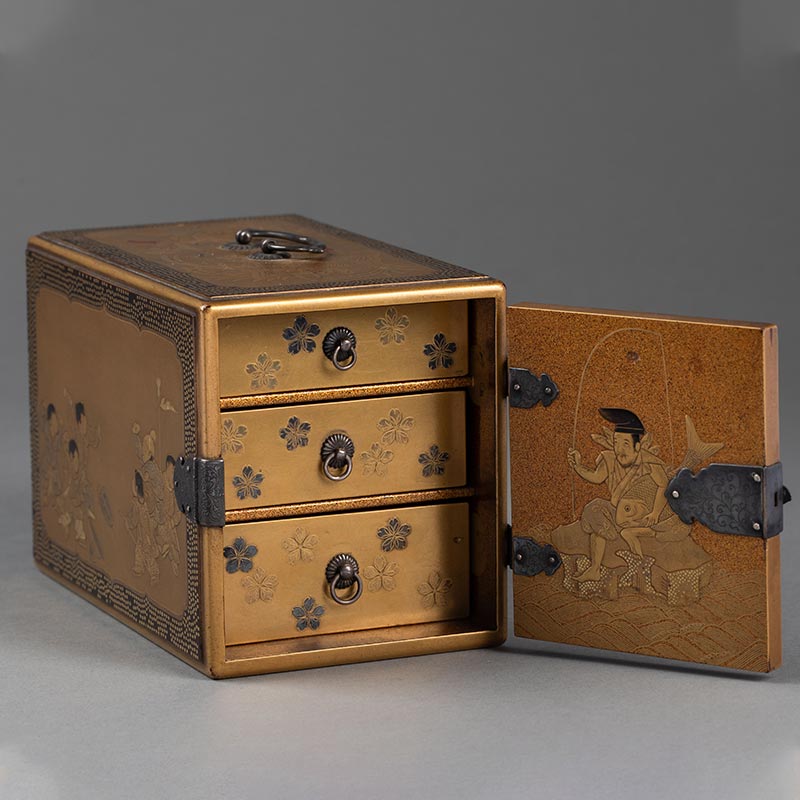 19世纪日本明治时期出品「恵比寿与唐子」东方人物主题金漆莳绘小箪笥