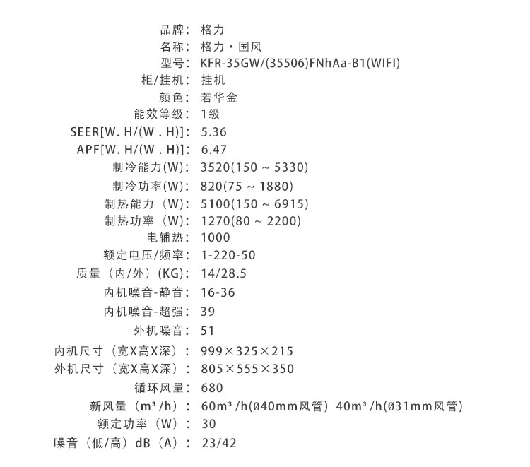 格力·国风 变频冷暖1.5匹1级能效挂机空调 KFR-35GW/(35506)FNhAa-B(WIFI)(若华金)