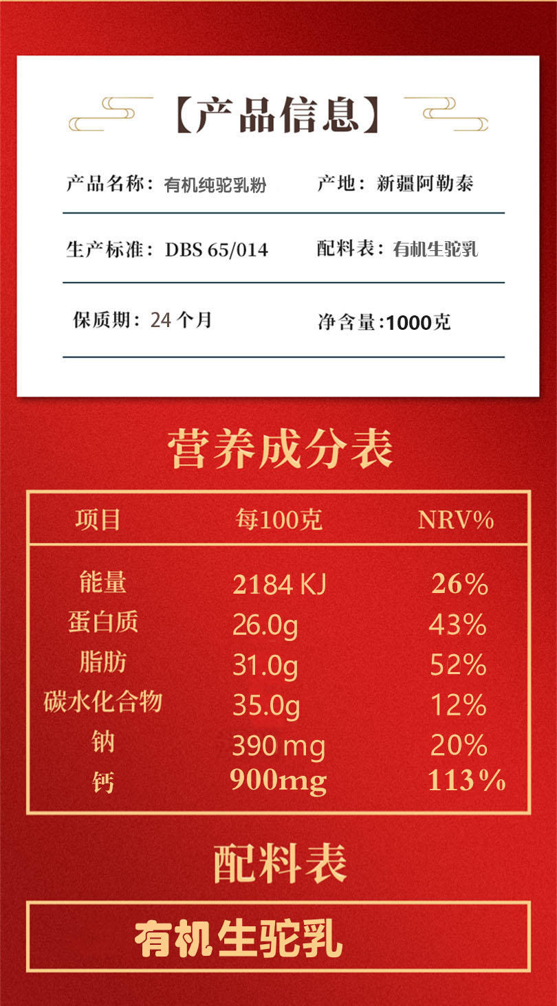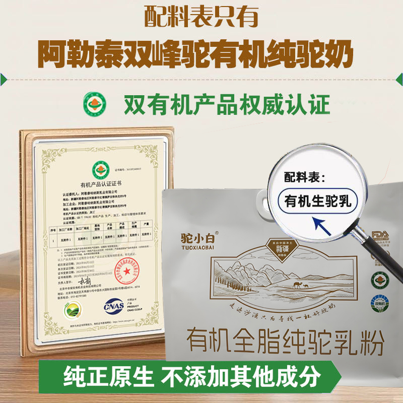 产品名称:驼小白1kg袋装双有机全脂纯驼乳粉