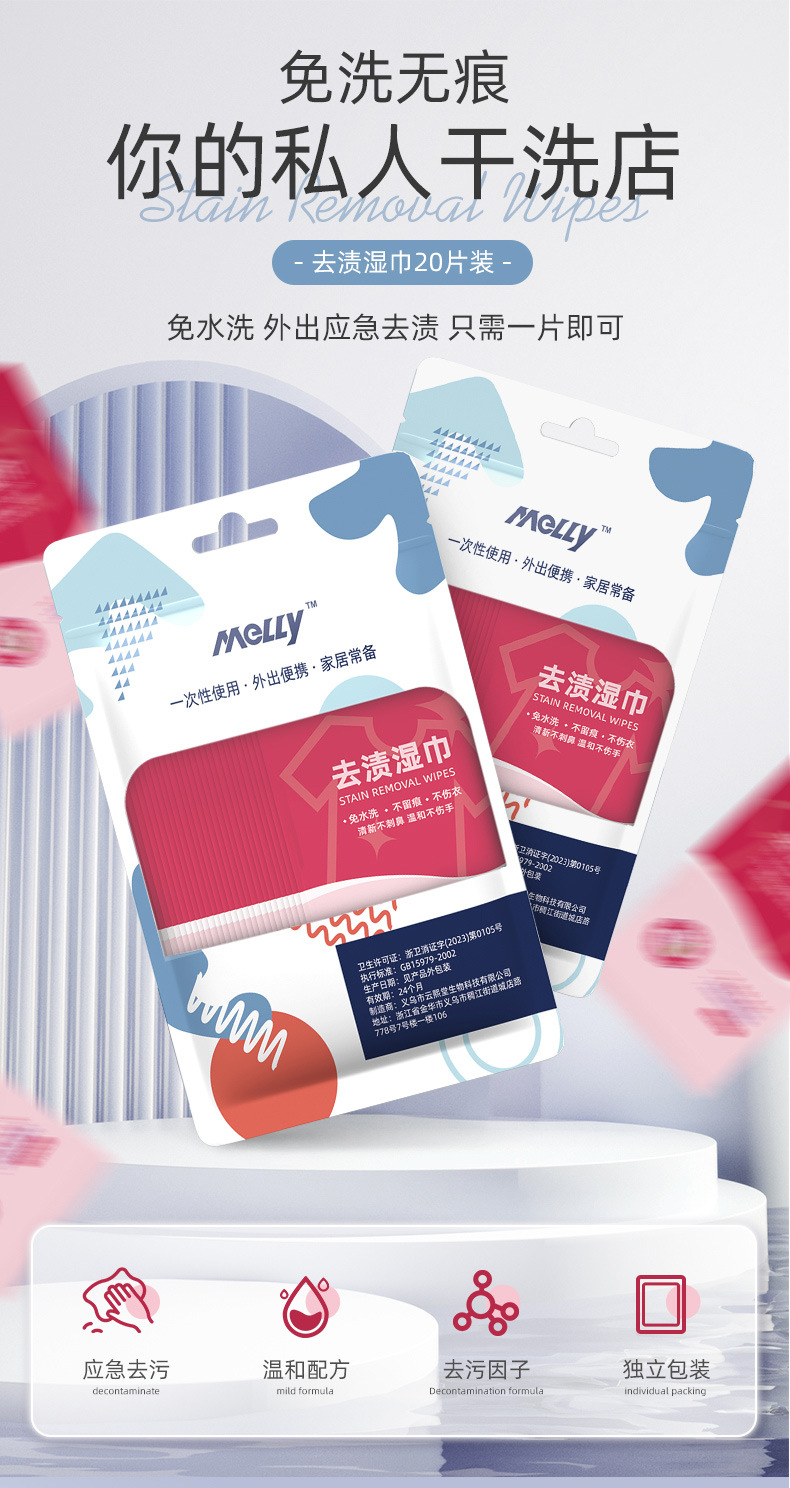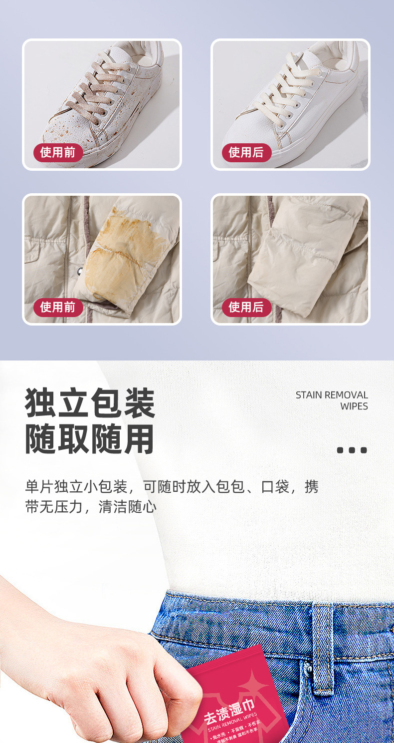 「19.9到手4袋!单袋20片」衣物去渍湿巾 清洁工具便携应急羽绒服去油去污免洗湿纸巾居家日用独立包装
