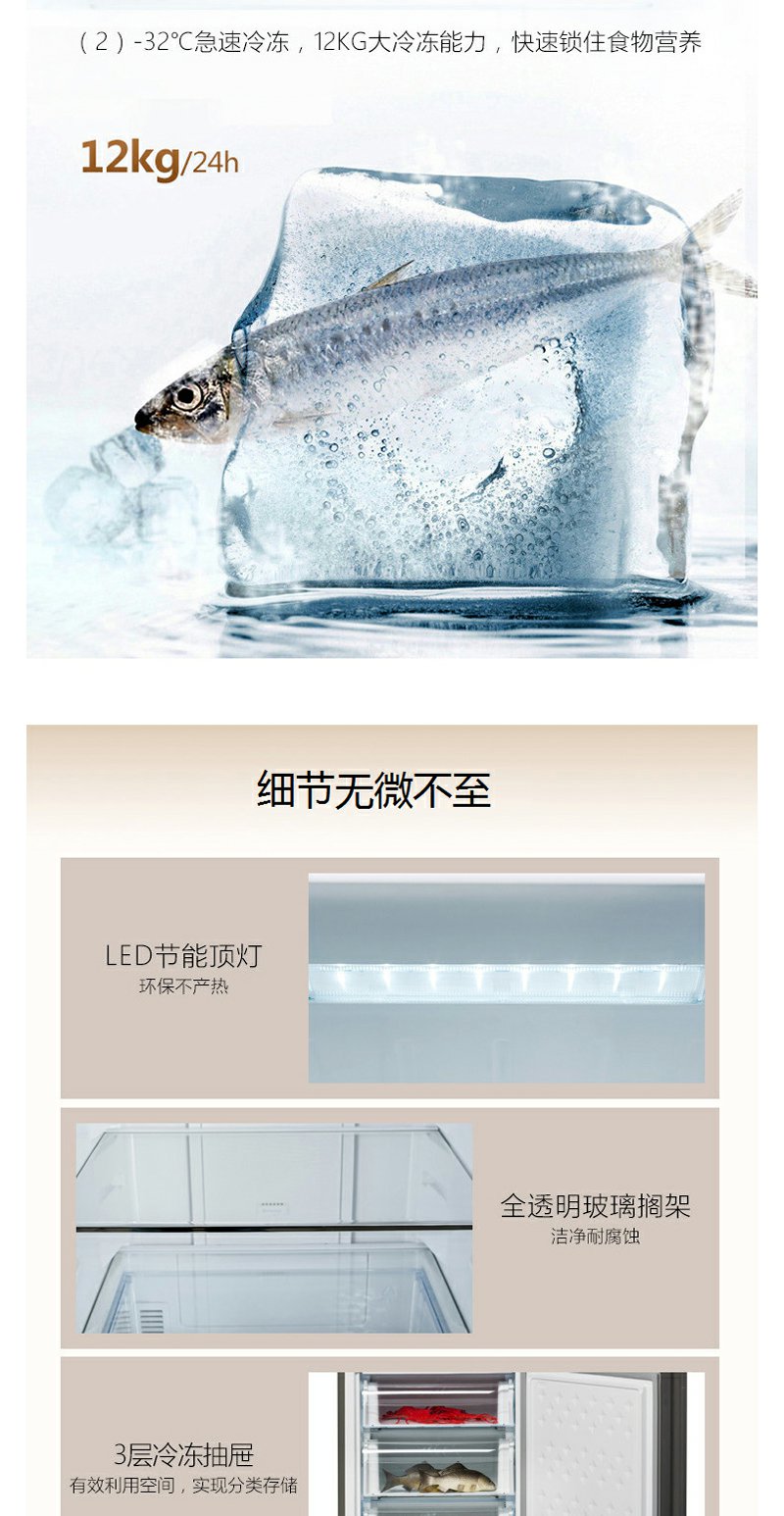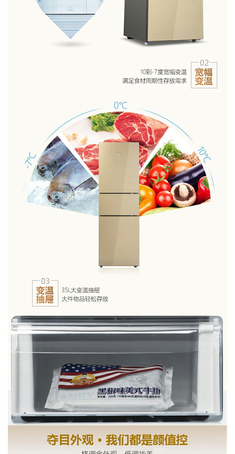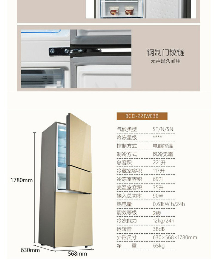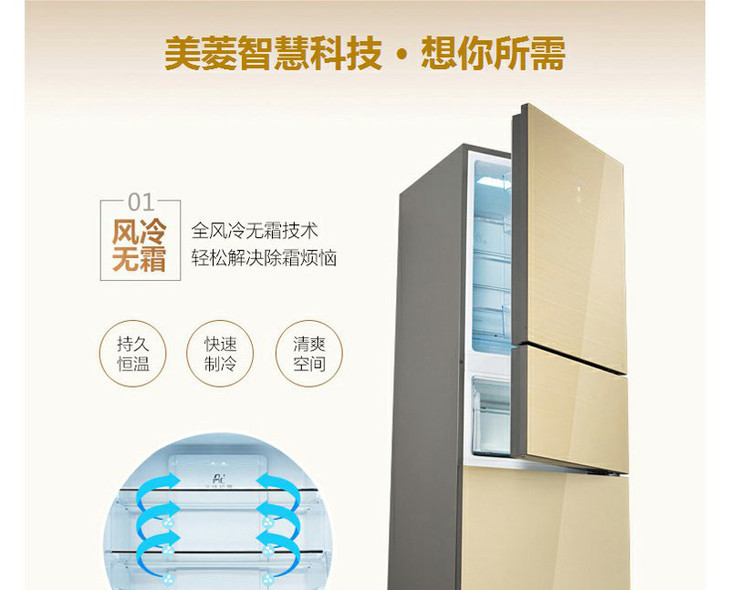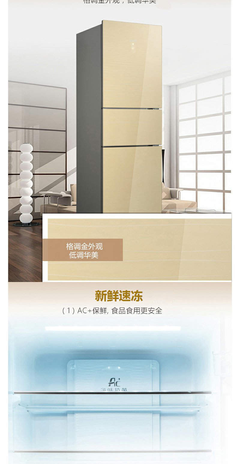 美菱(MeiLing) BCD-221WE3B 221 升三门冰箱 风冷无霜 电脑控温 新二级能效(金色)