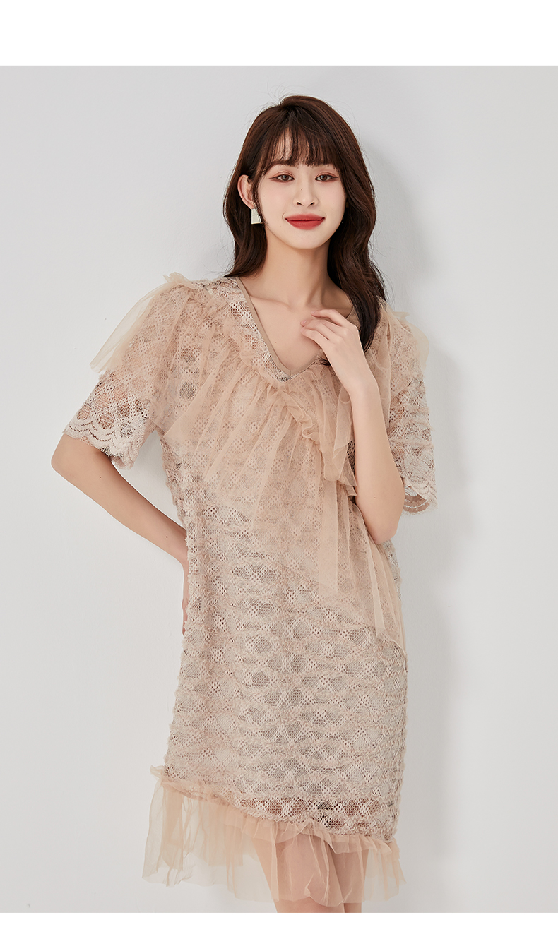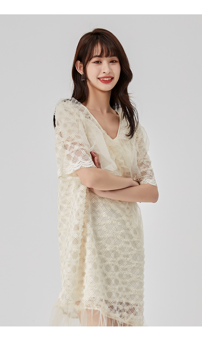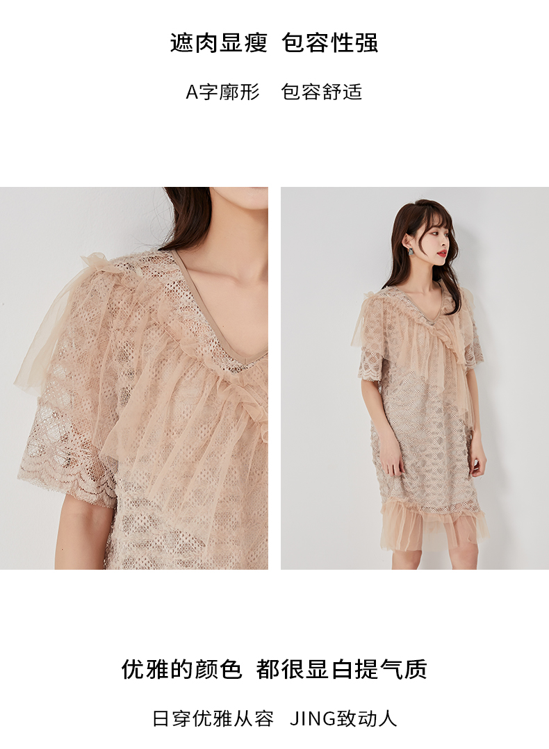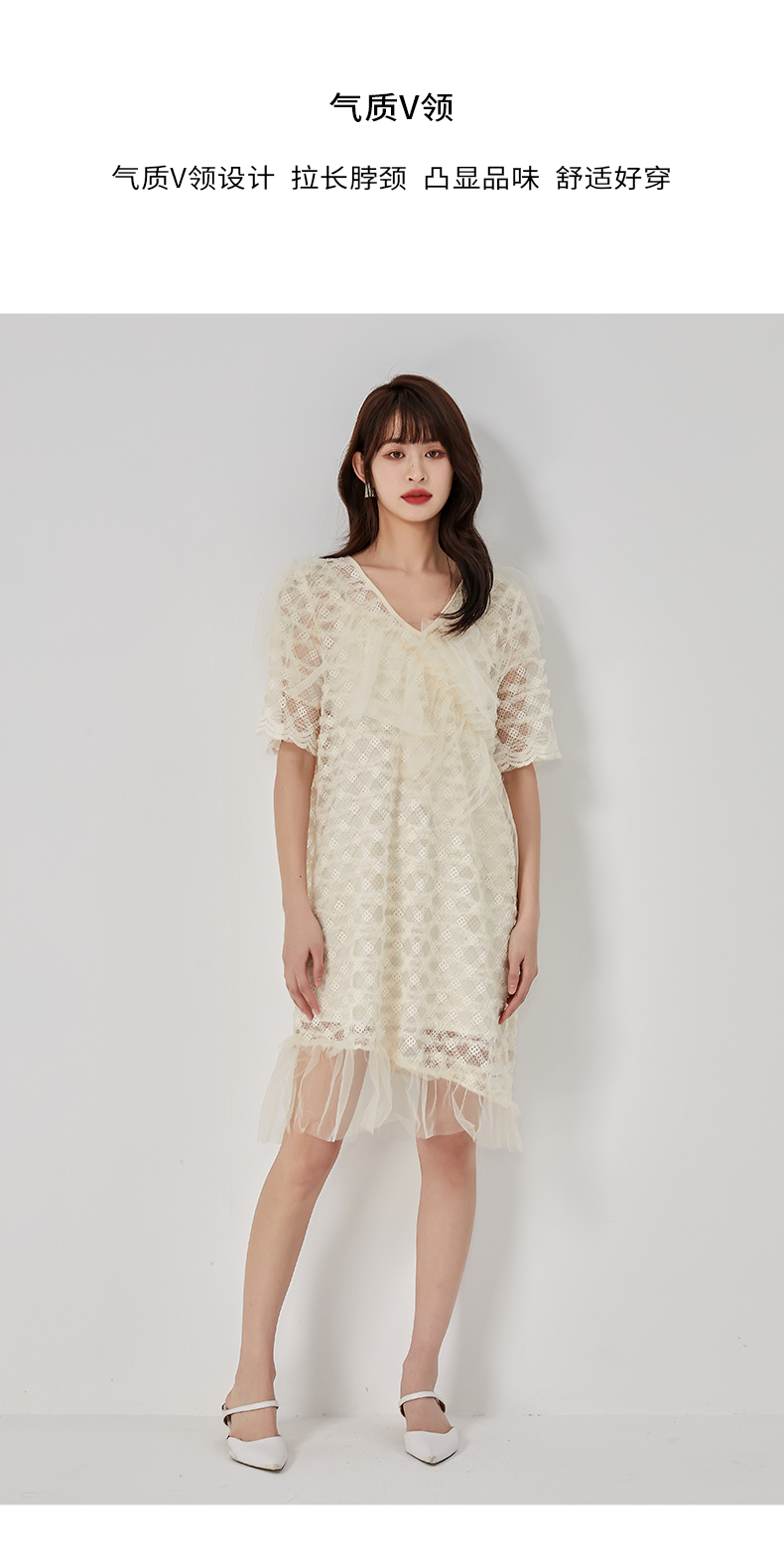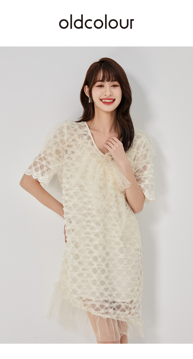 oldcolour夏新款时尚气质蕾丝V领宽松连衣裙两件套O23101369