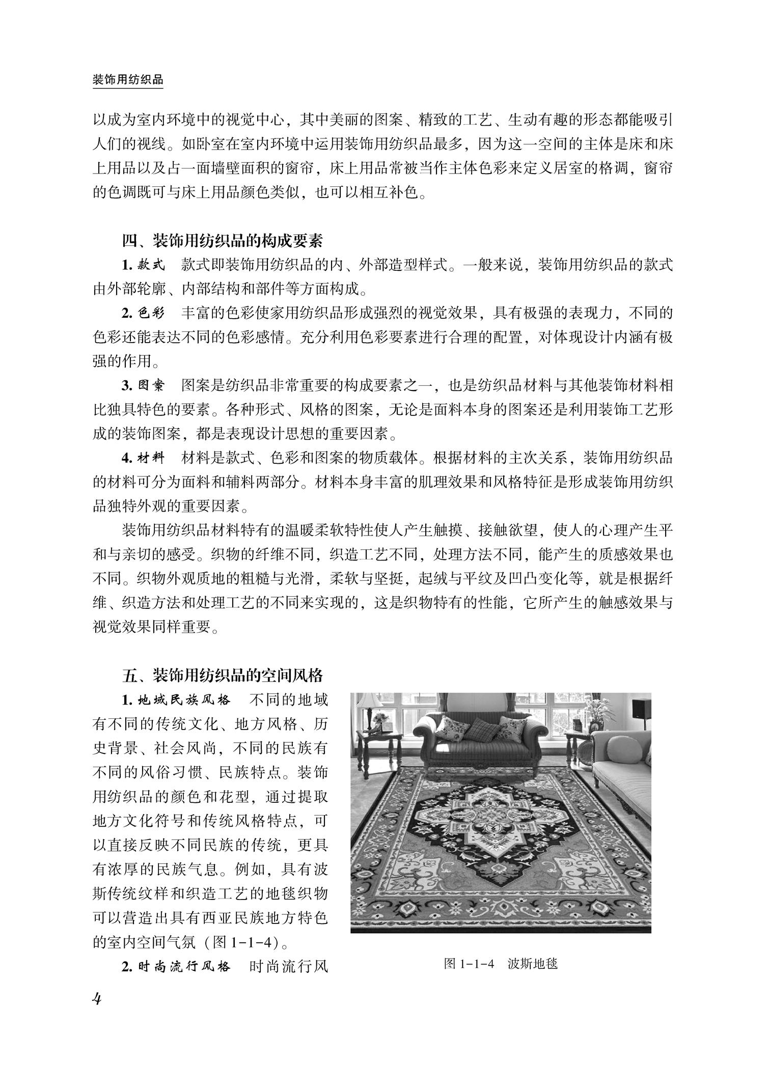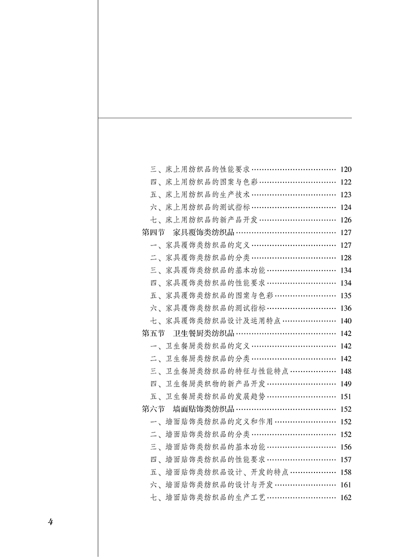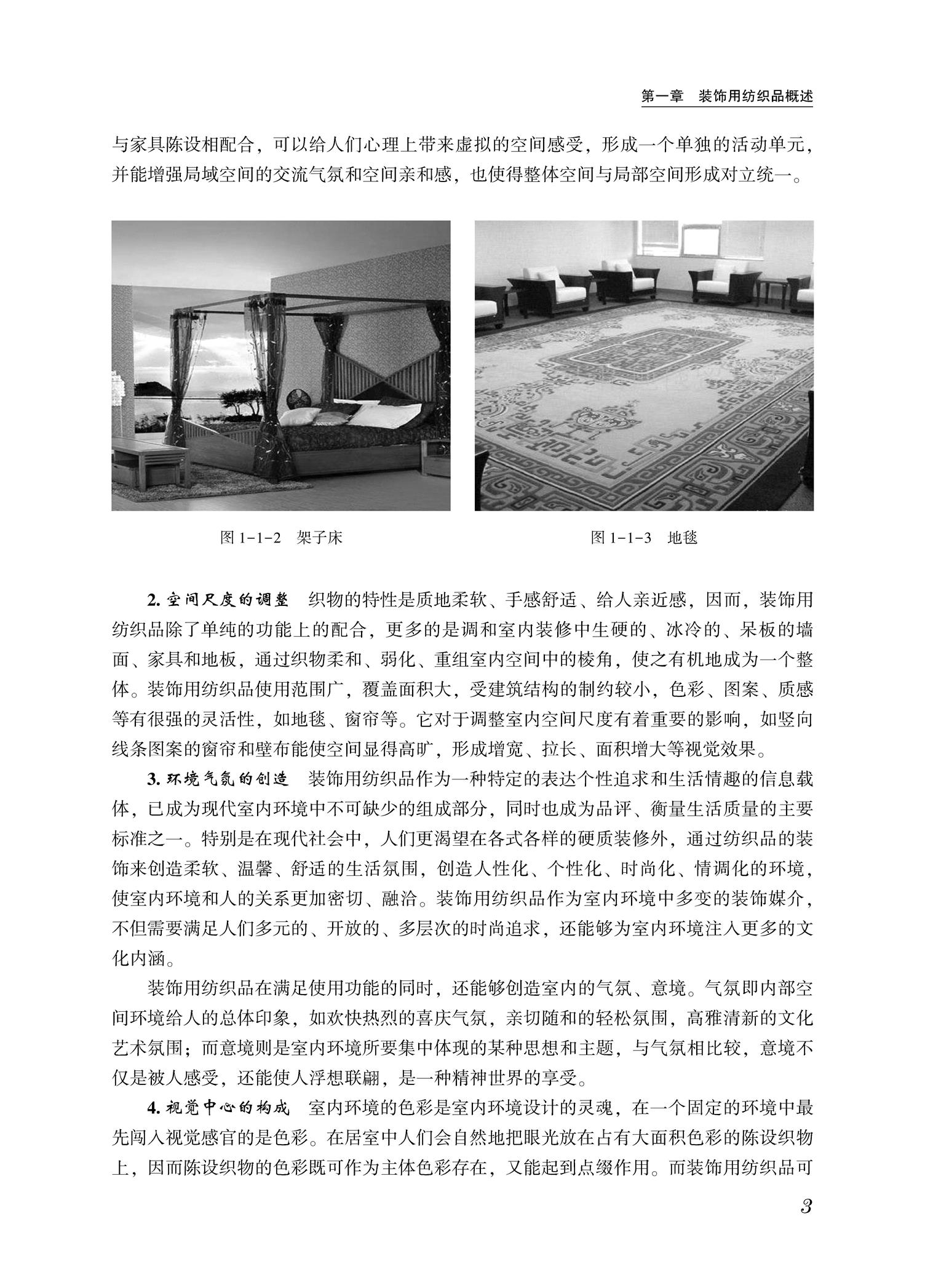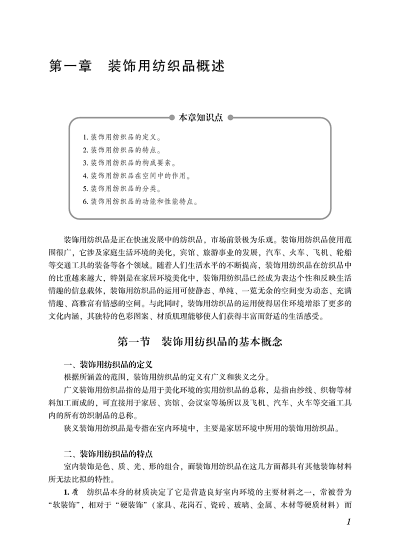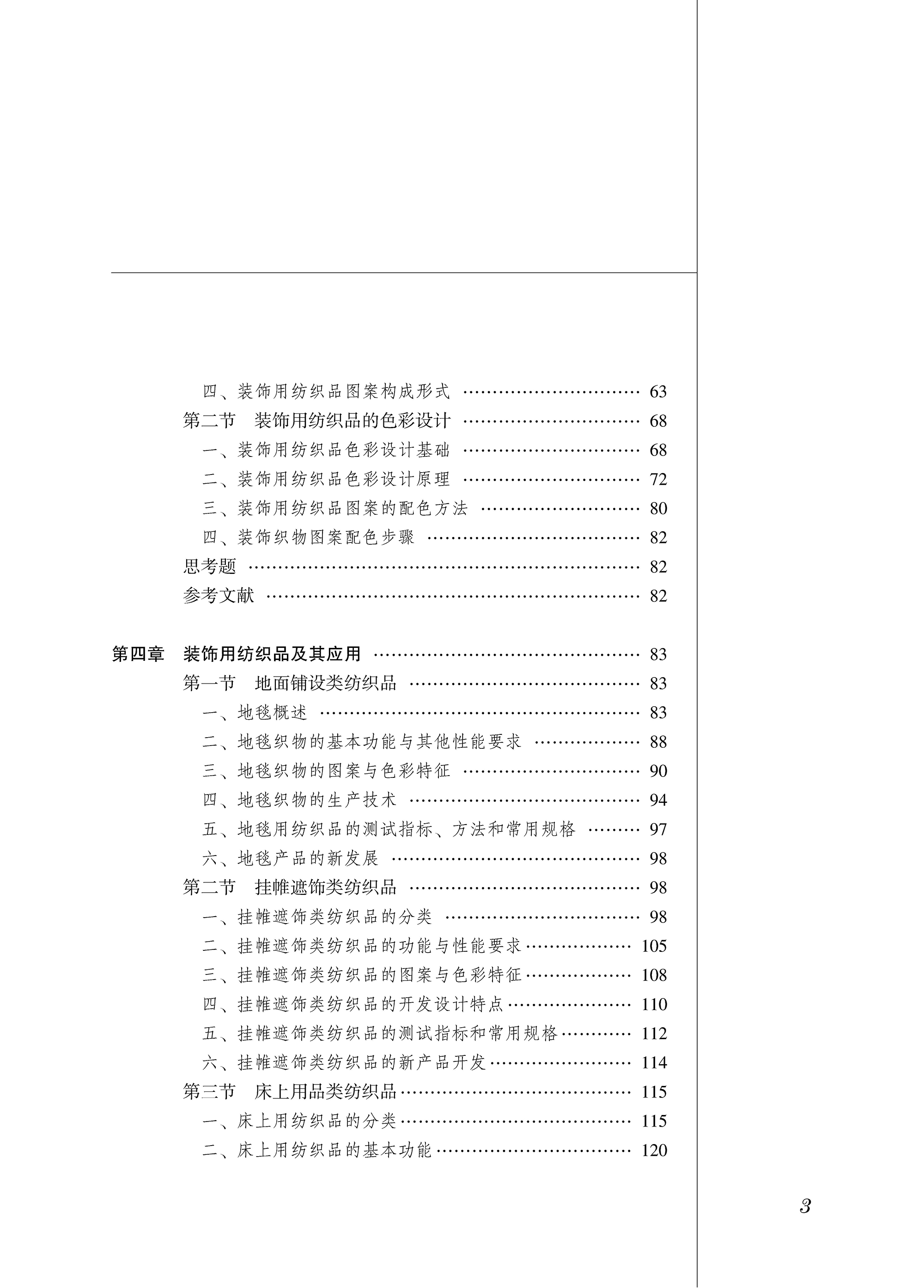 图案与色彩设计、产品开发、处理技术以及新纤维、新技术在产品开发方面的应用。同时按用途分类分别介绍了六大类装饰用纺织品, 如地面铺设类、挂帷遮饰类、床上用品类、家具覆饰类、卫生餐厨类和墙面贴饰类等纺织品的分类、基本功能与性能要求、图案与色彩设计特点以及产品开发趋势等。