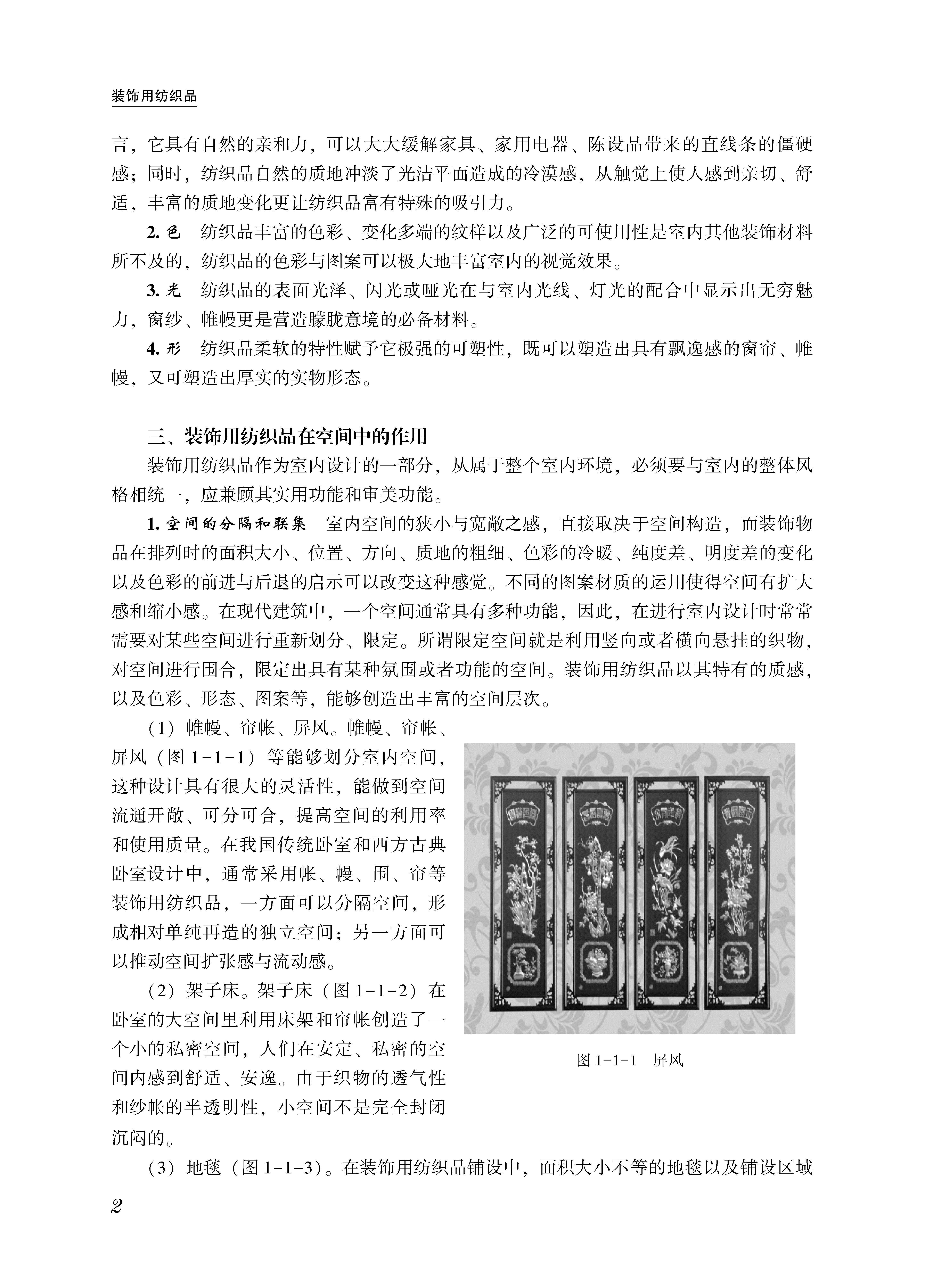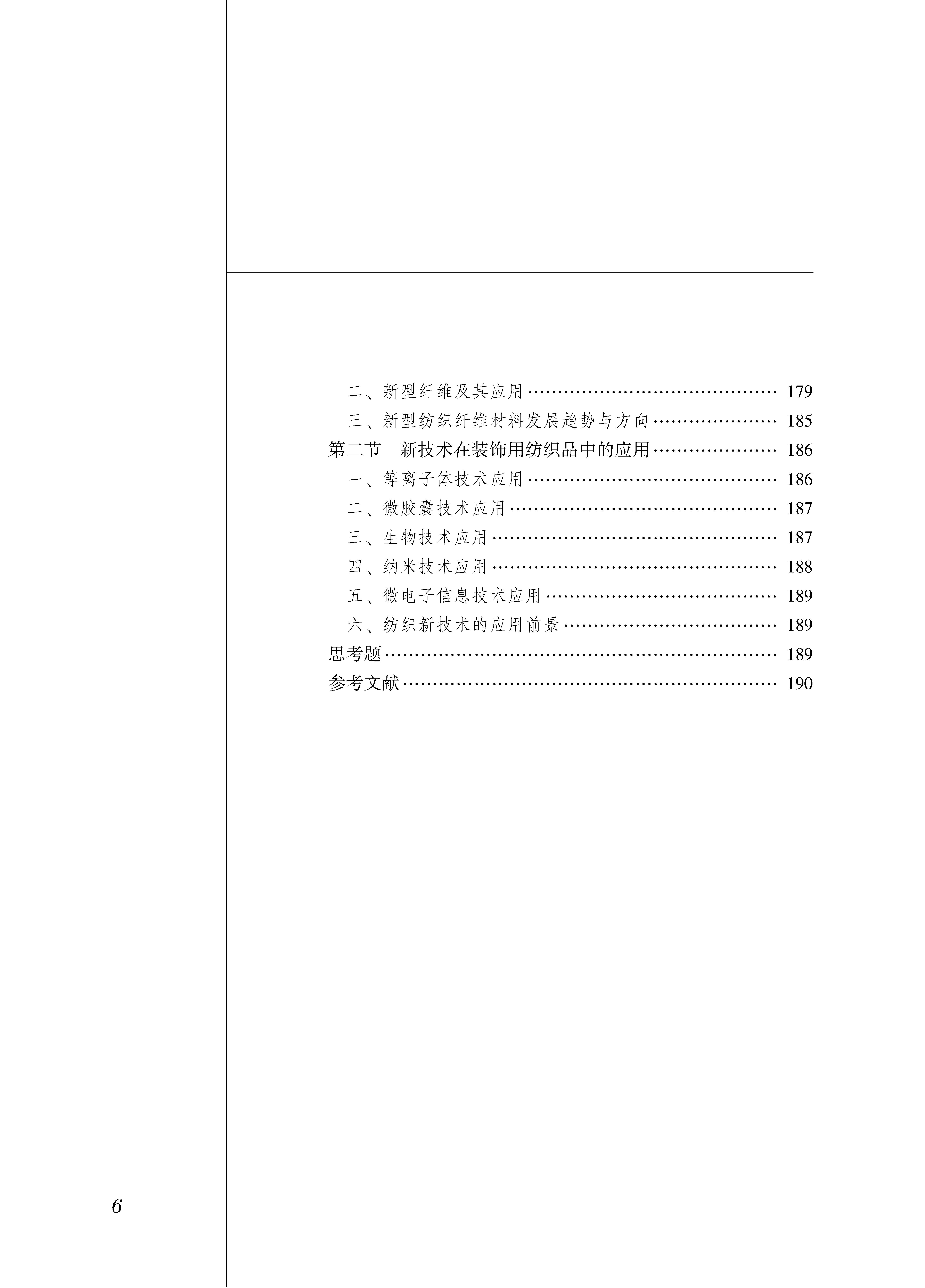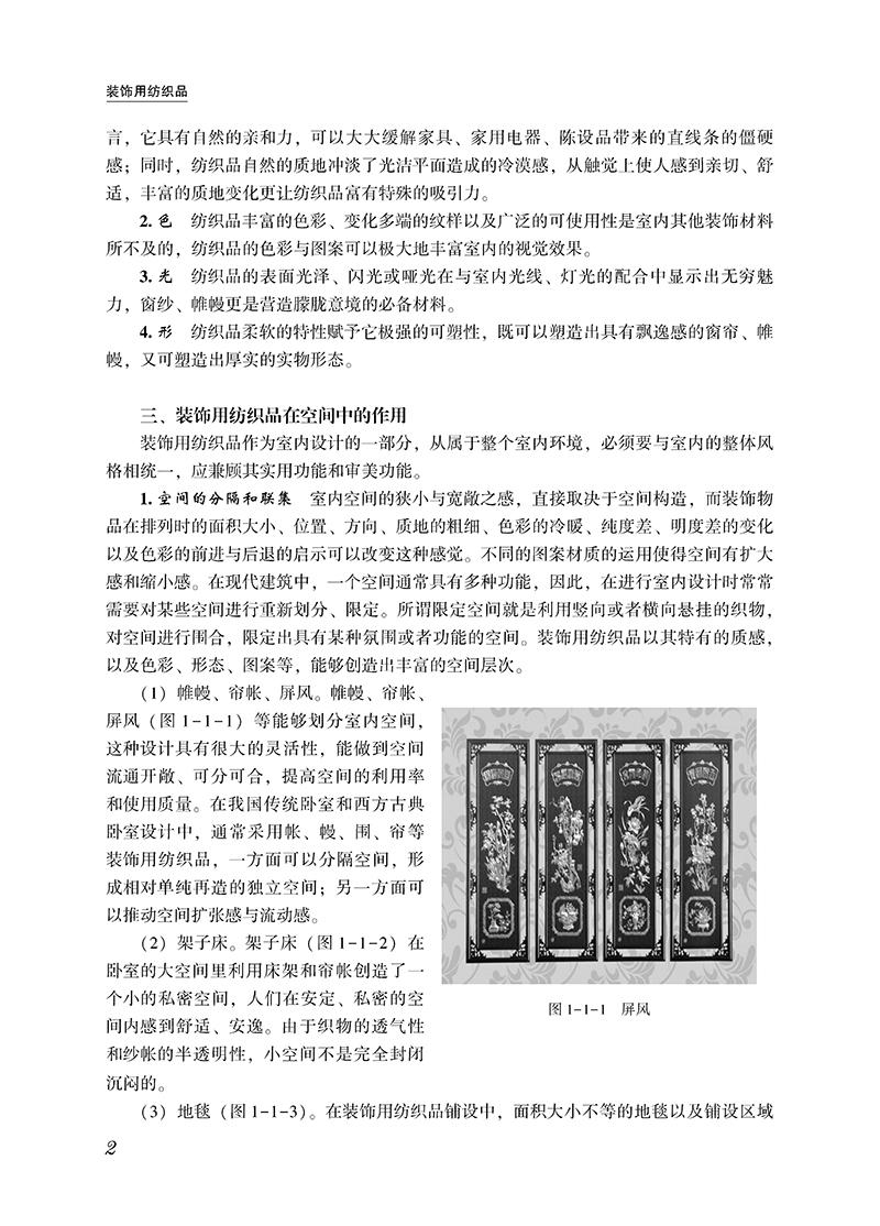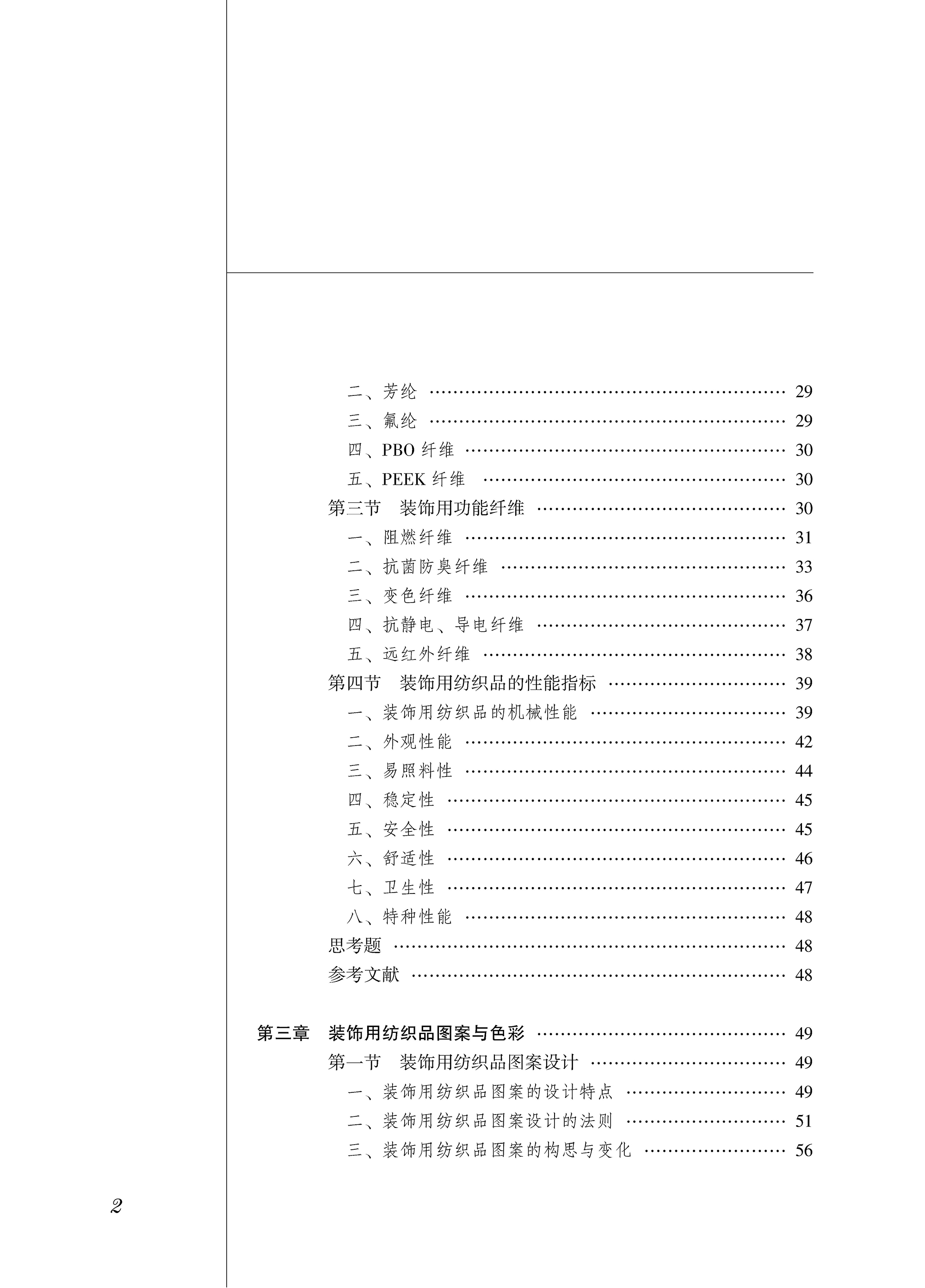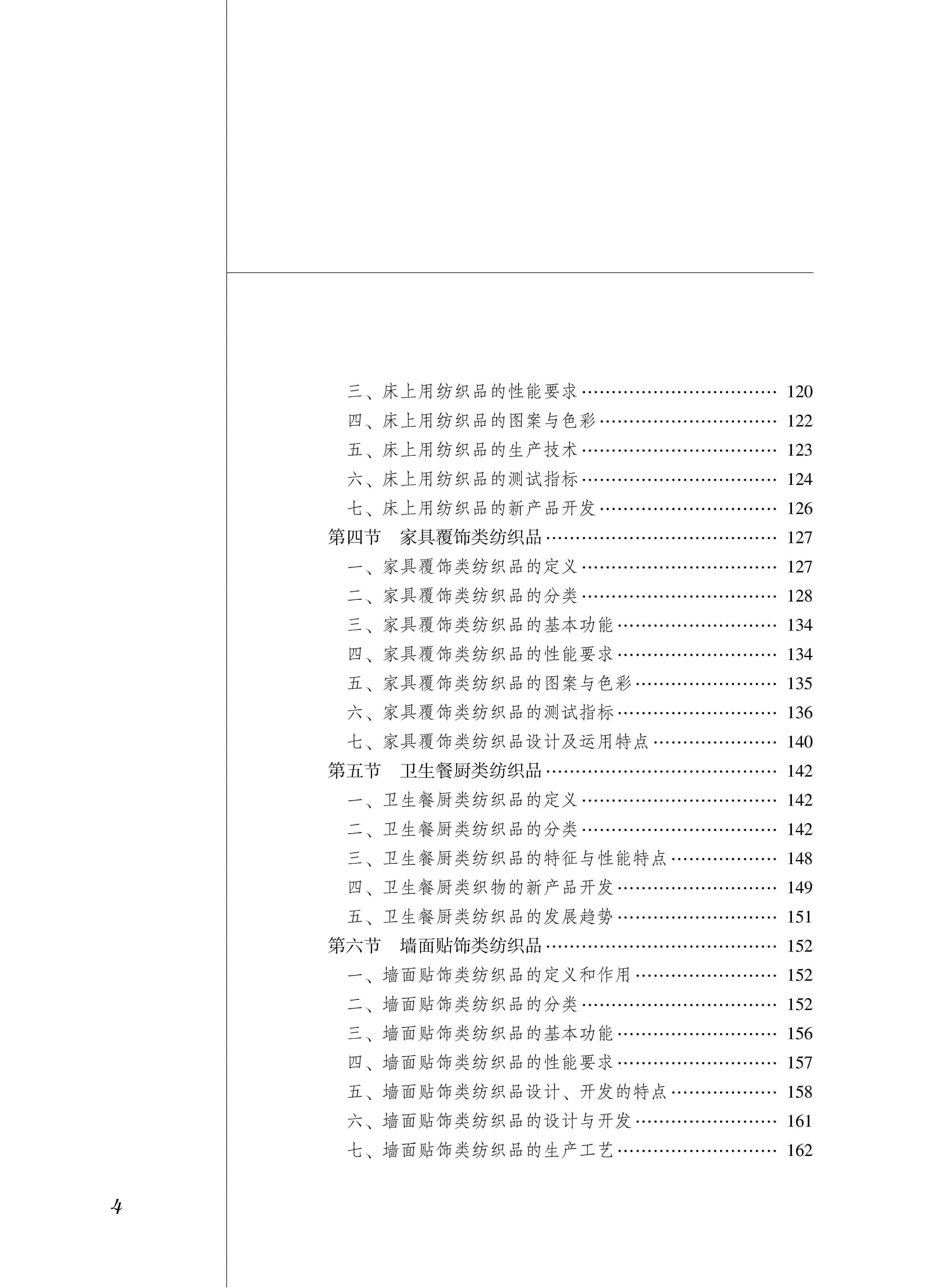 图案与色彩设计、产品开发、处理技术以及新纤维、新技术在产品开发方面的应用。同时按用途分类分别介绍了六大类装饰用纺织品, 如地面铺设类、挂帷遮饰类、床上用品类、家具覆饰类、卫生餐厨类和墙面贴饰类等纺织品的分类、基本功能与性能要求、图案与色彩设计特点以及产品开发趋势等。