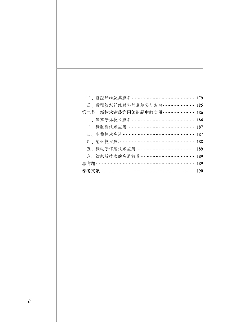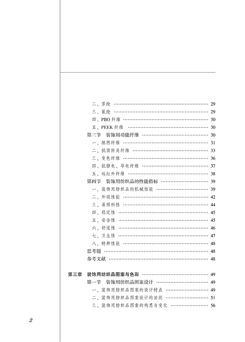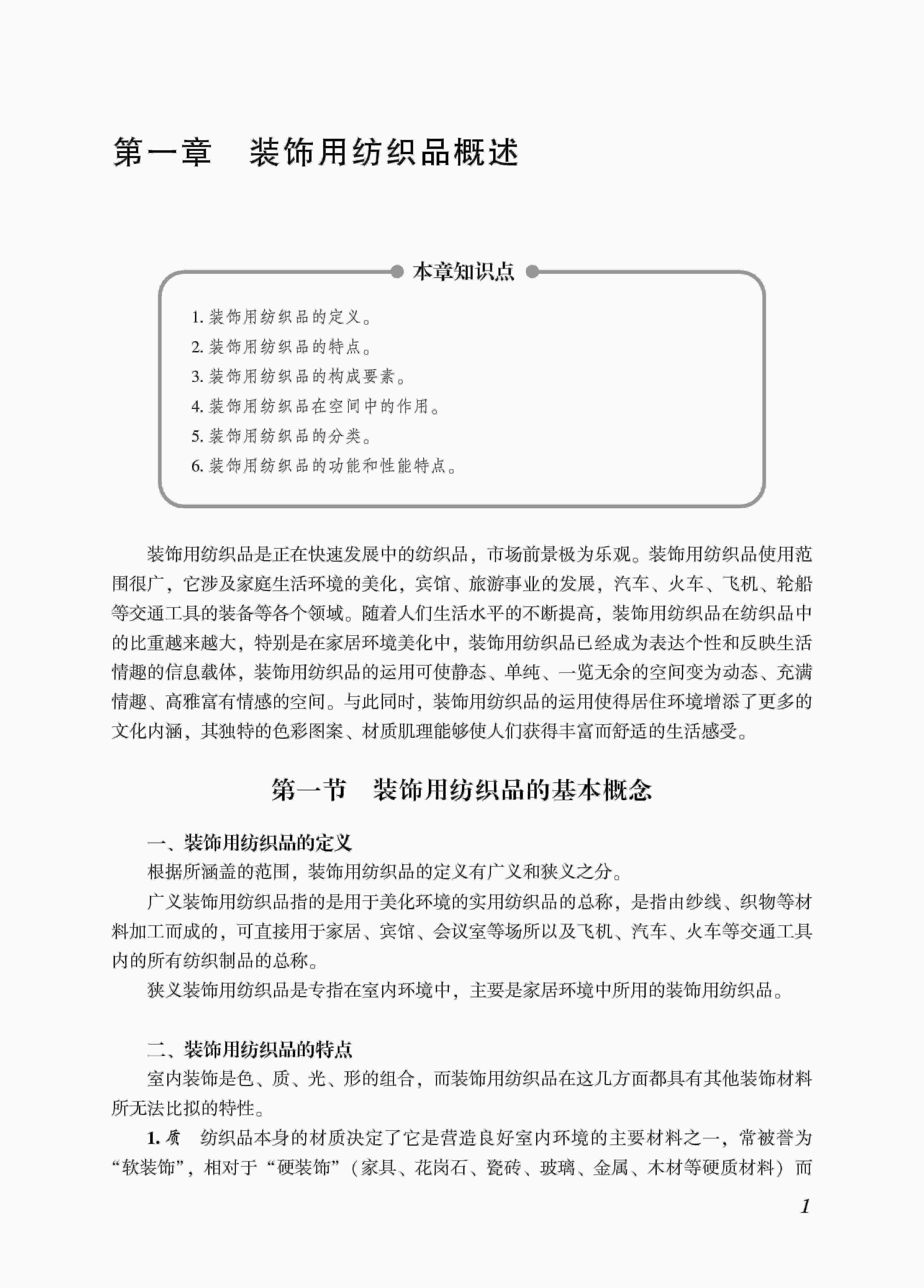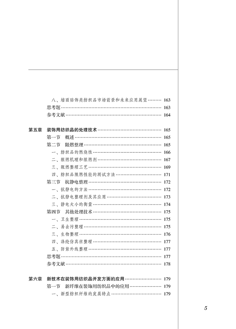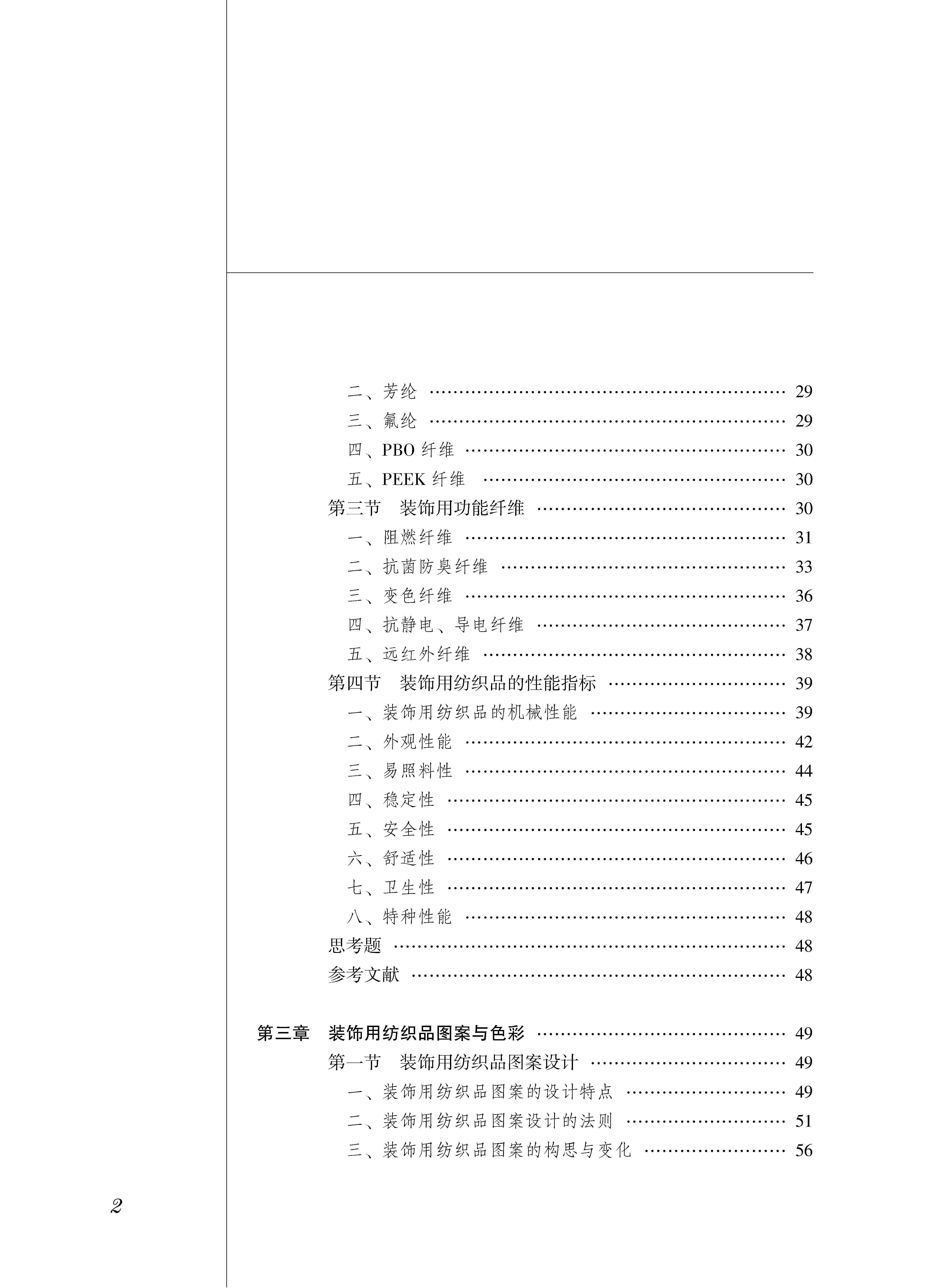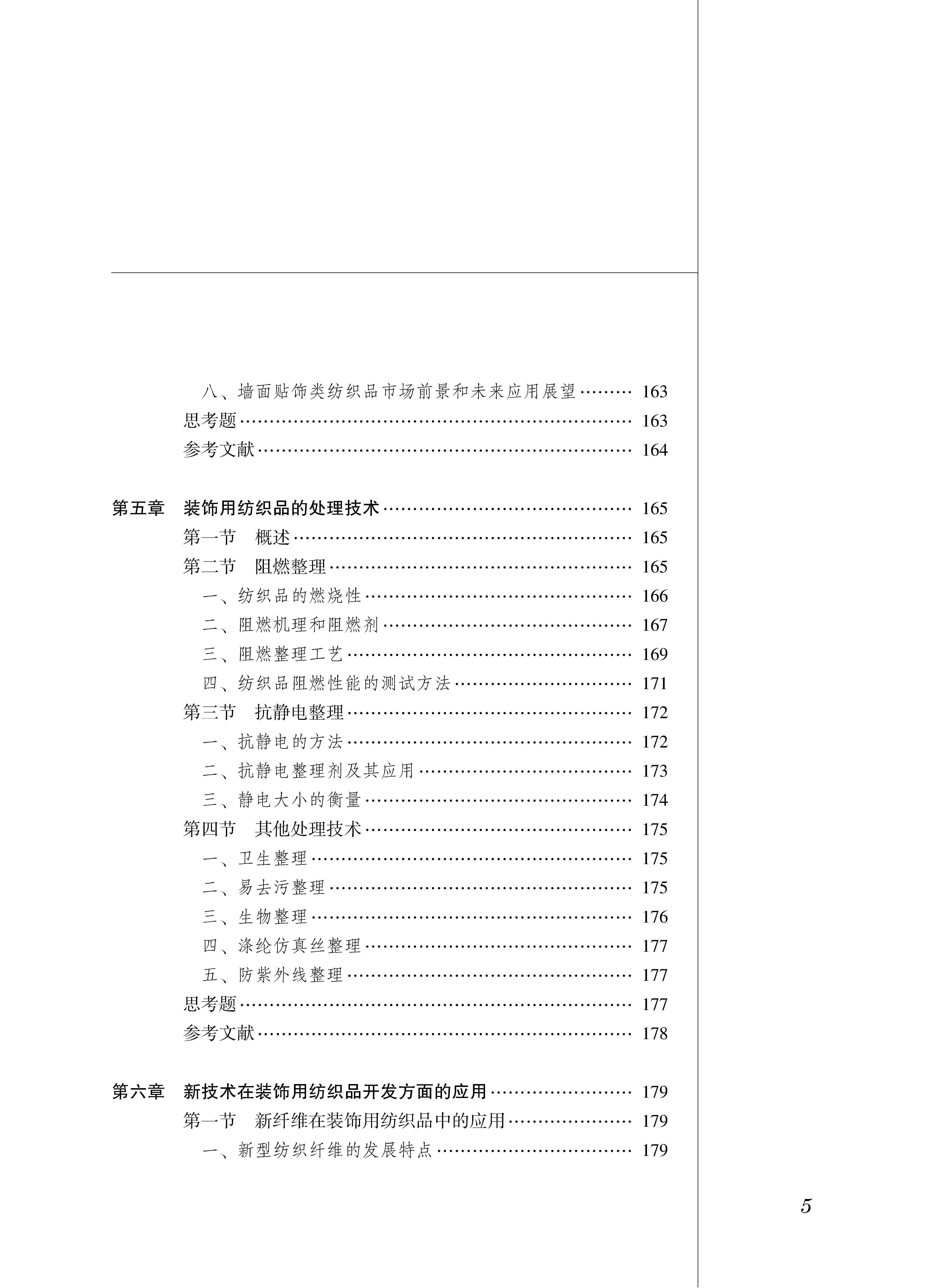 图案与色彩设计、产品开发、处理技术以及新纤维、新技术在产品开发方面的应用。同时按用途分类分别介绍了六大类装饰用纺织品, 如地面铺设类、挂帷遮饰类、床上用品类、家具覆饰类、卫生餐厨类和墙面贴饰类等纺织品的分类、基本功能与性能要求、图案与色彩设计特点以及产品开发趋势等。