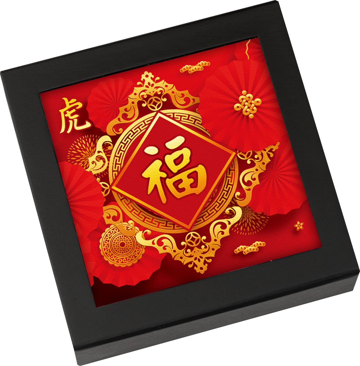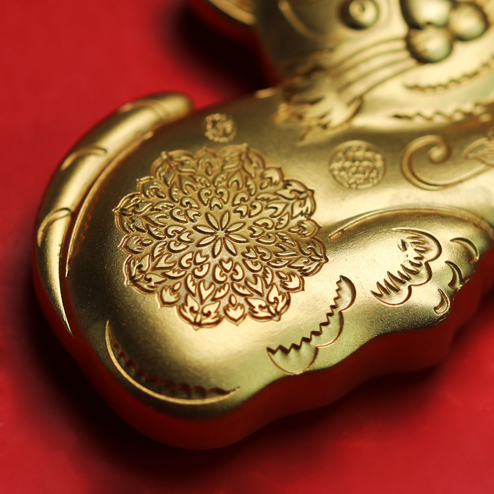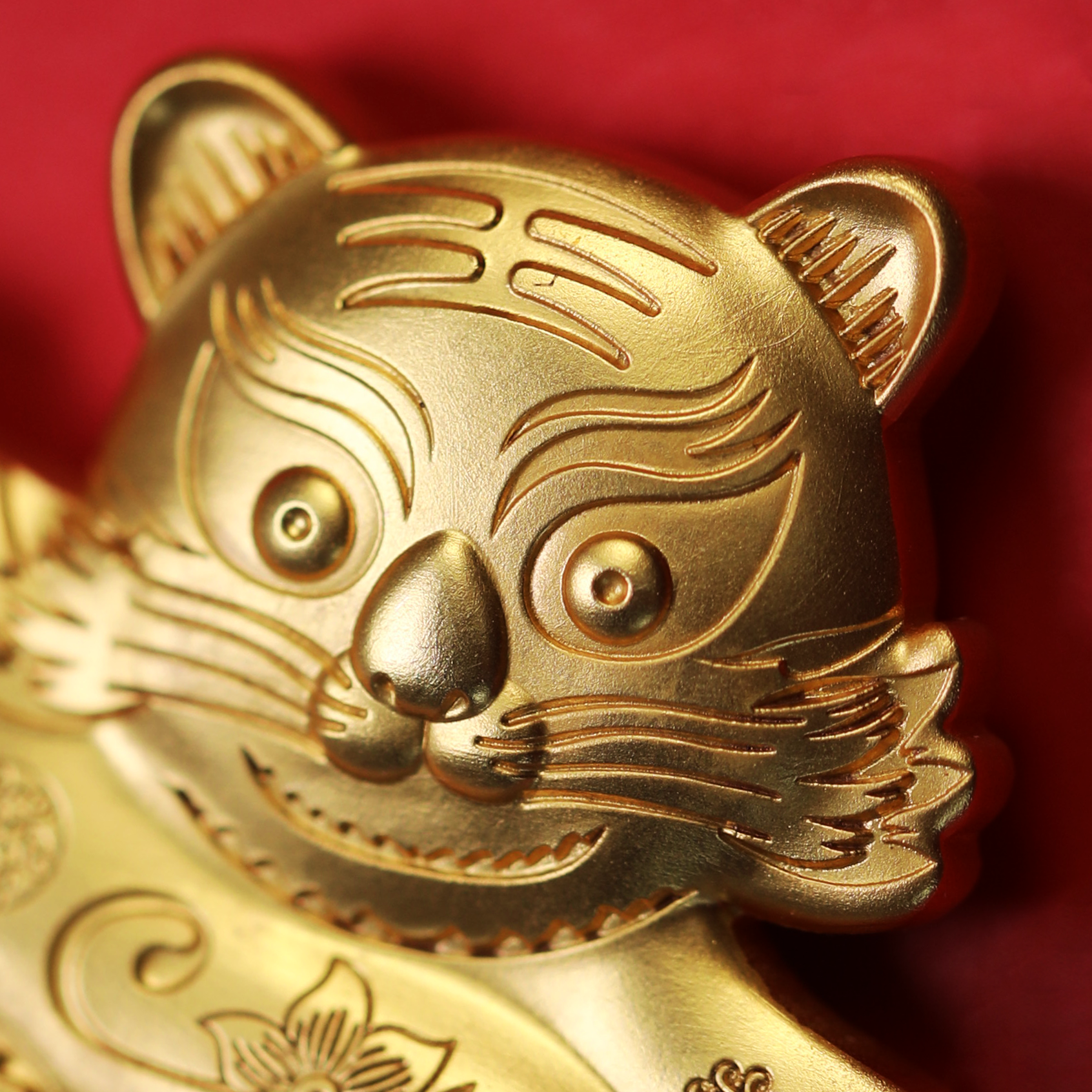 这枚币上的小老虎,设计超萌,而且融合了我国的剪纸文化,为了更好的表现剪纸,还采用了凹刻工艺。