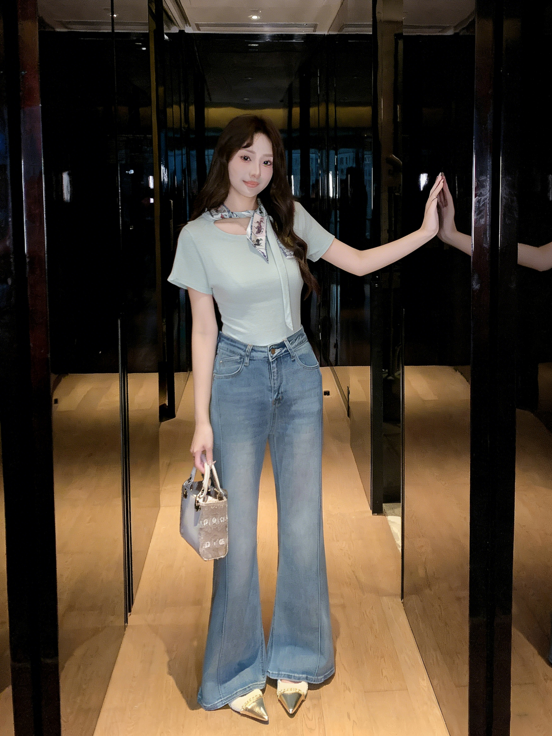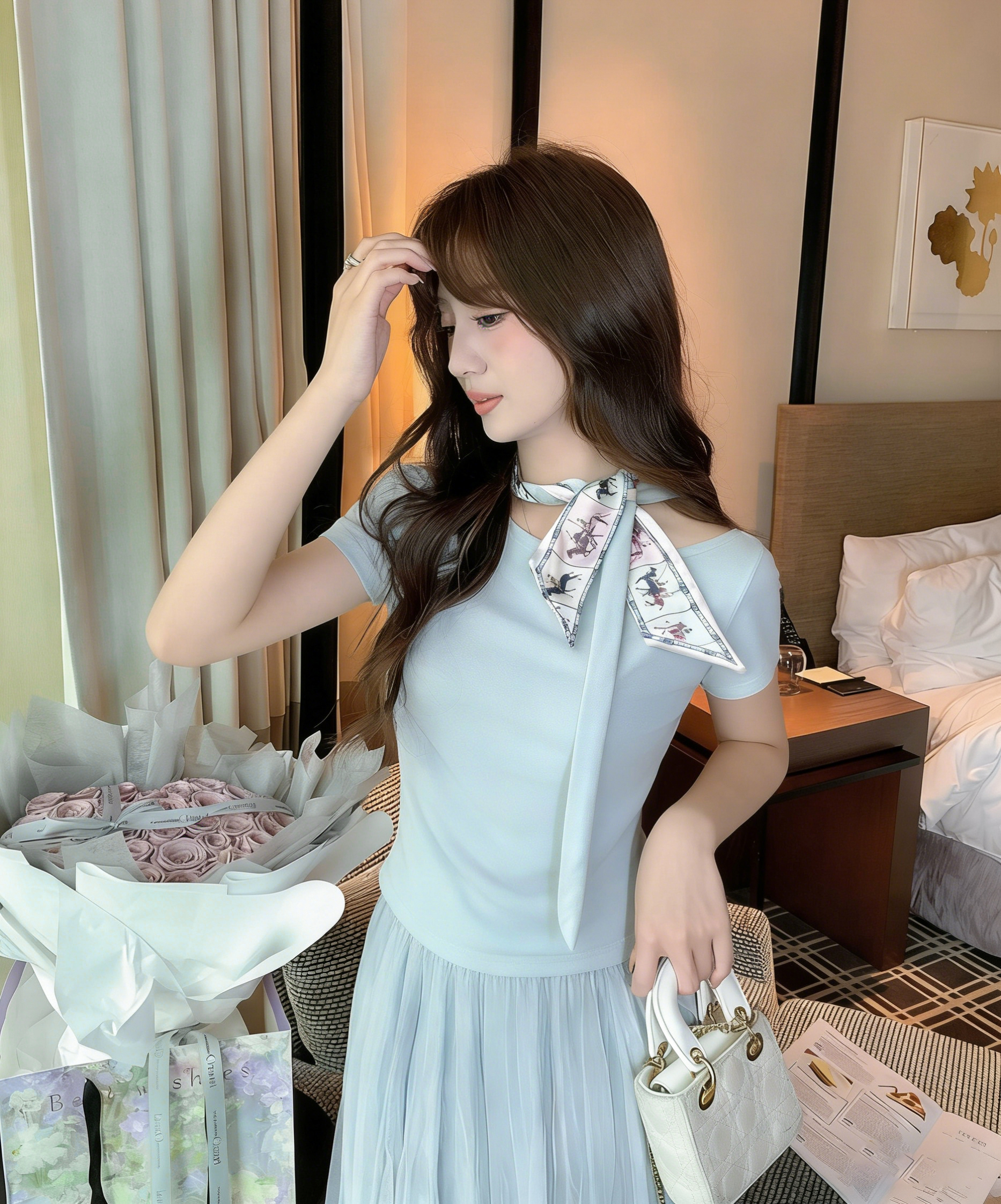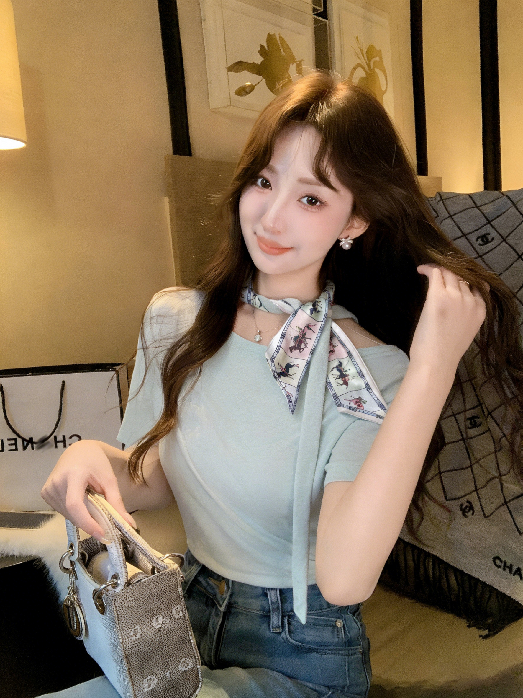 张心子【心动晚宴】多穿法时髦洋气斜肩钻链短袖T恤女夏新款上衣 U2603055