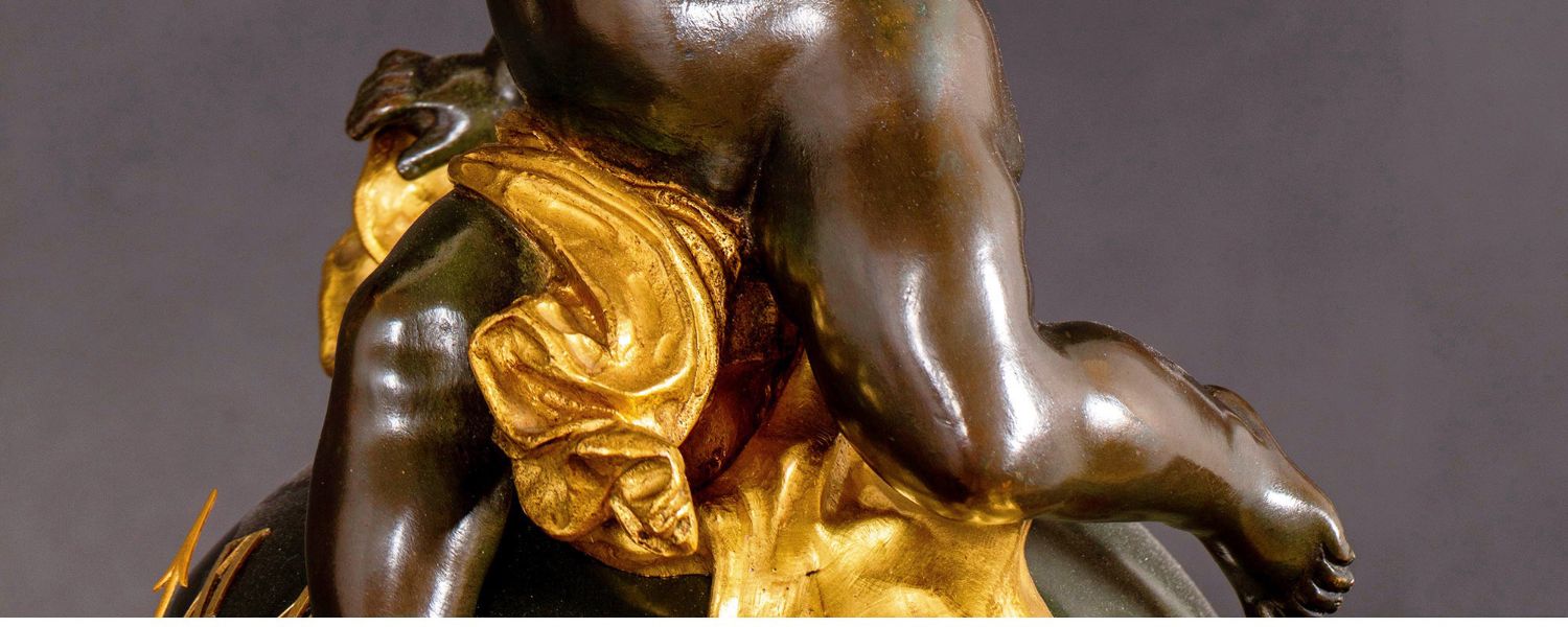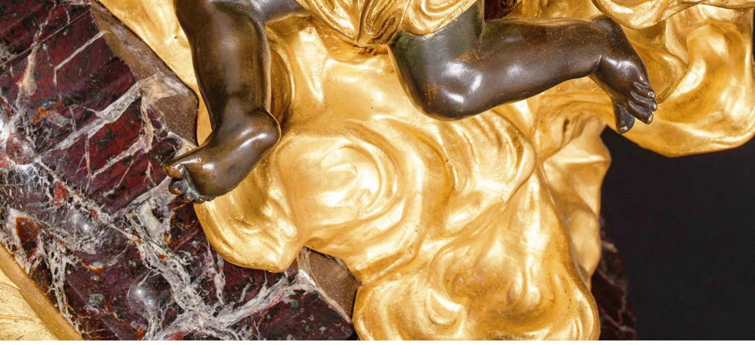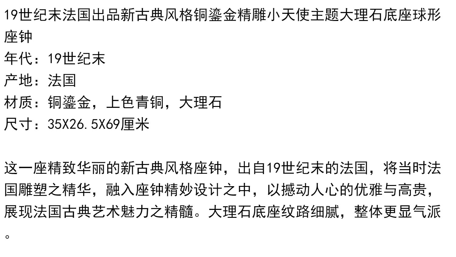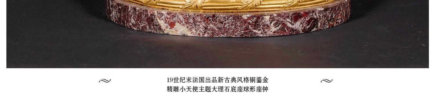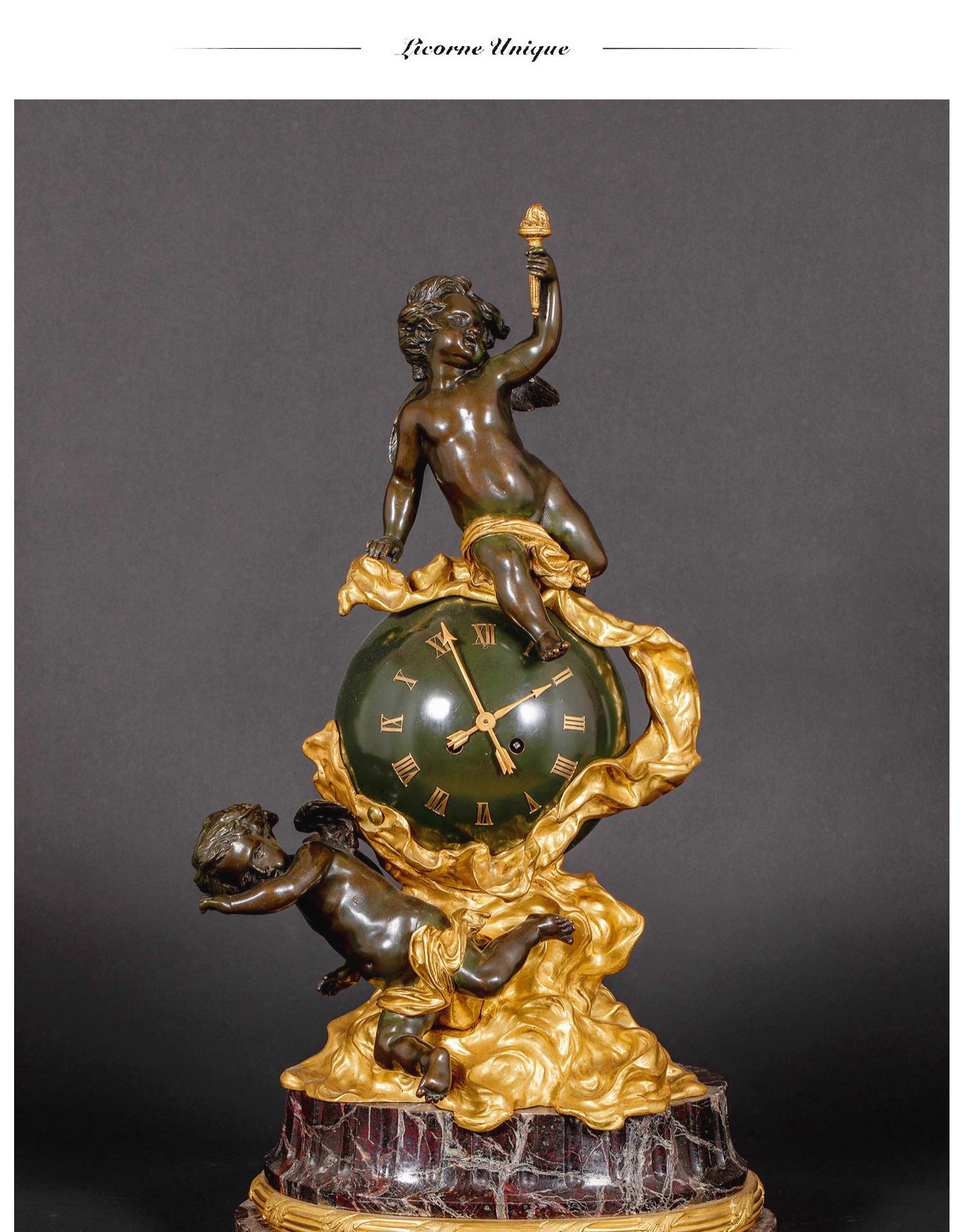 独角鹿西洋古董法国新古典风格铜鎏金小天使大理石底座座钟摆件