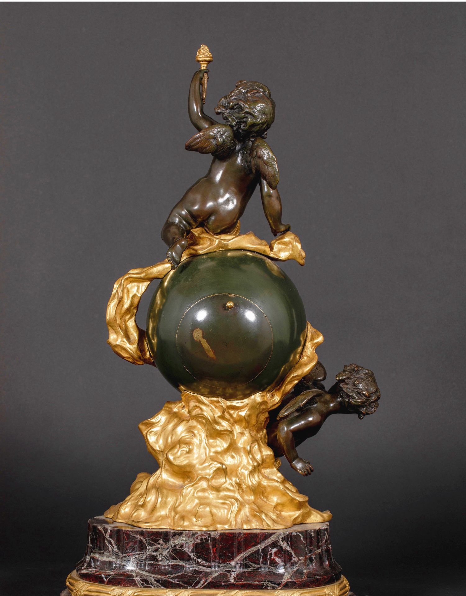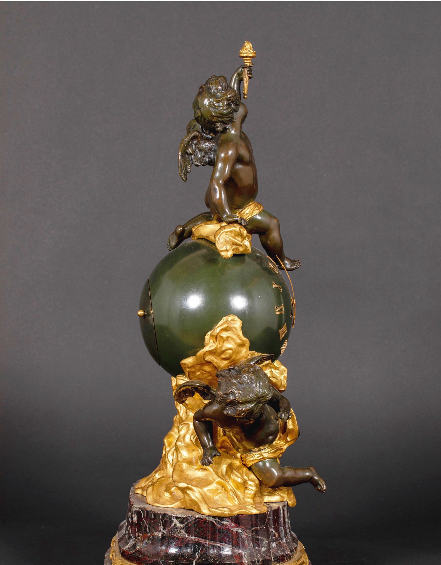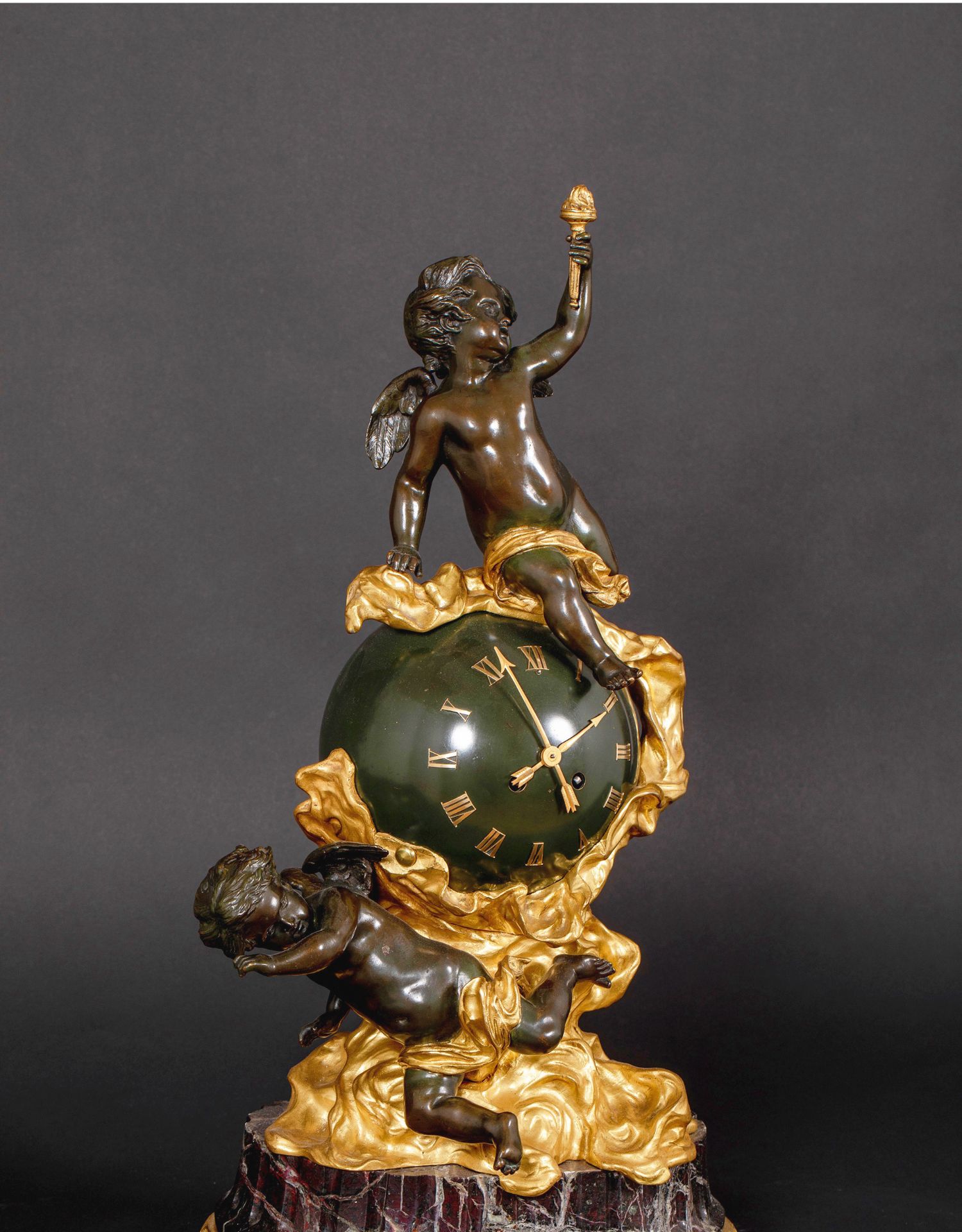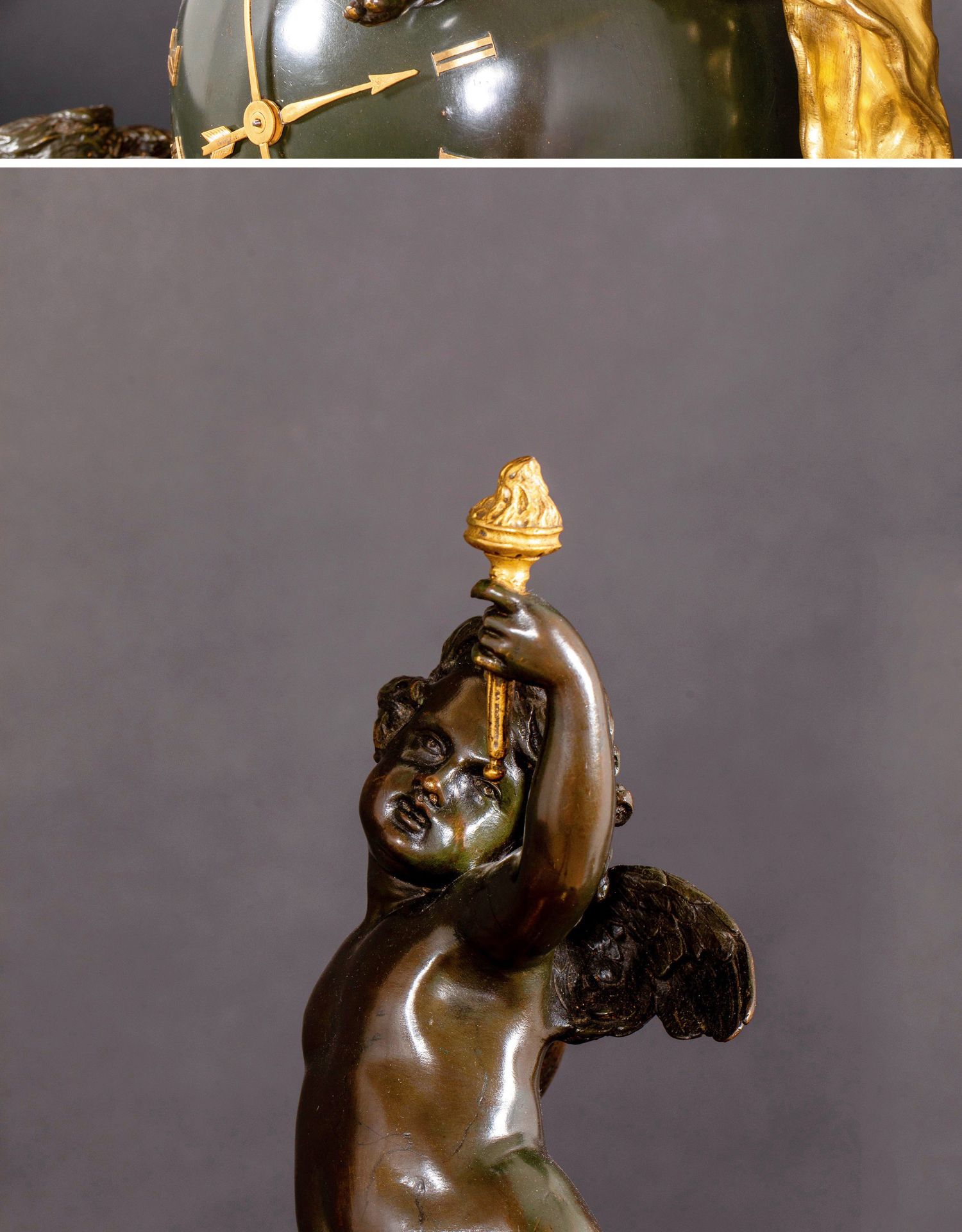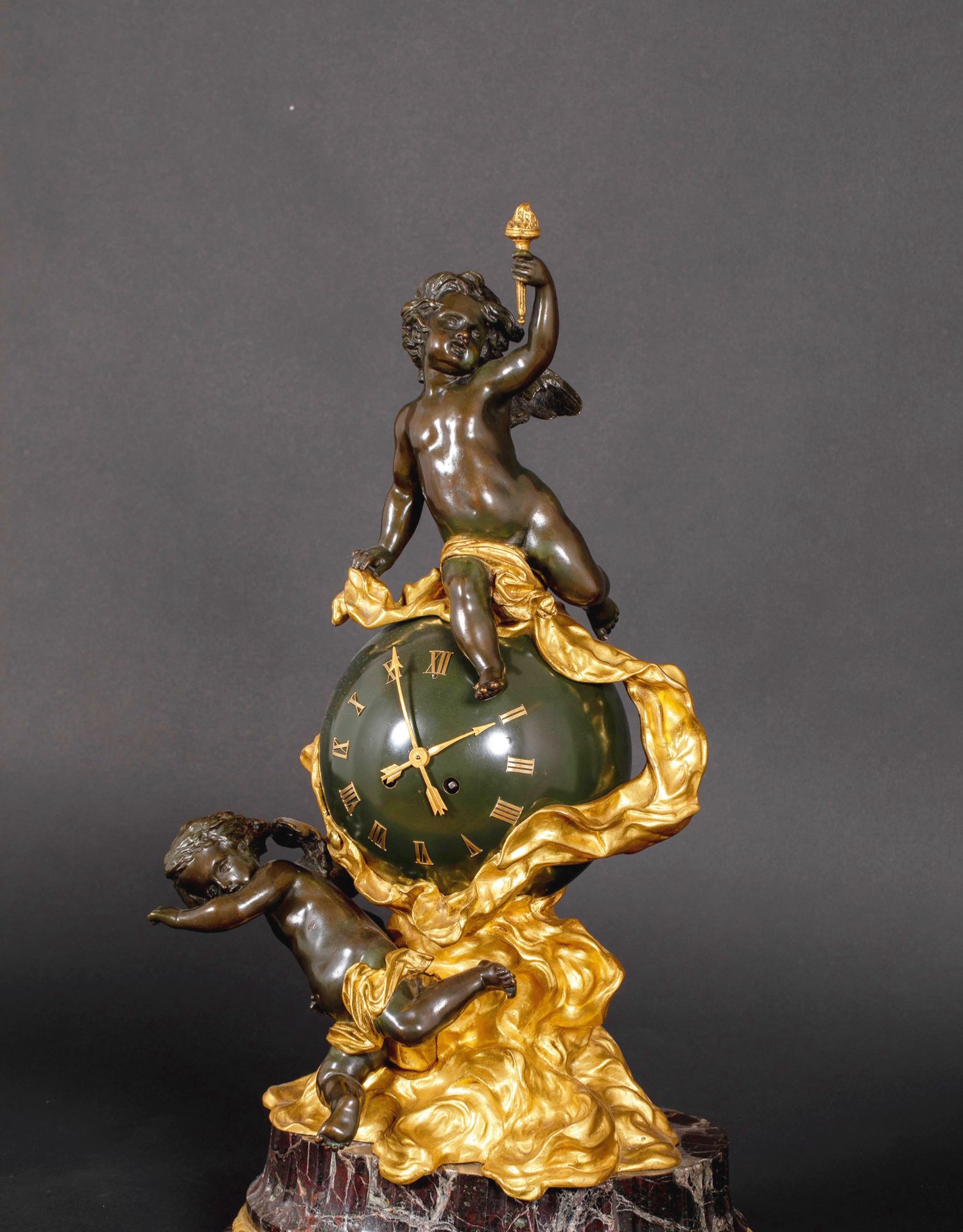 独角鹿西洋古董法国新古典风格铜鎏金小天使大理石底座座钟摆件