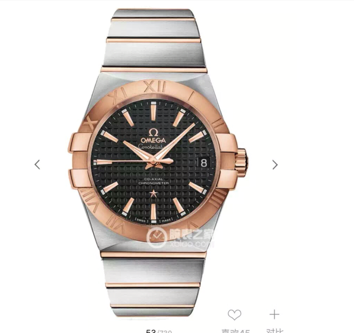 V6欧米茄星座系列123.20.38.21.52.002机械男士手表,大号38.5mm,小号35.5mm。精钢镀18k表链表壳,8500全自动机械机芯,蓝宝石镜面,具备诸多新颖设计元素。