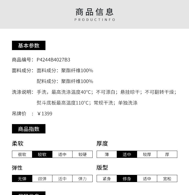 成熟、稳重、高贵典雅、大方得体 融合东方文化的含蓄和法国的浪漫 将创意的艺术性与消费需求相结合 为自信女性塑造高品质场合服装