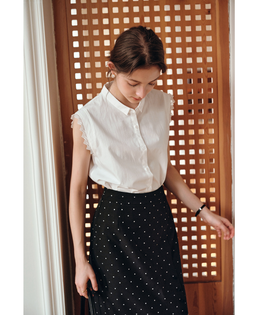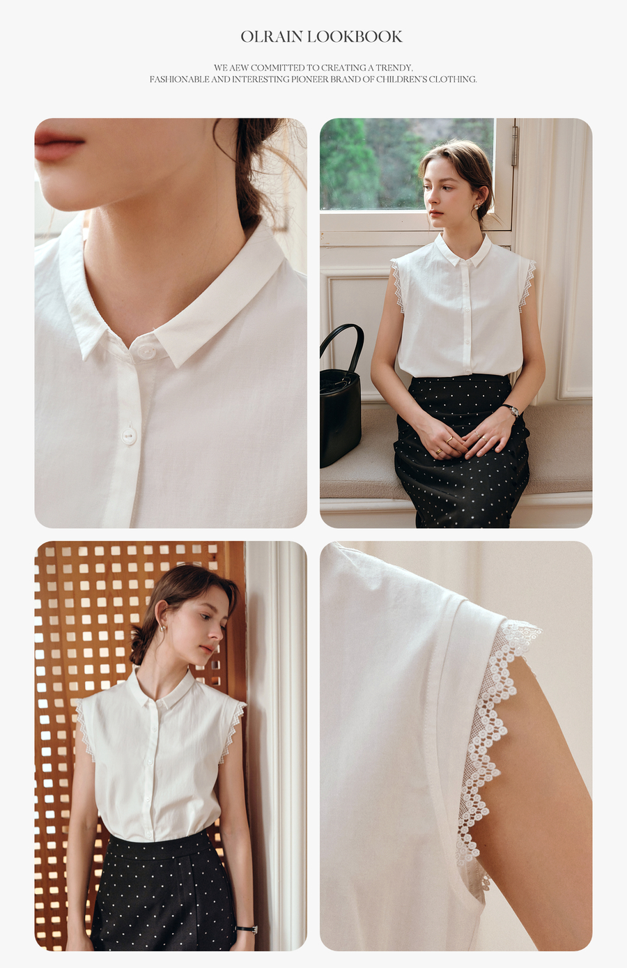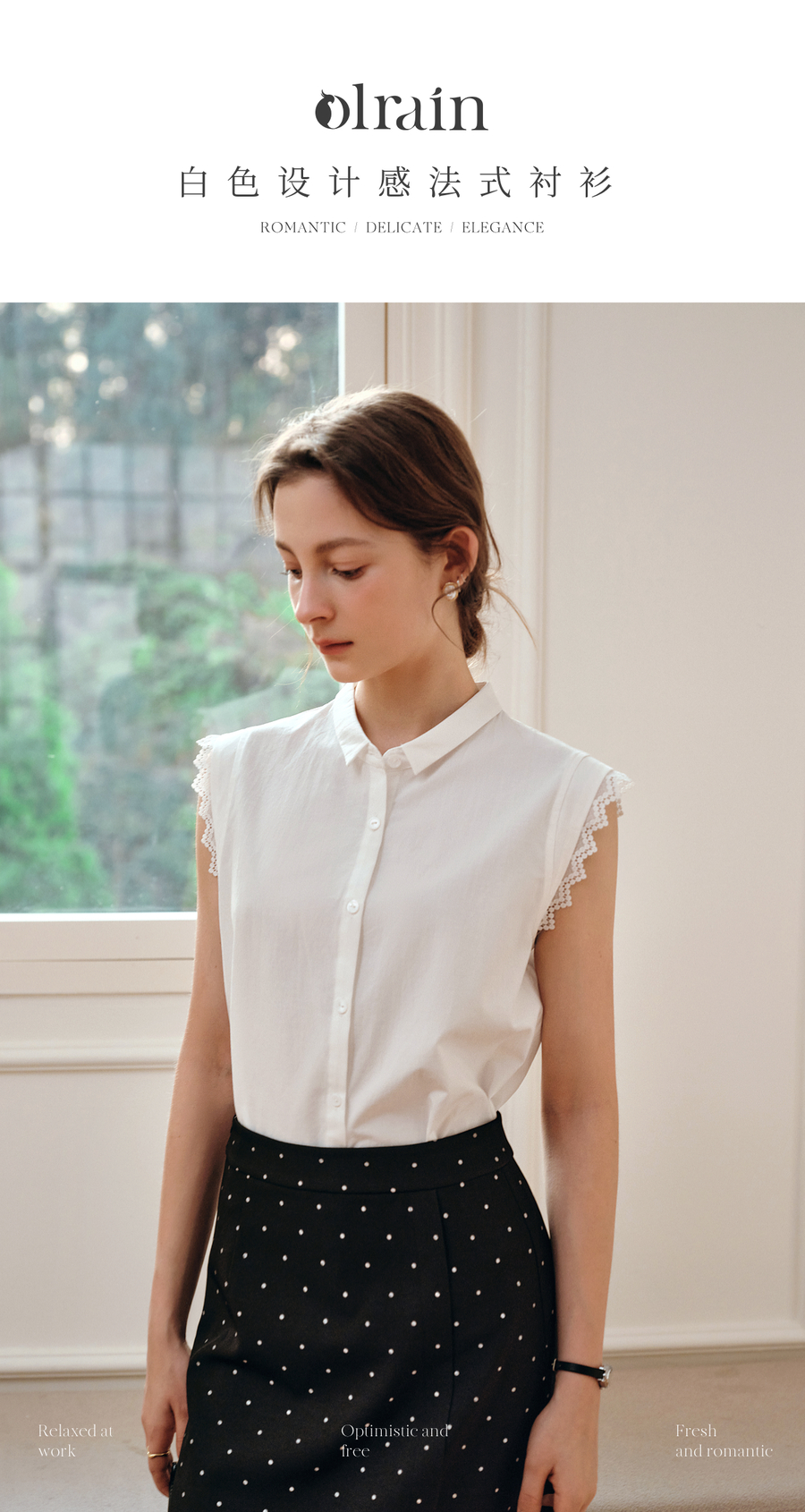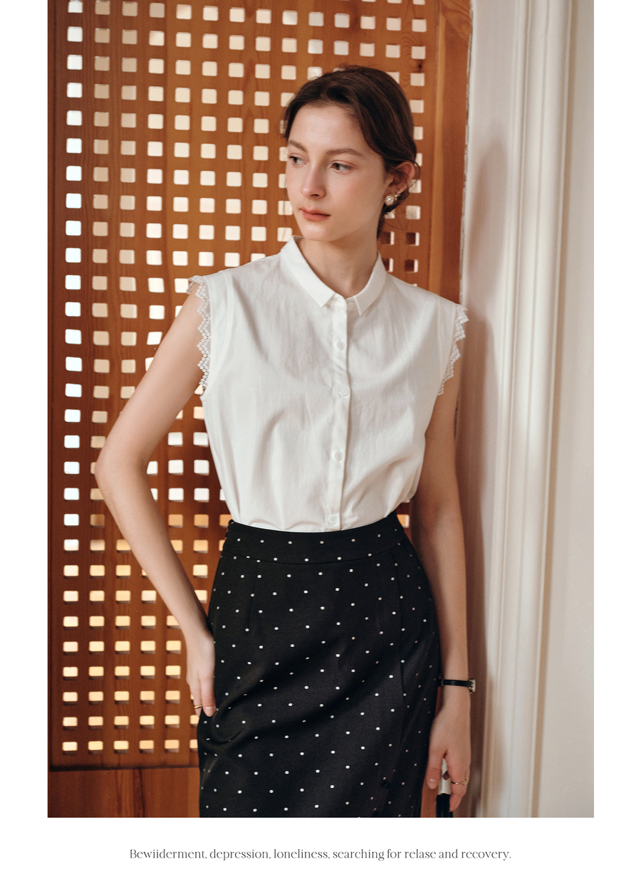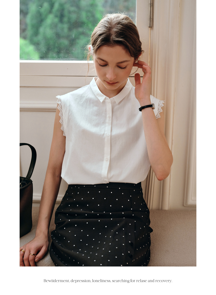 OLrain欧芮儿白色设计感衬衫女夏季2025新款翻领蕾丝拼接无袖上衣