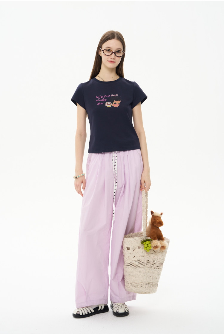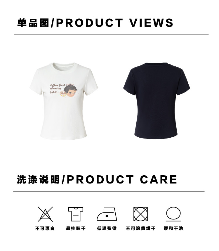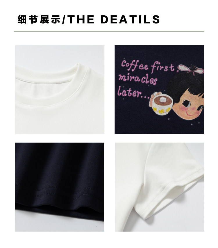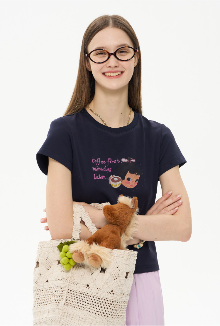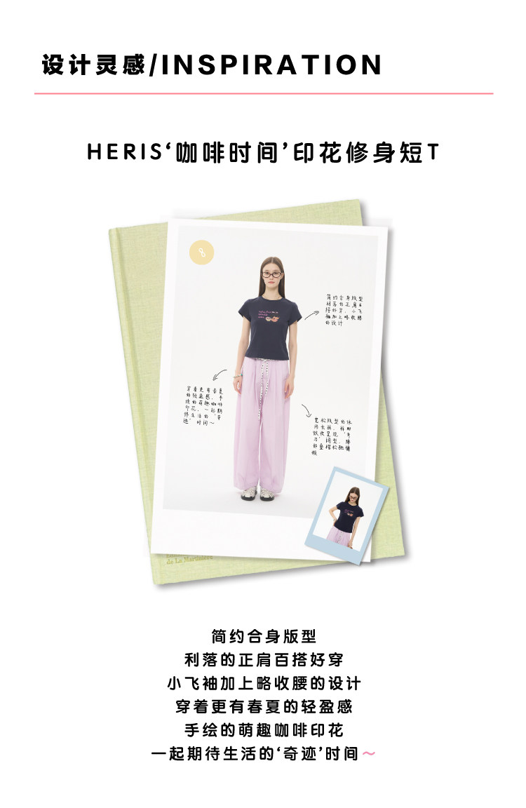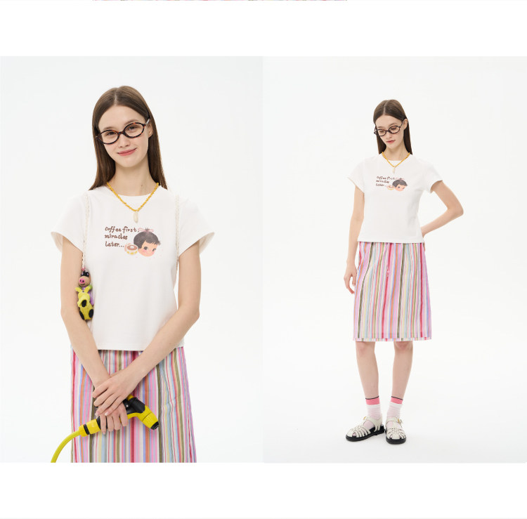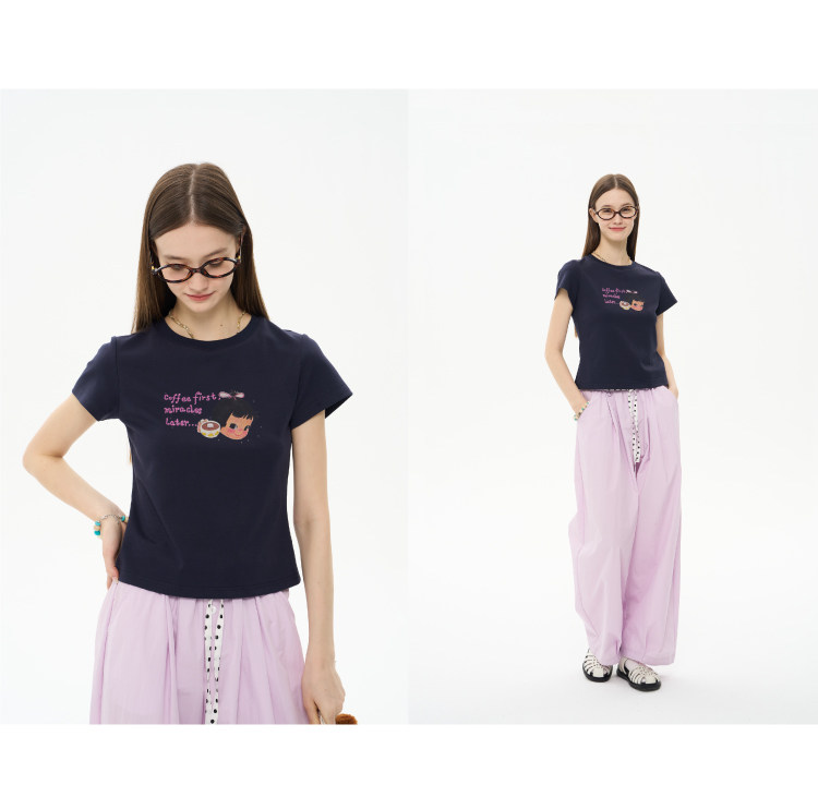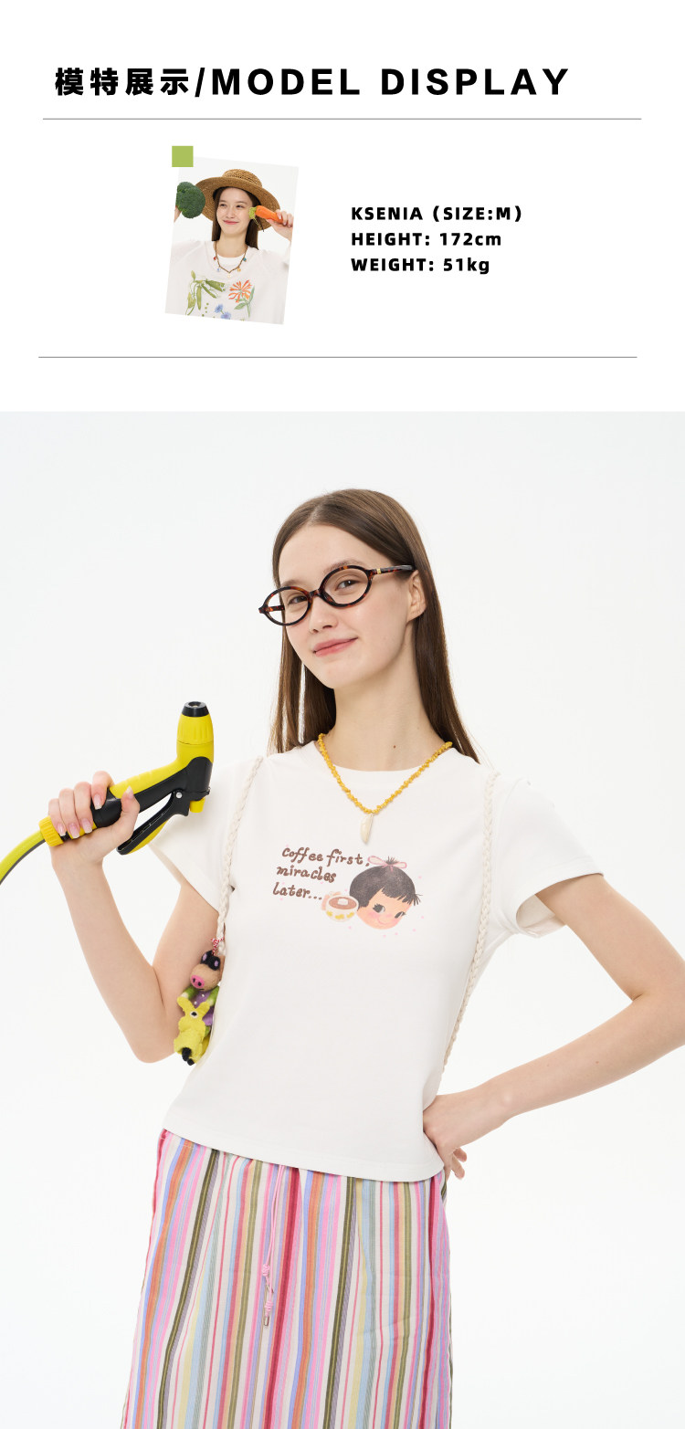 heris/H61127/“咖啡时间”卡通小人印花 圆领正肩修身显瘦舒适短袖T
