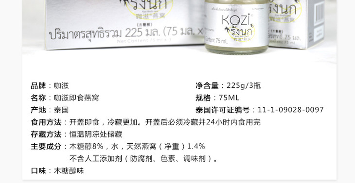 【一般贸易】泰国咖滋KAZI即食燕窝冰糖燕窝泰国进口燕窝手工挑毛225g/3瓶