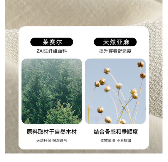 精选莱赛尔亚麻混纺面料,保留了亚麻的自然质感, 还拥有莱赛尔的柔软透气性,给你顺滑触感新体验。